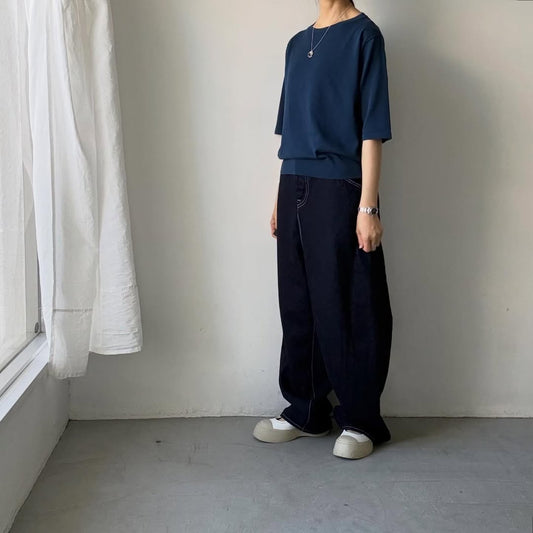 homspun ソフトコンパクトヤーン5分袖ニットプルオーバー アイアンブルー