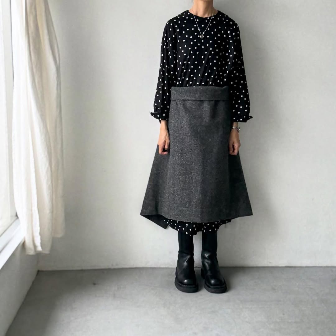 エプロンスカートとして使う際には中にパンツ、スカート、ワンピースを入れて。前後どちらにしても使えます。