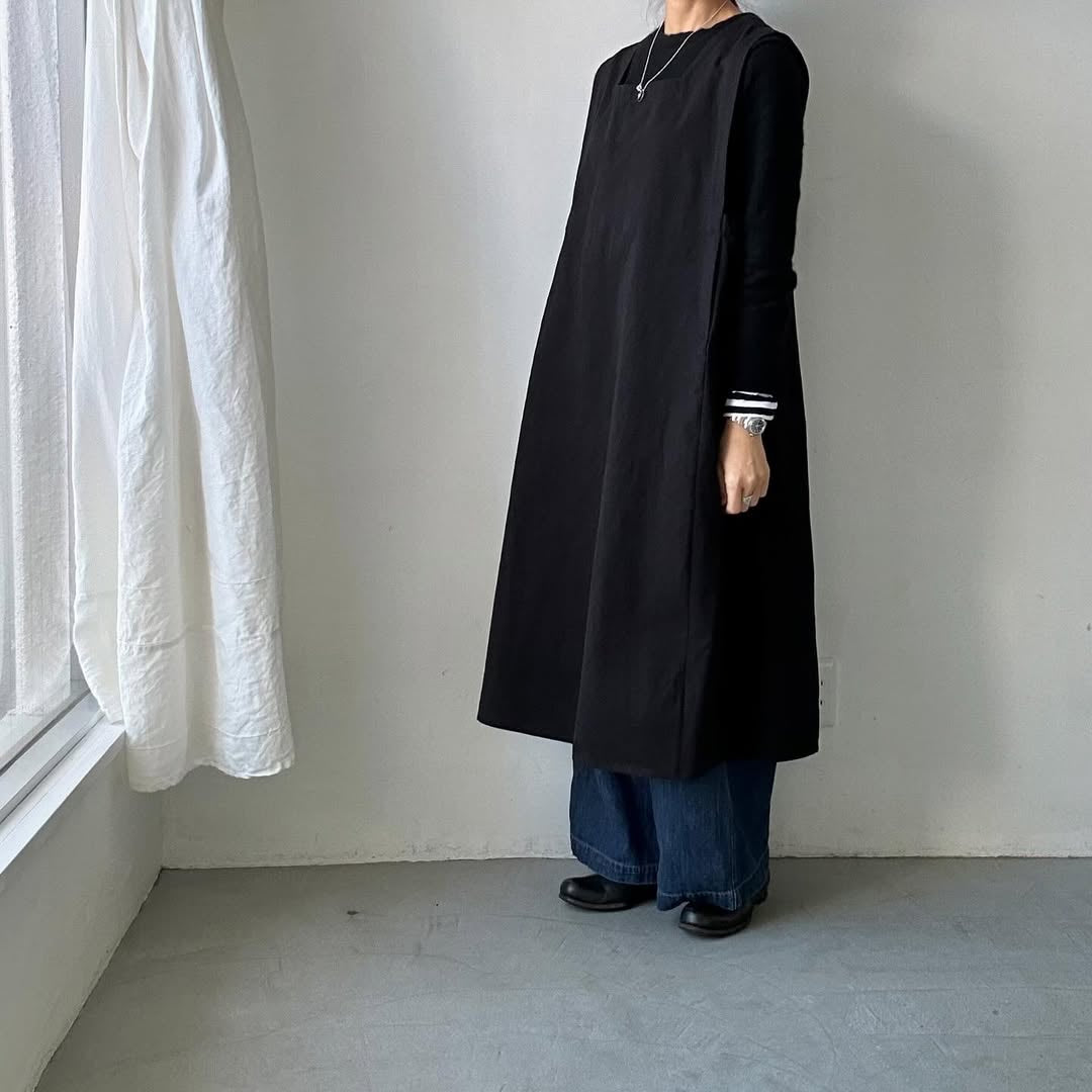エプロンワンピースみたいな形で体型を選ばず着ていただけます。