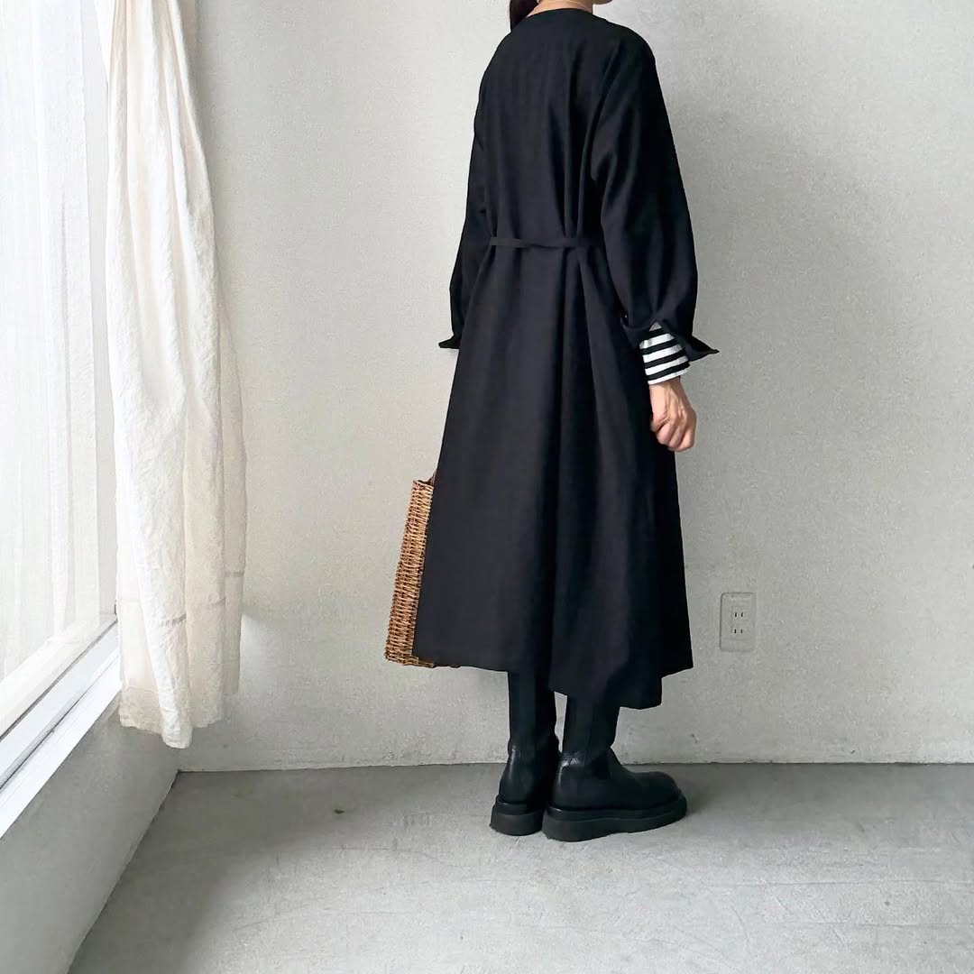 前はボタンで全開するので軽いコートのようにも使えるワンピース。比翼仕立てなのでボタンが見えずにすっきりしています。
