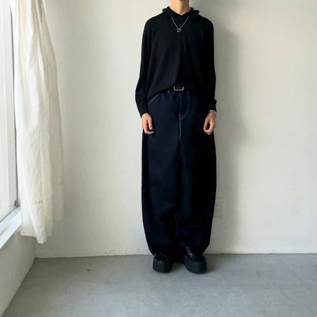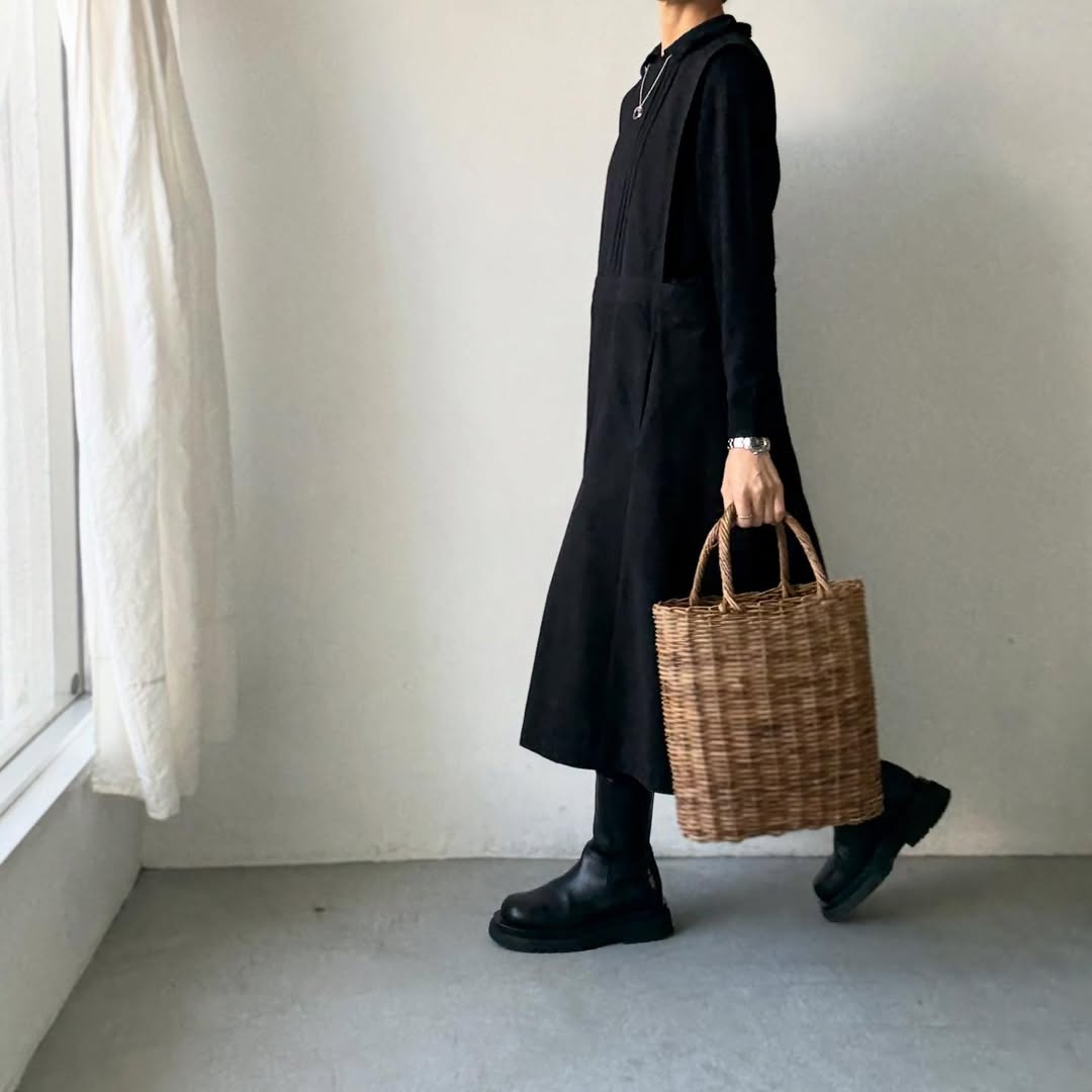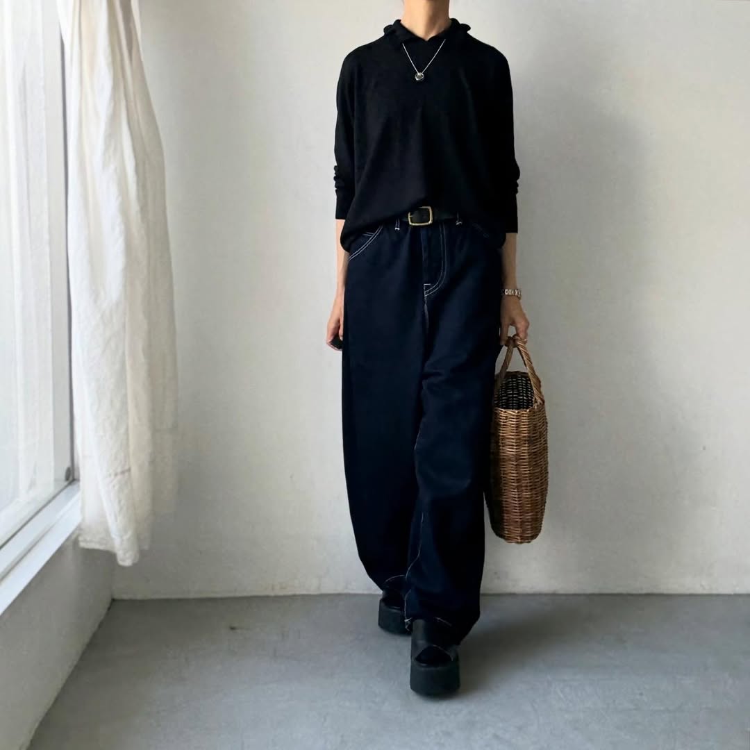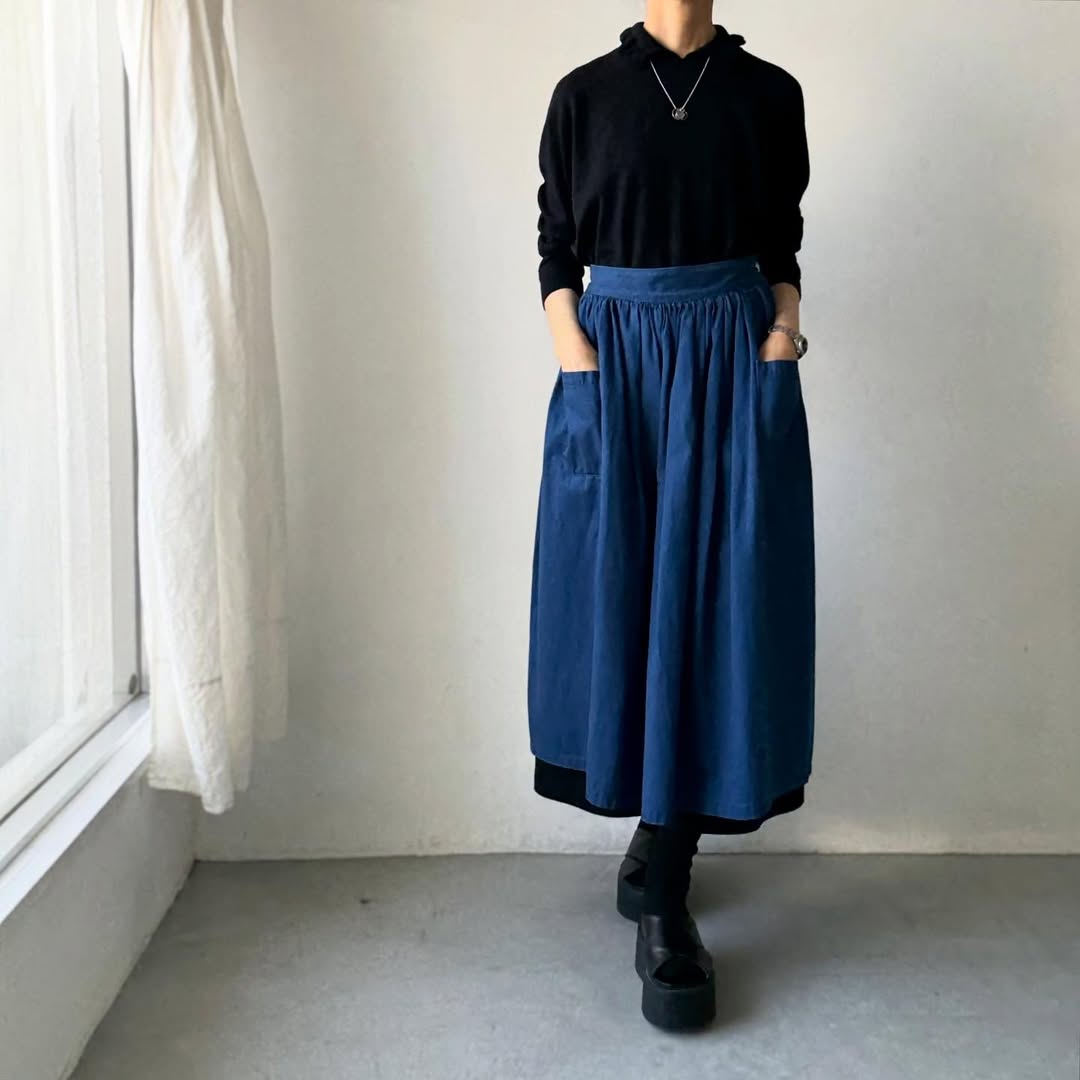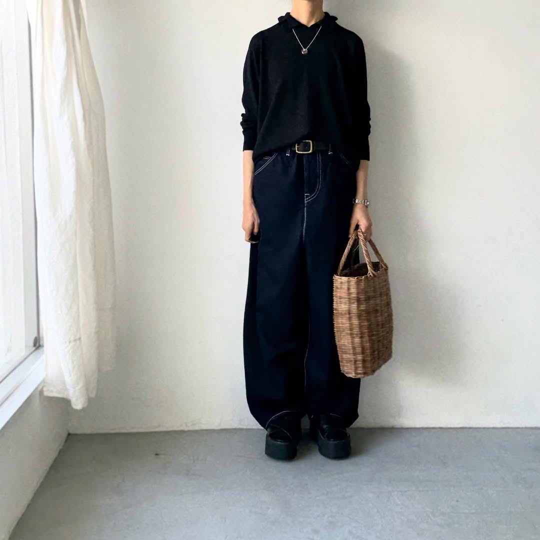 体の線を拾わない程良いゆとりのあるシルエットとやや短めの丈感です。体型を選ばずご着用いただけます。