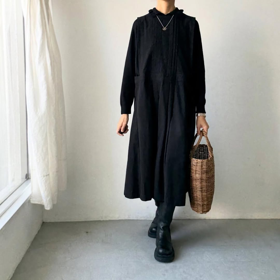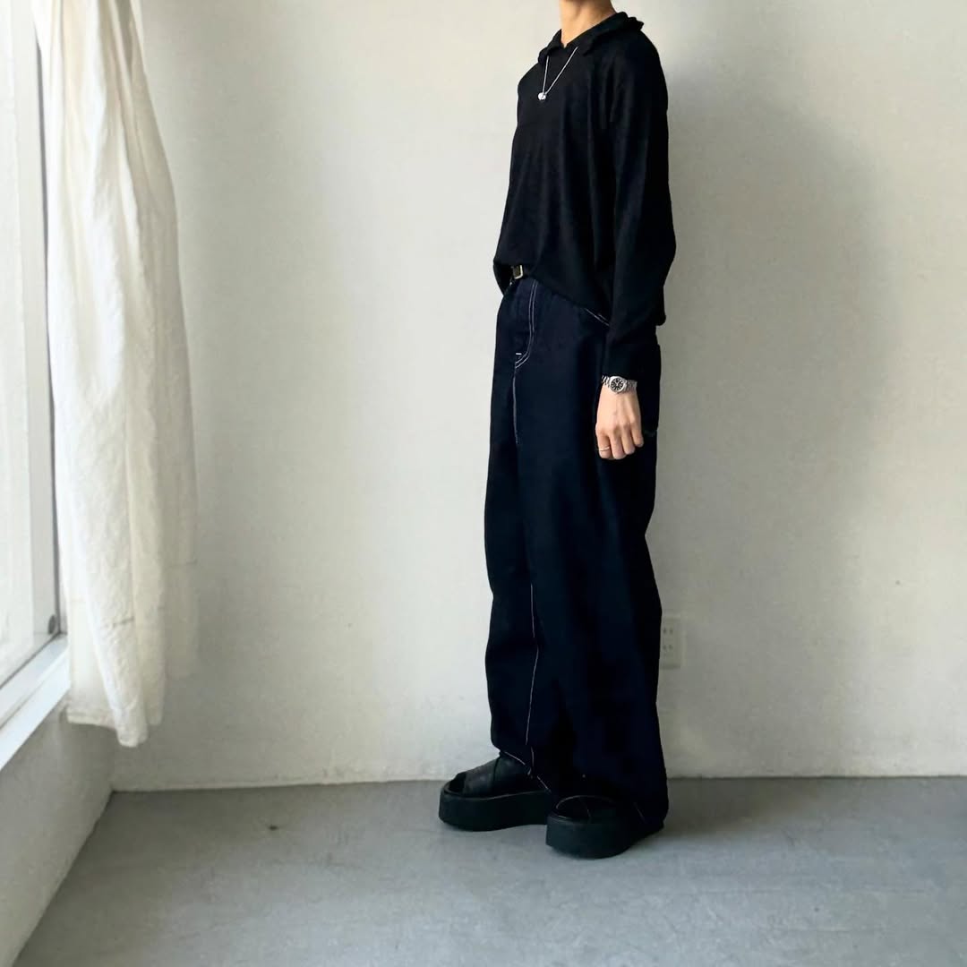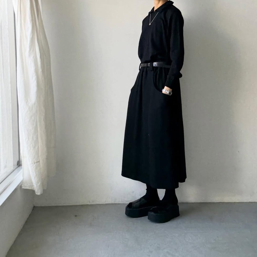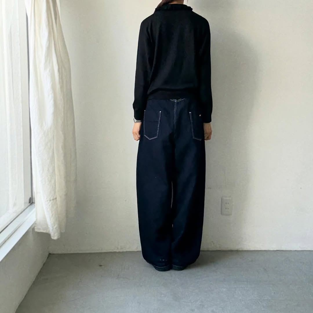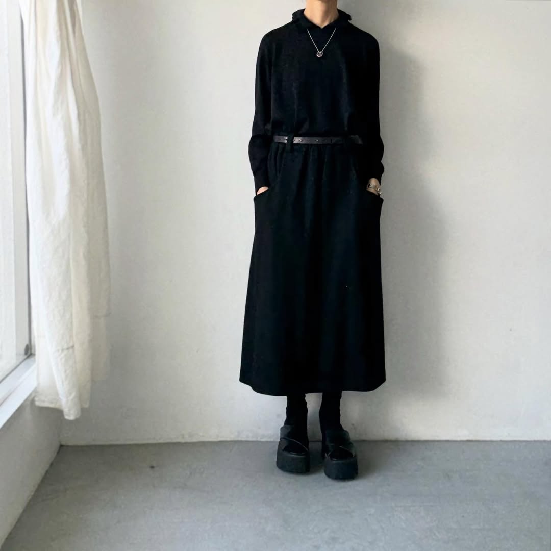 体の線を拾わない程良いゆとりのあるシルエットとやや短めの丈感です。体型を選ばずご着用いただけます。