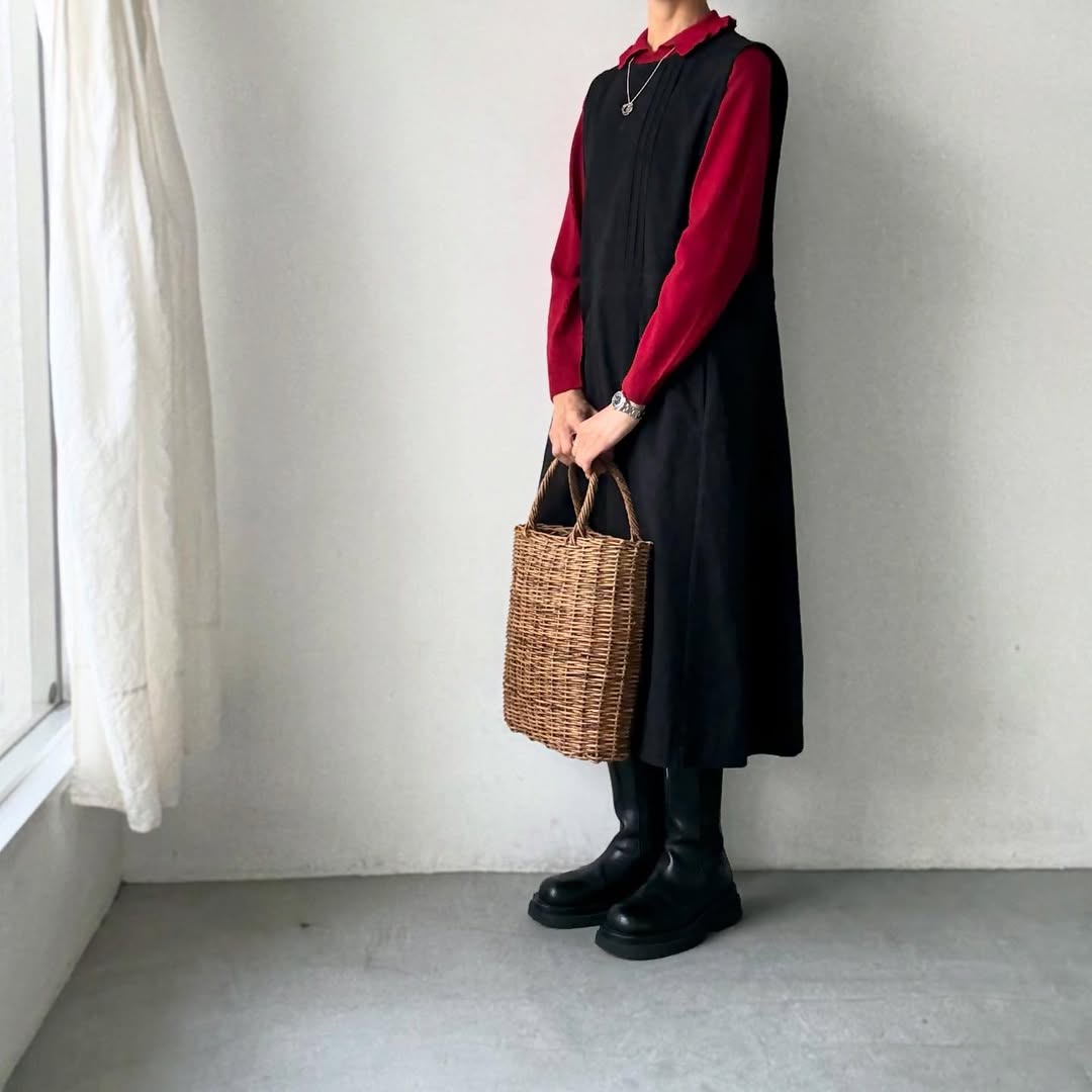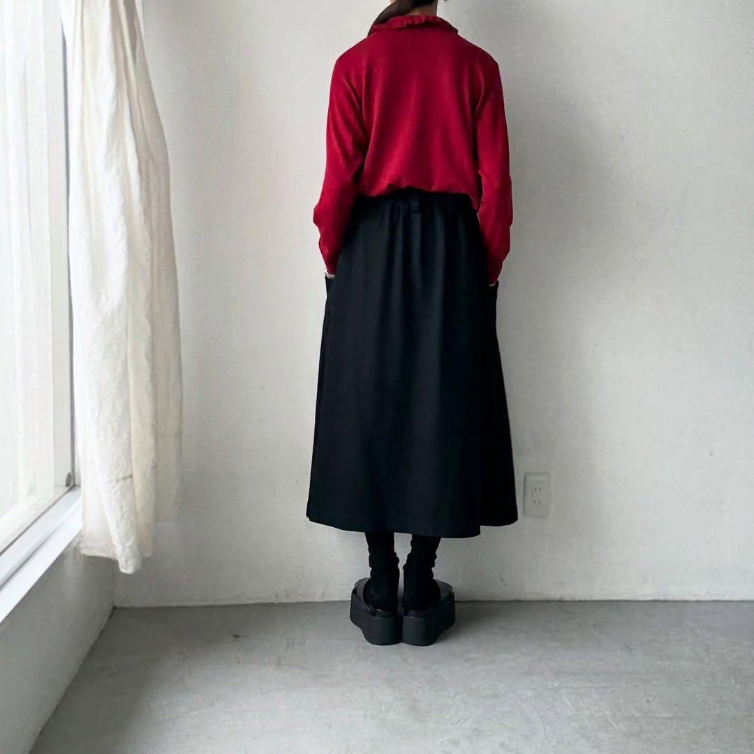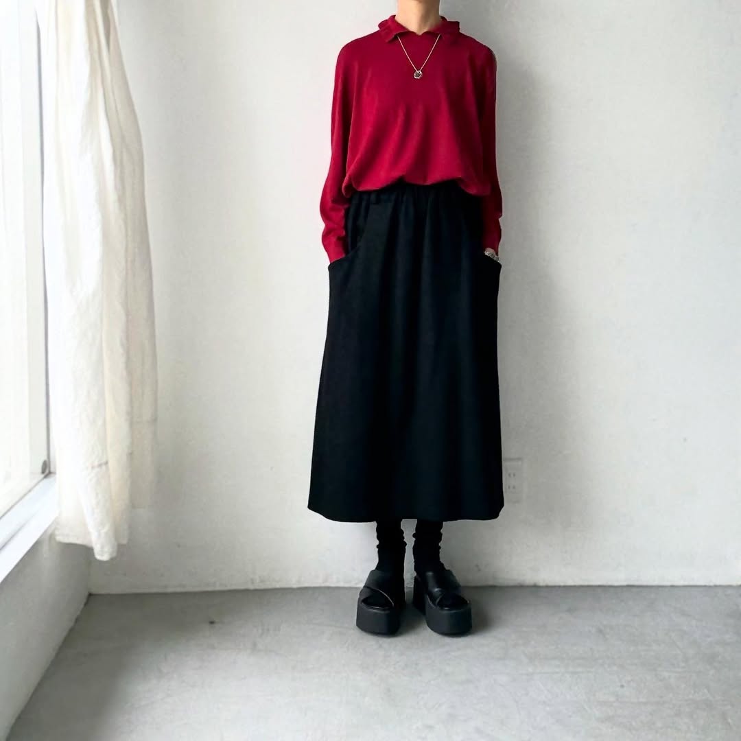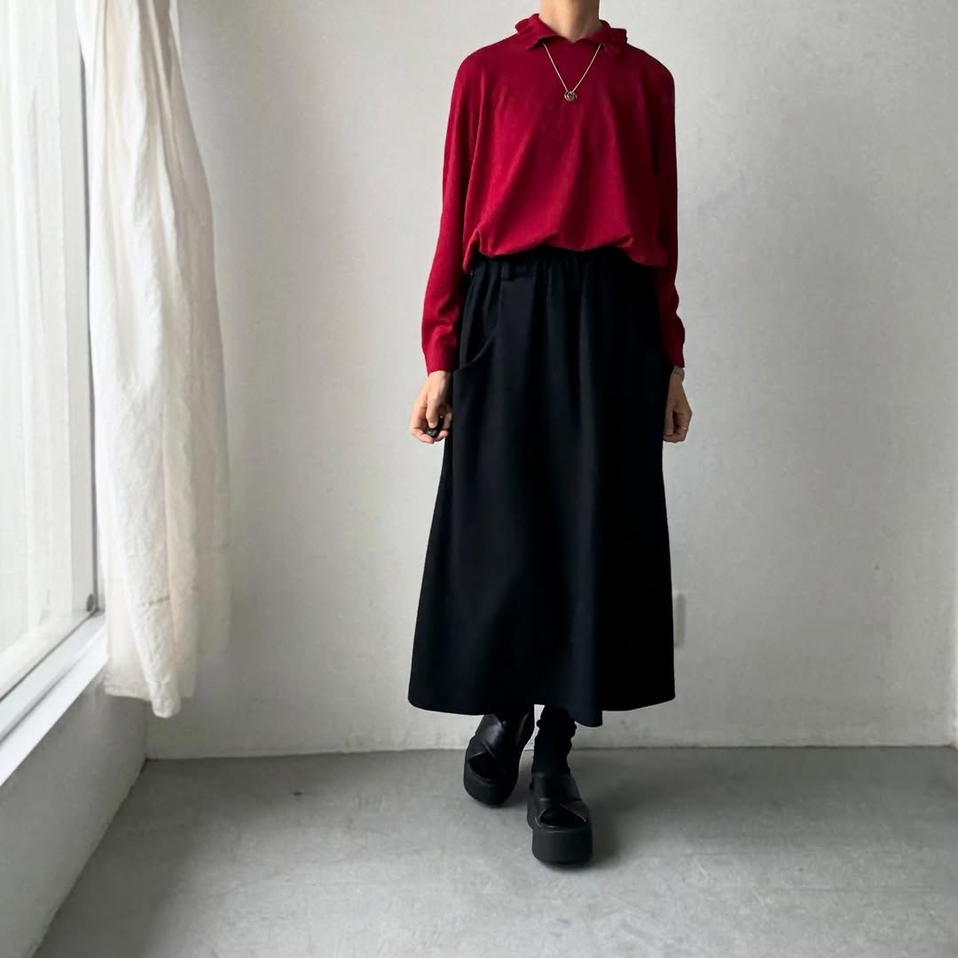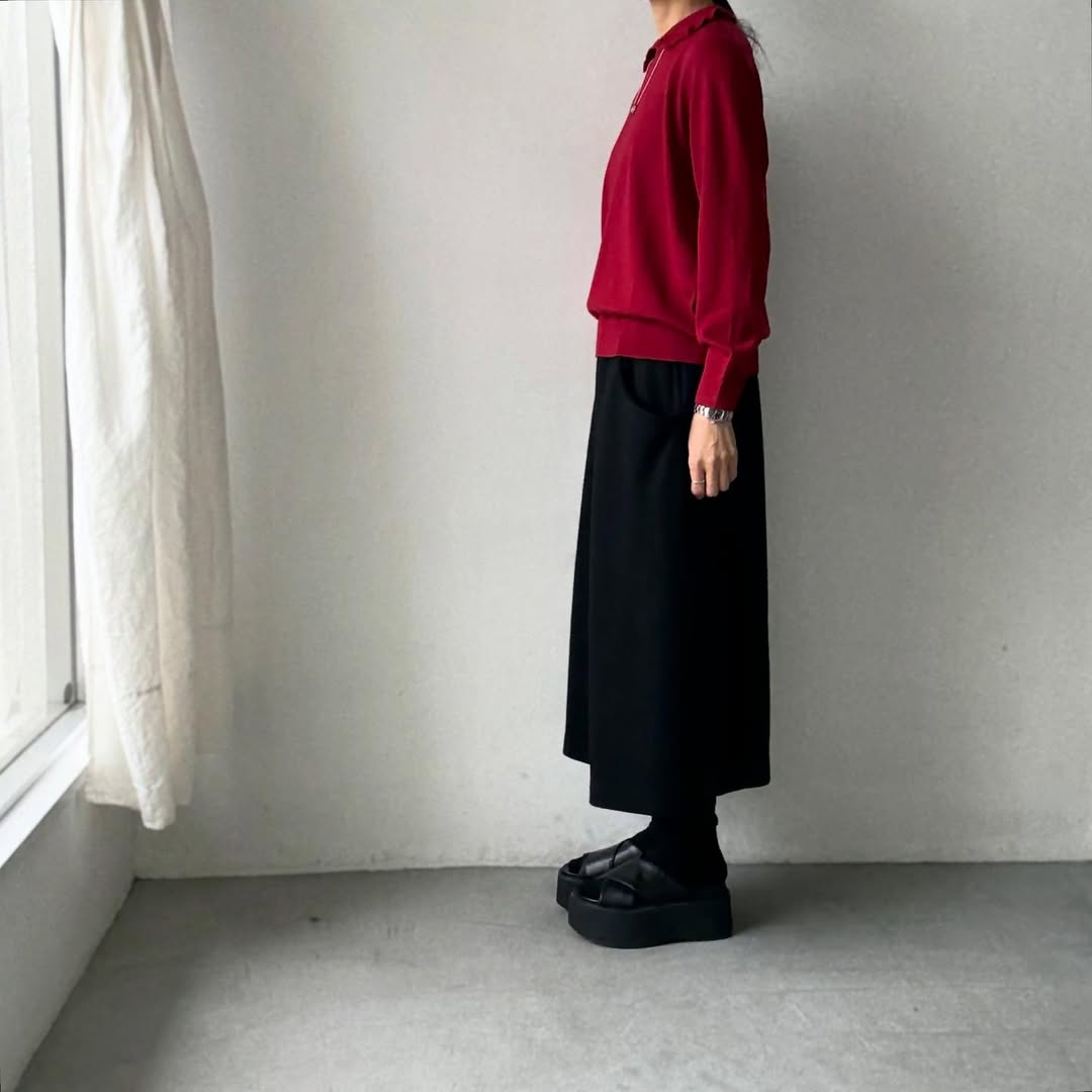 体の線を拾わない程良いゆとりのあるシルエットとやや短めの丈感です。