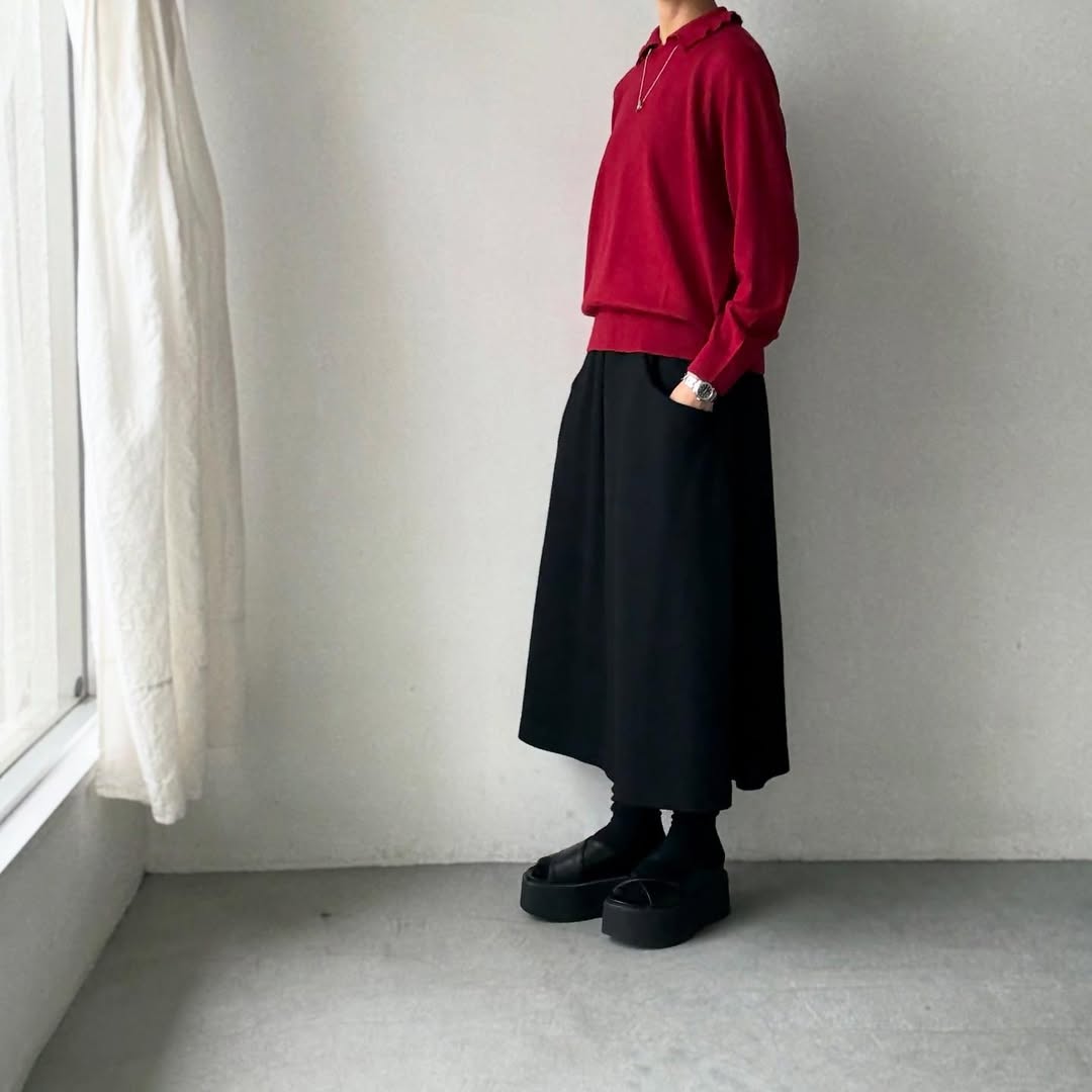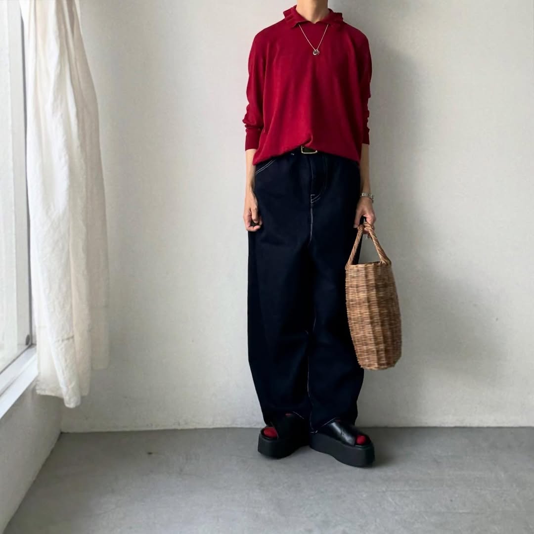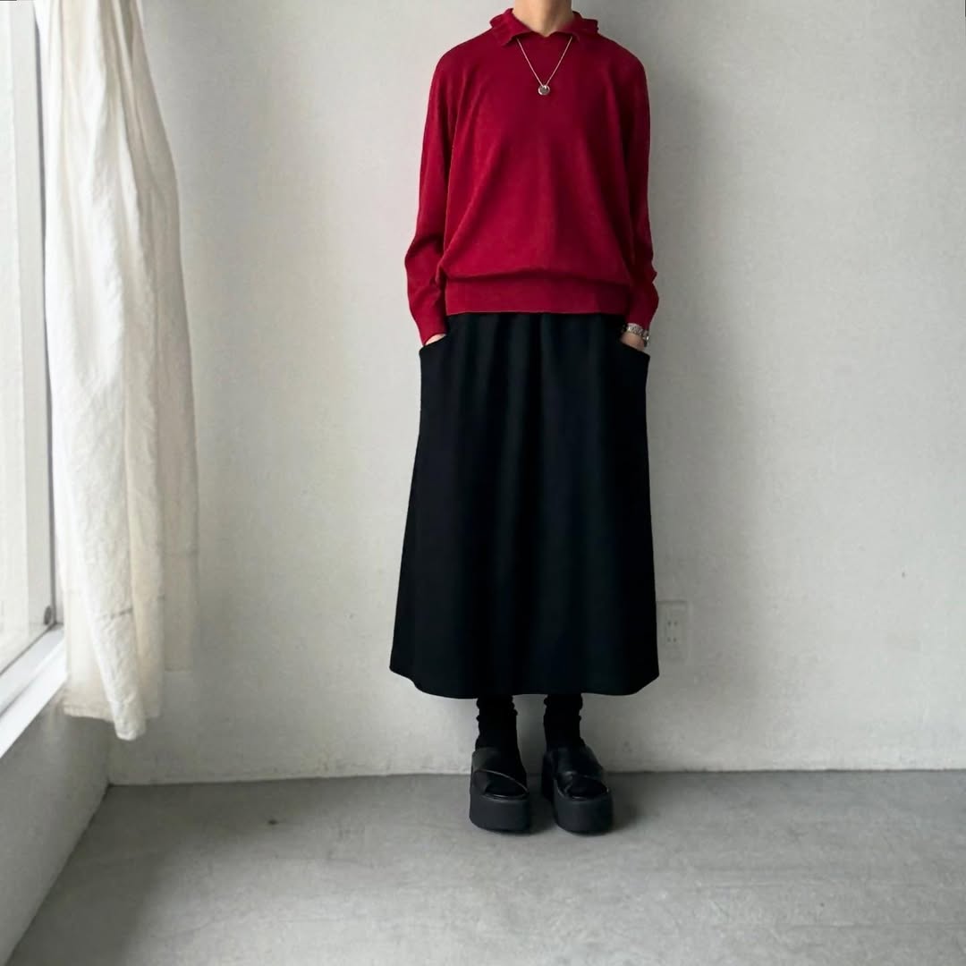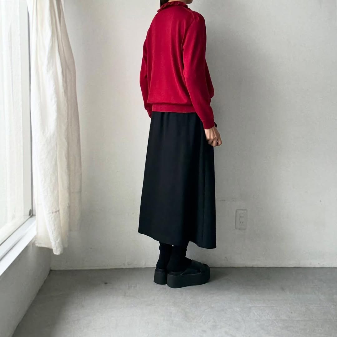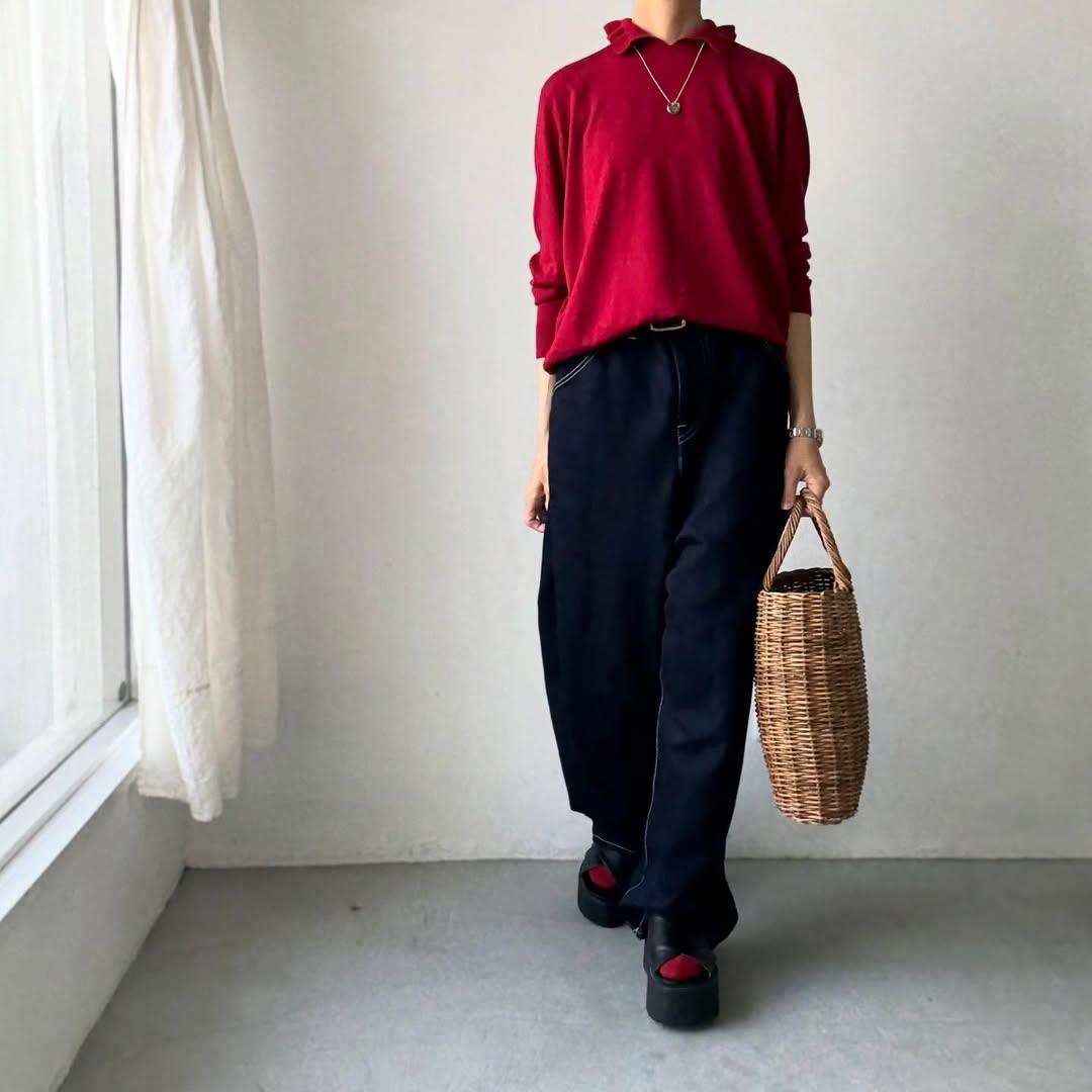 カジュアルなボトムスにあわせても、どこか上品な印象のコーディネートに見えるニットです。