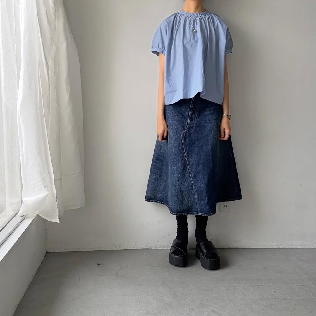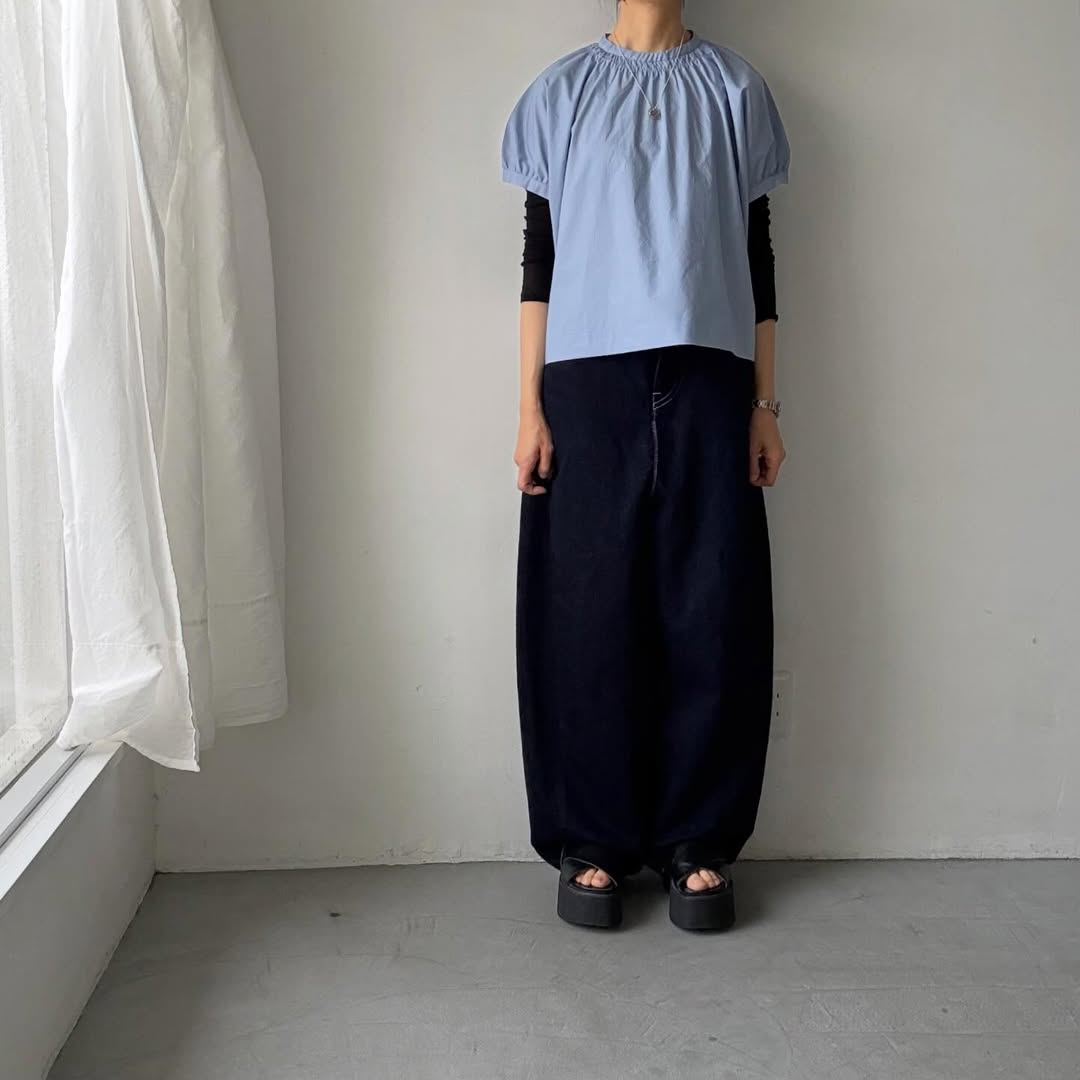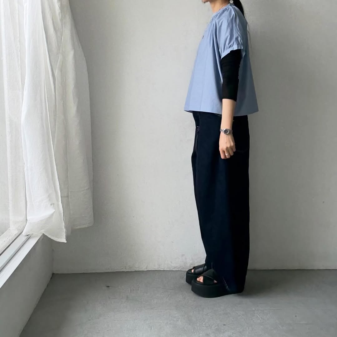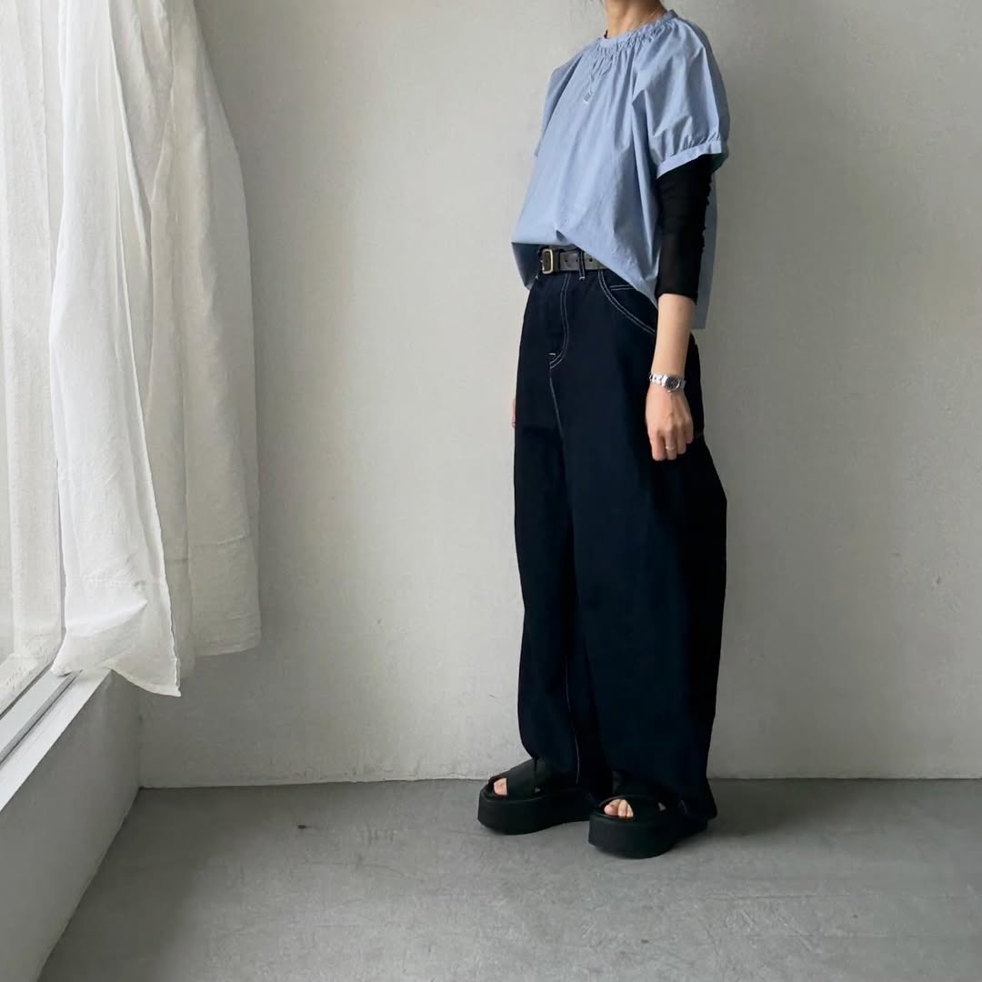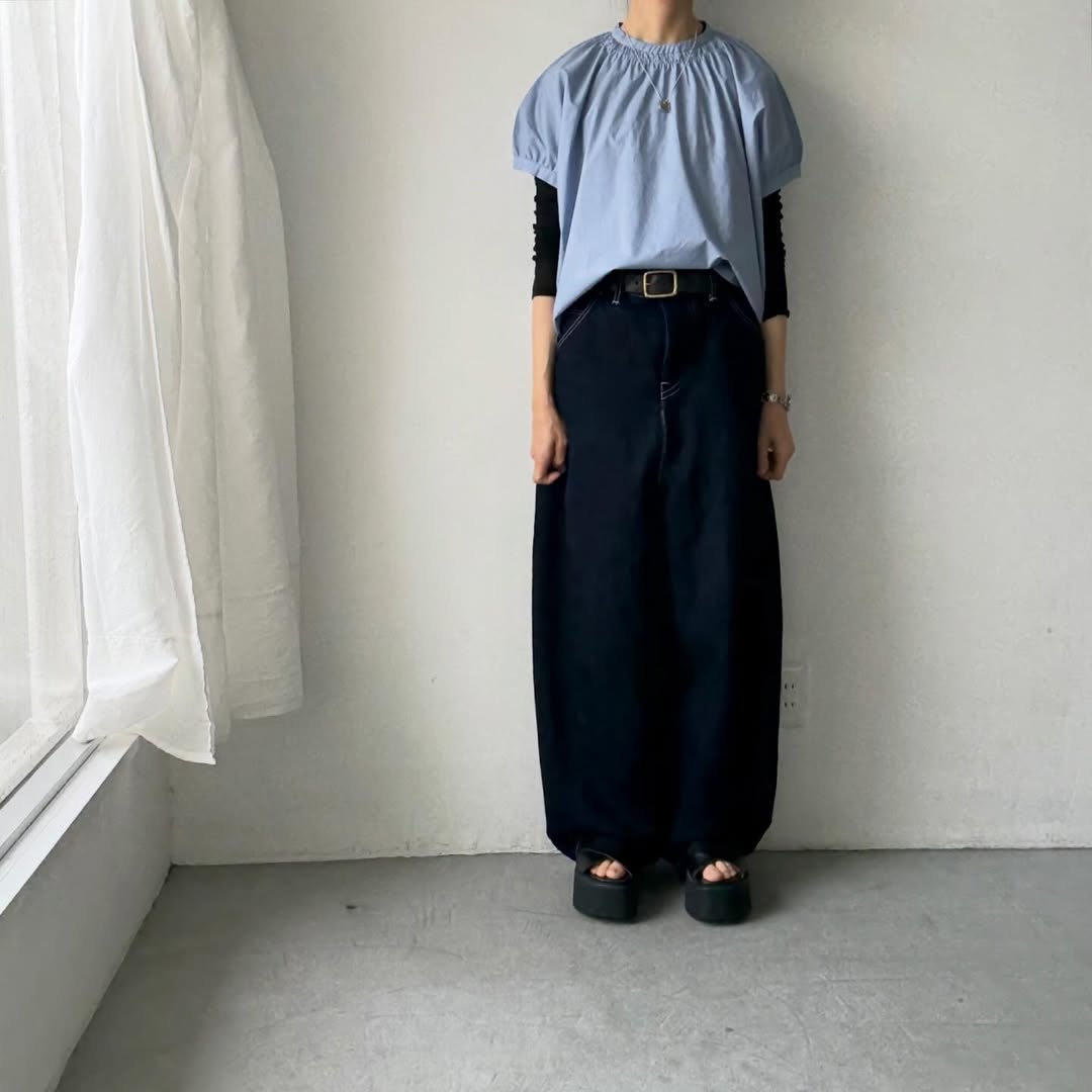 短め丈なのでふんわりしたスカートやワイドパンツと相性が良いです。デニムと甘辛コーディネートもおすすめ。