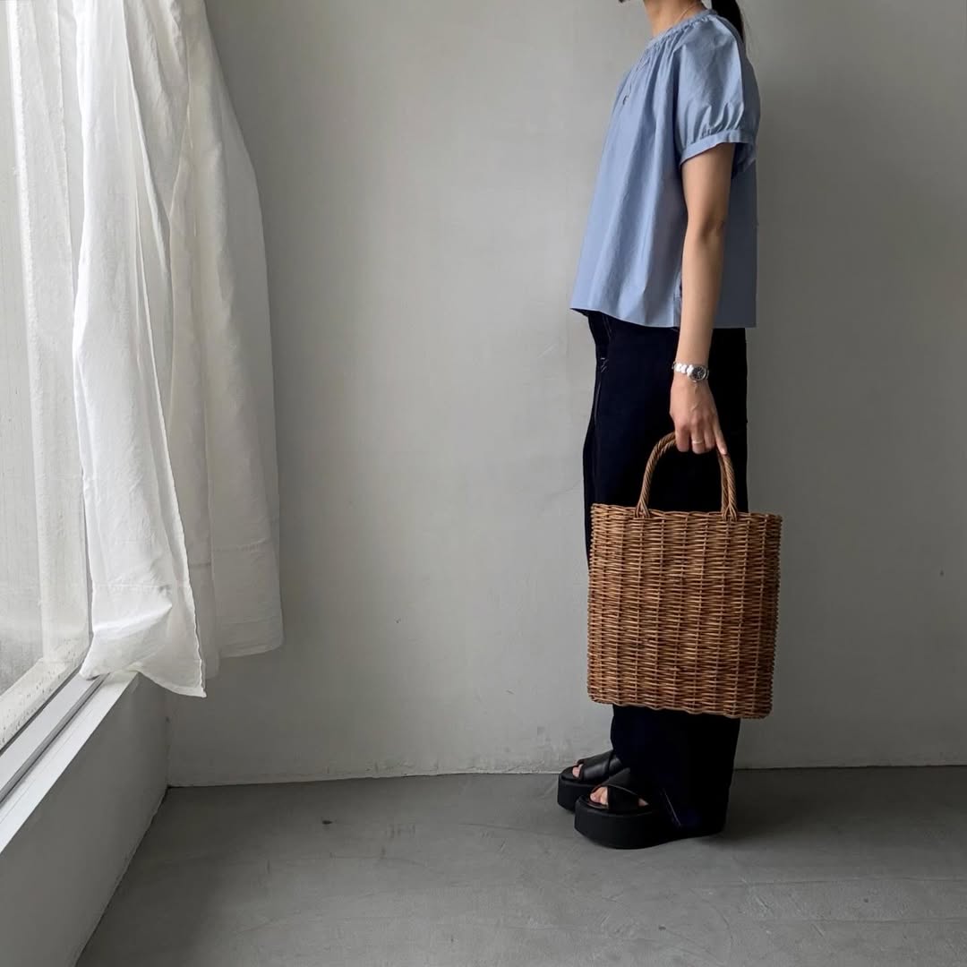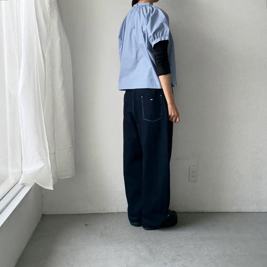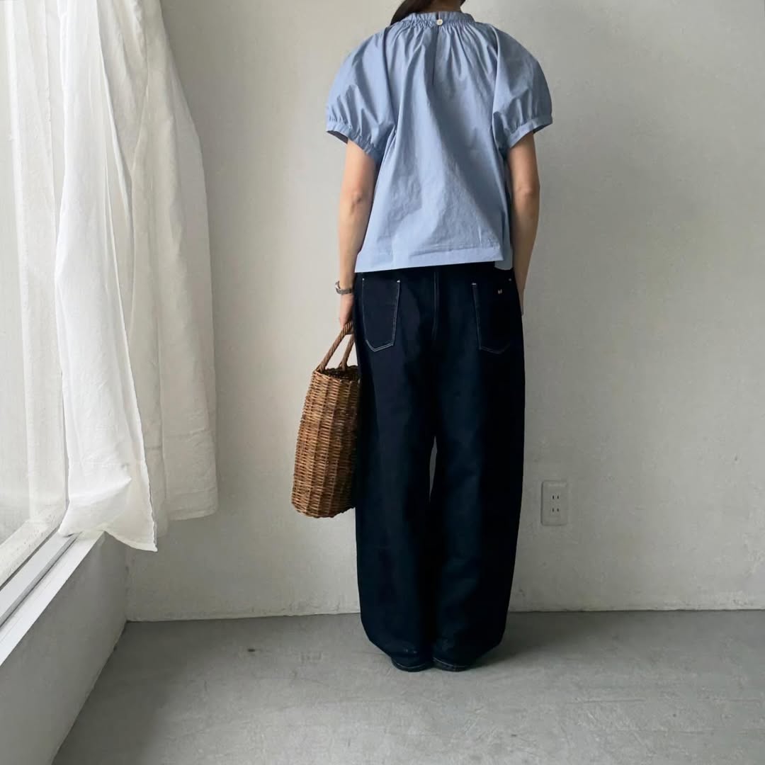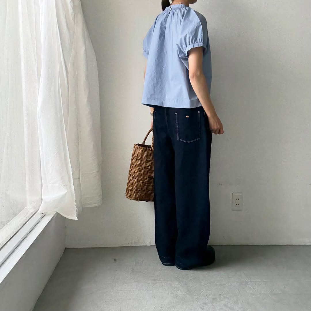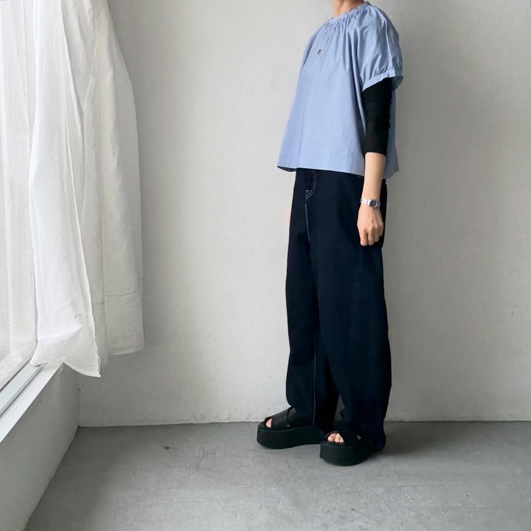 短め丈なのでふんわりしたスカートやワイドパンツと相性が良いです。デニムと甘辛コーディネートもおすすめ。