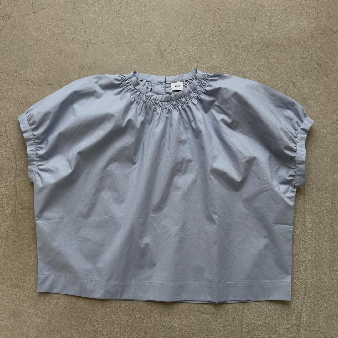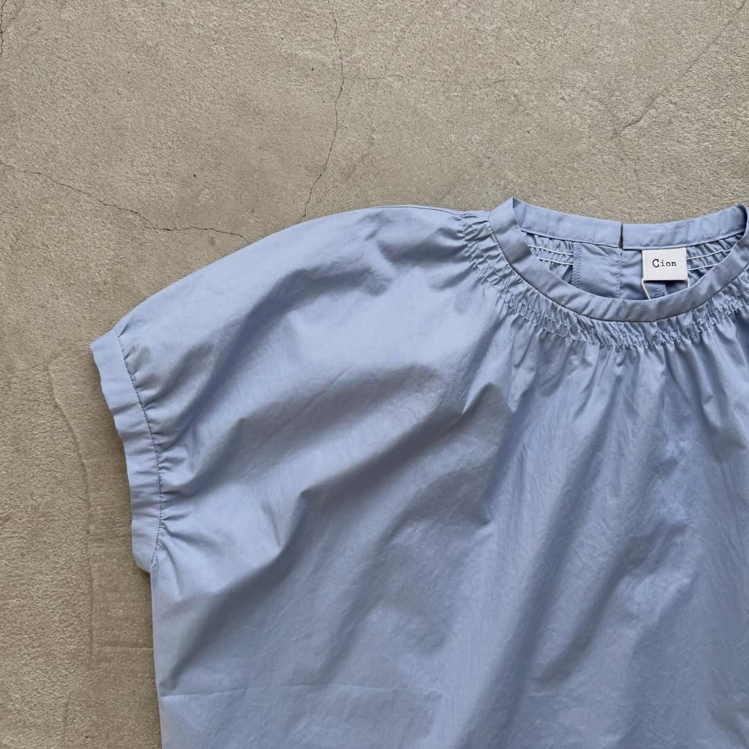 首周りに施されたシャーリングと、肩のラインに沿うような丸みのある袖が女性らしい印象です。