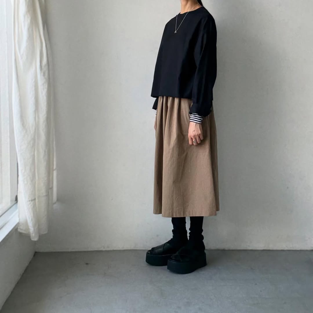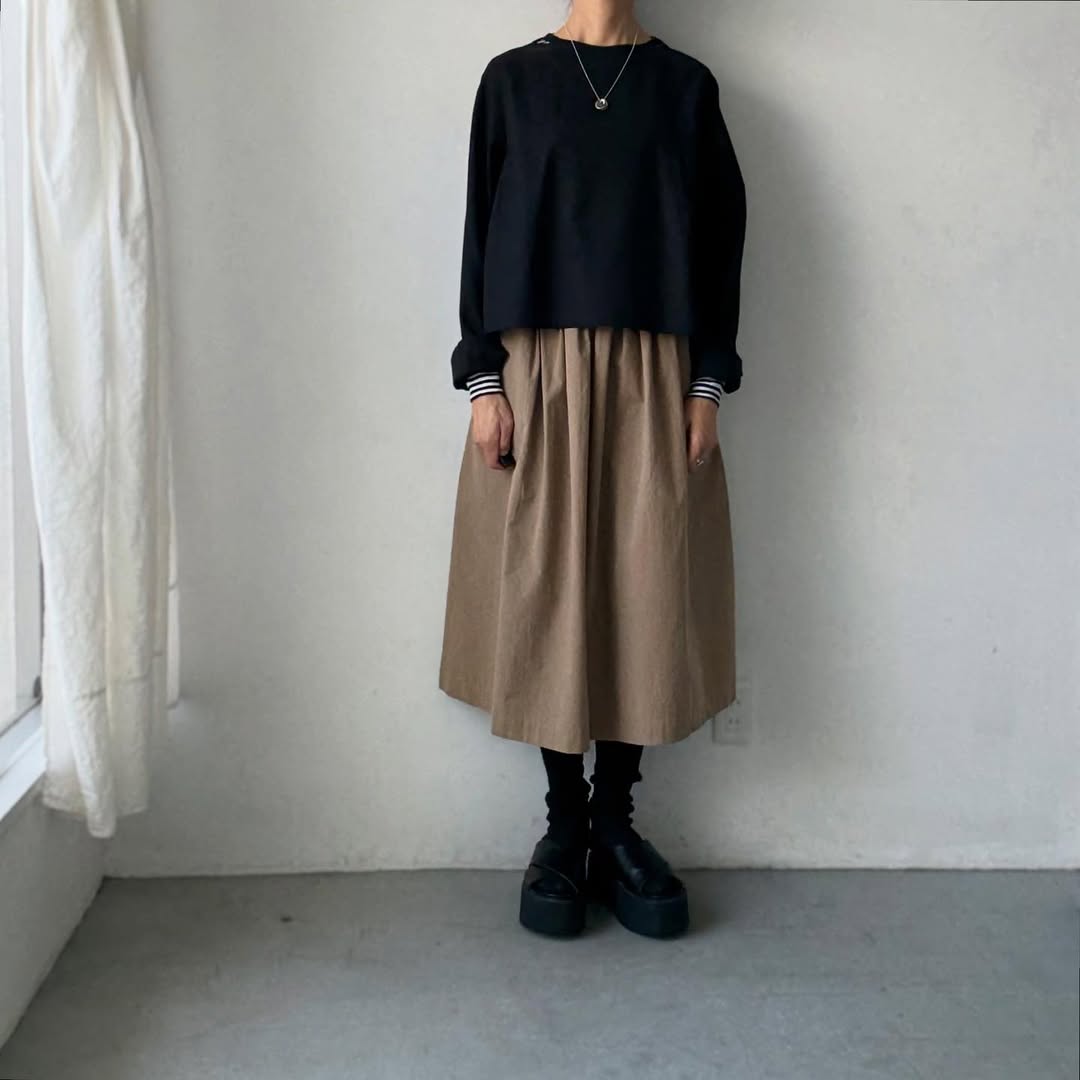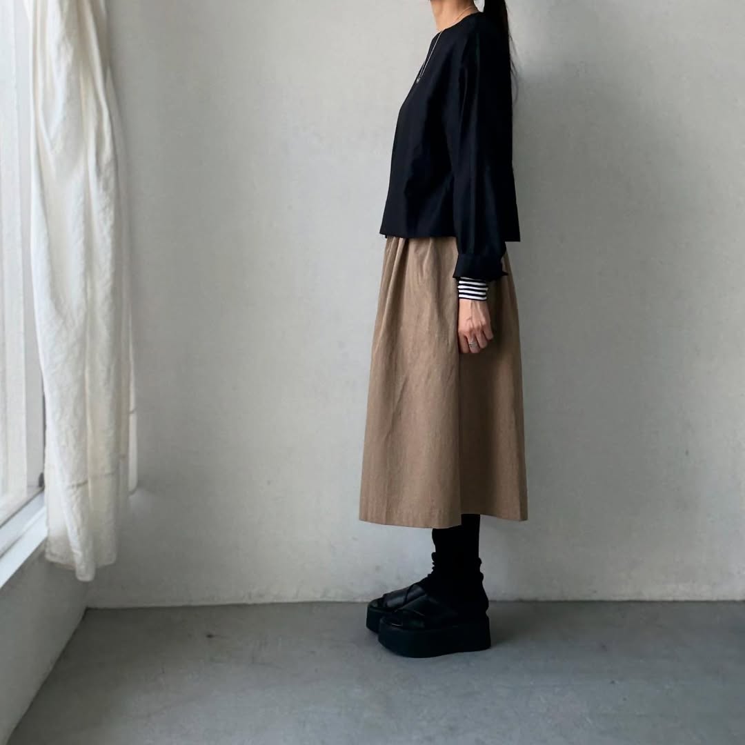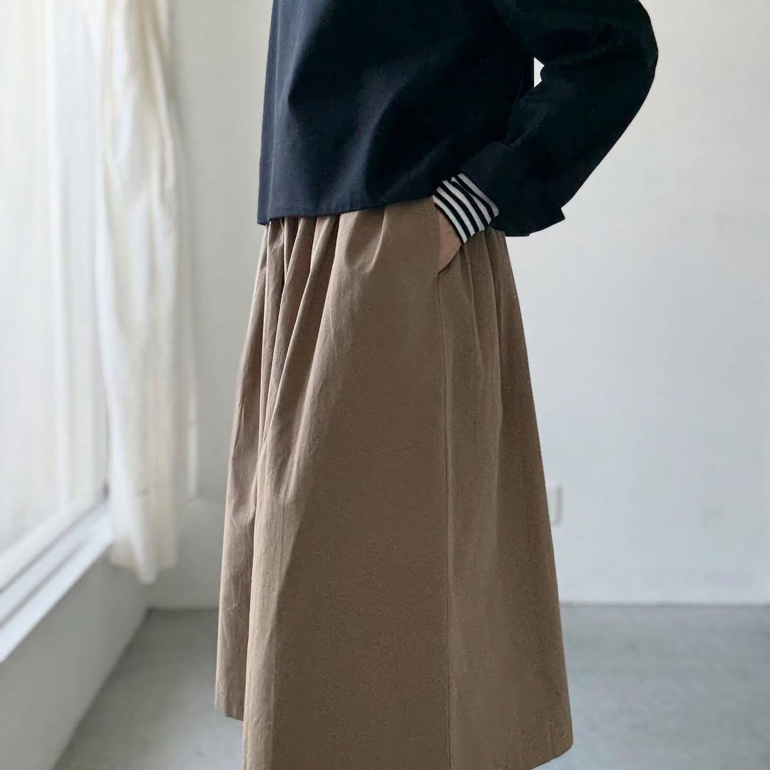 裾はクシュクシュとしたり、ボトムインしたり。