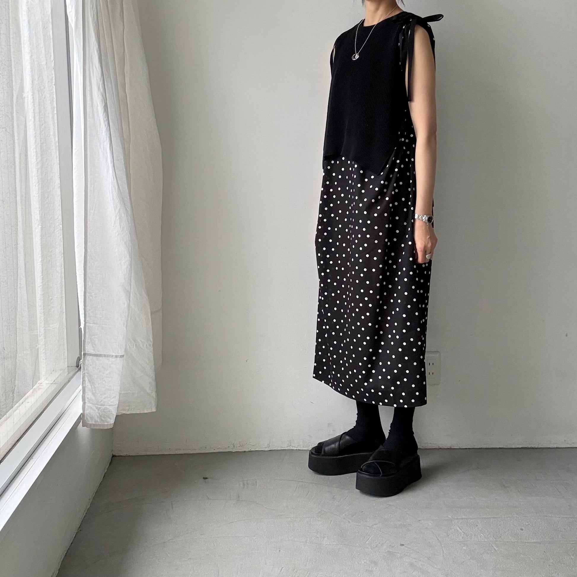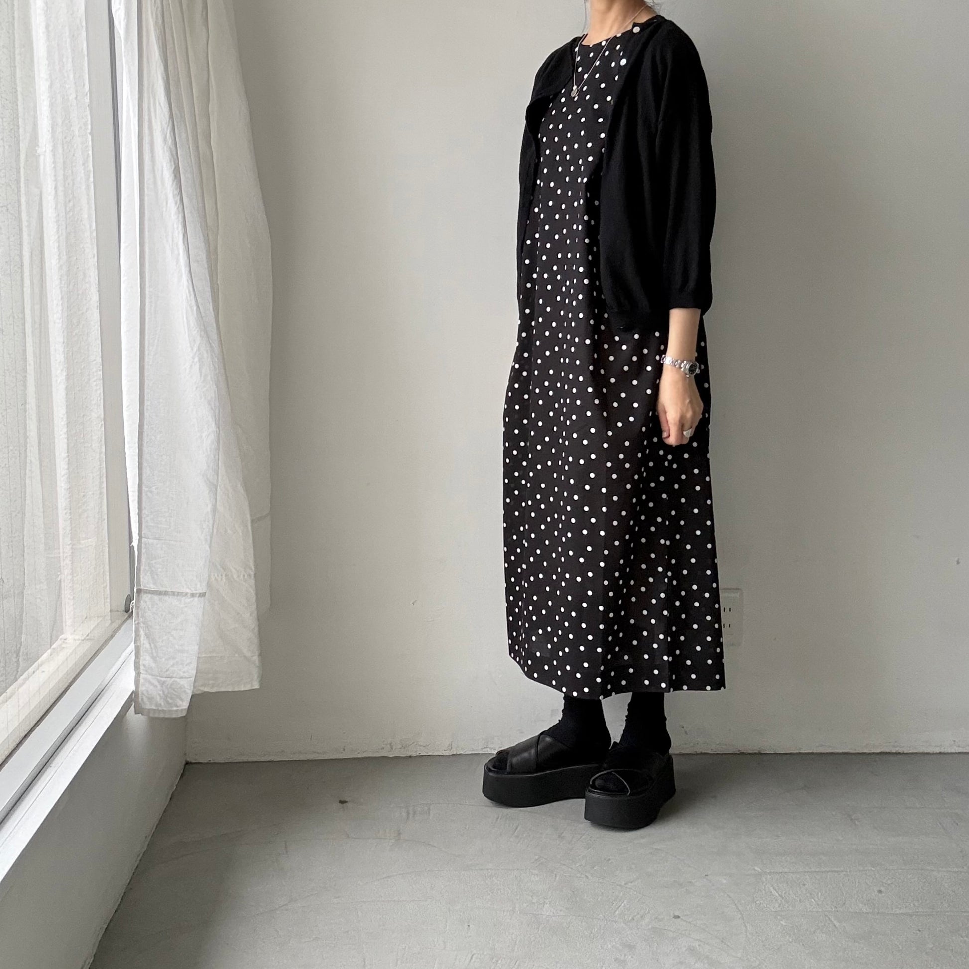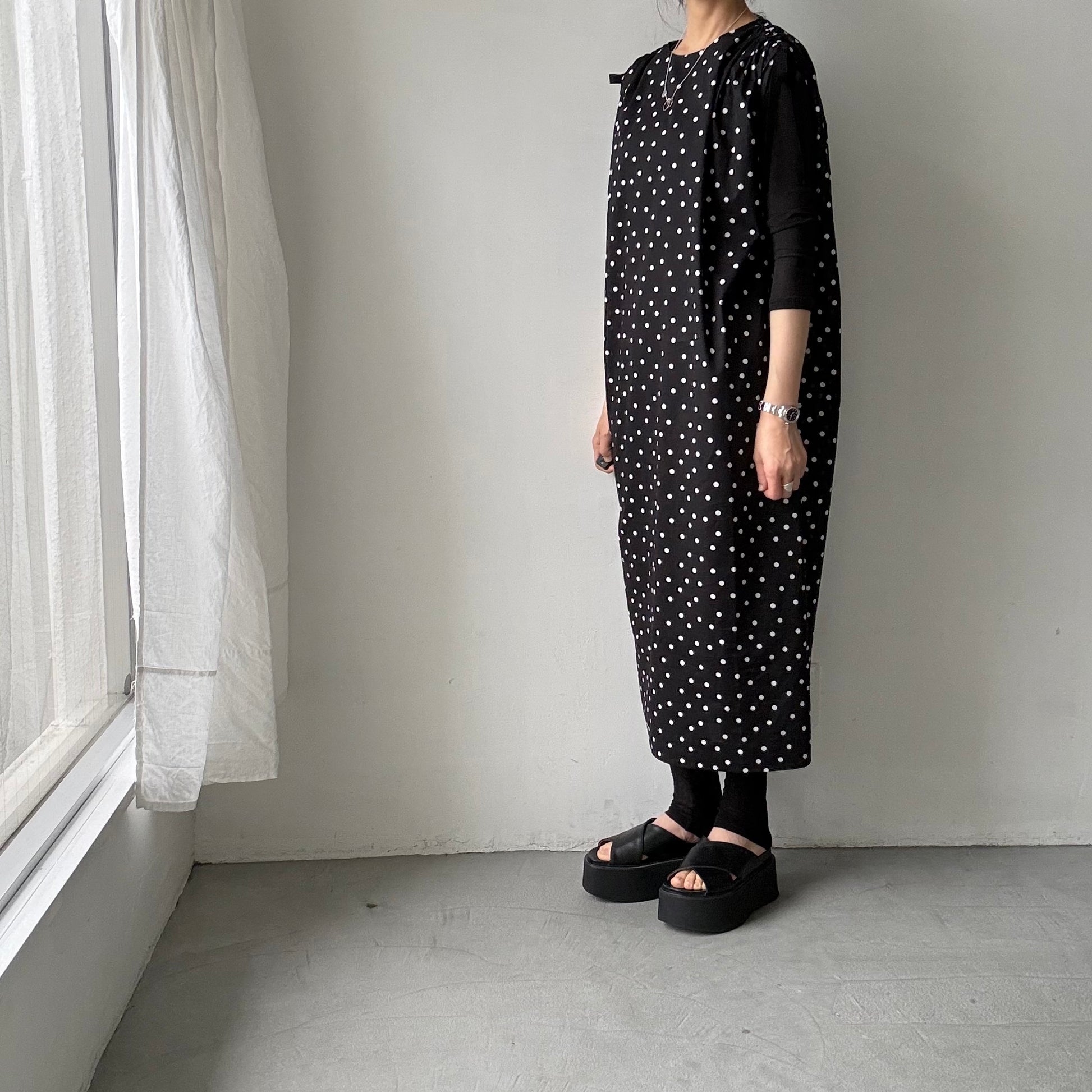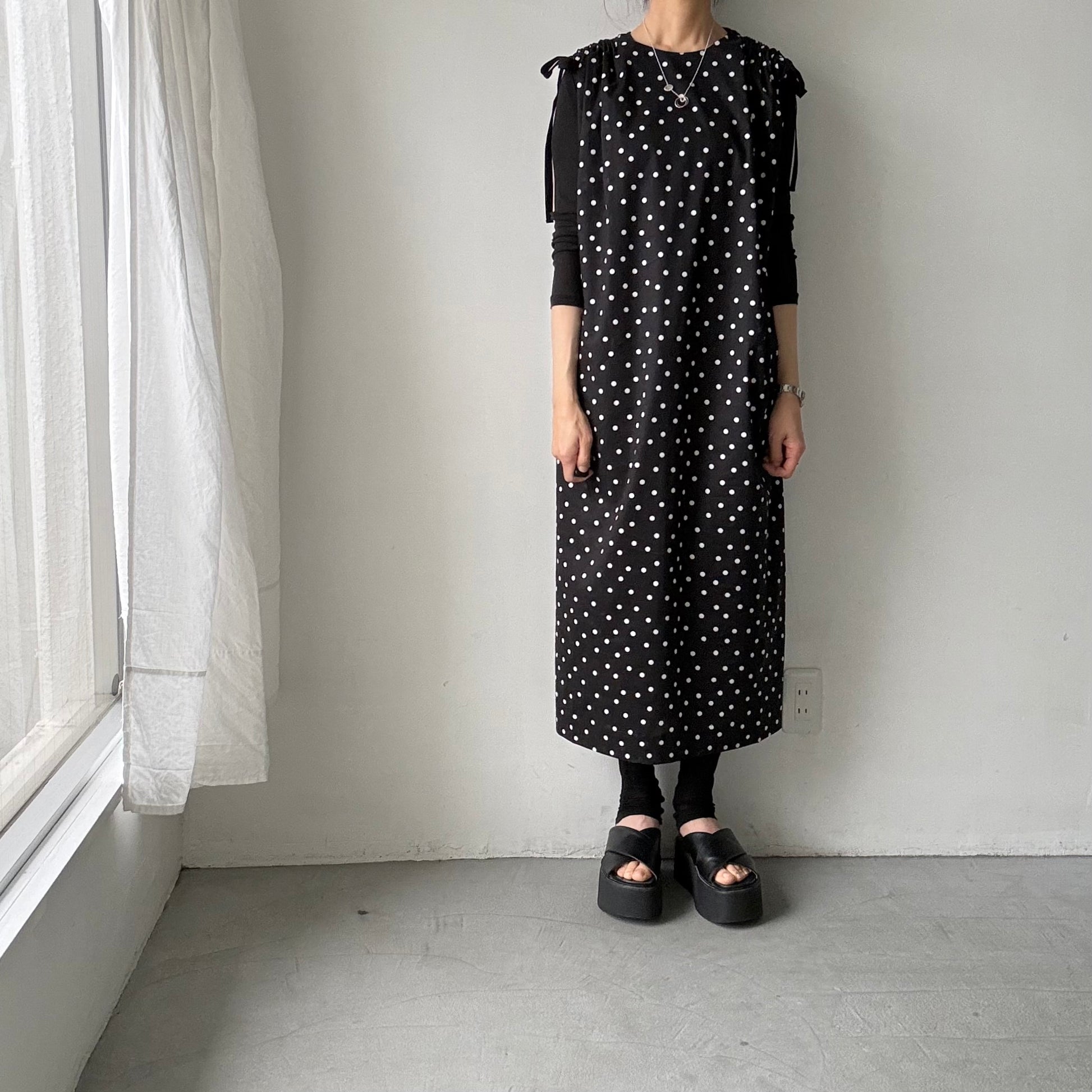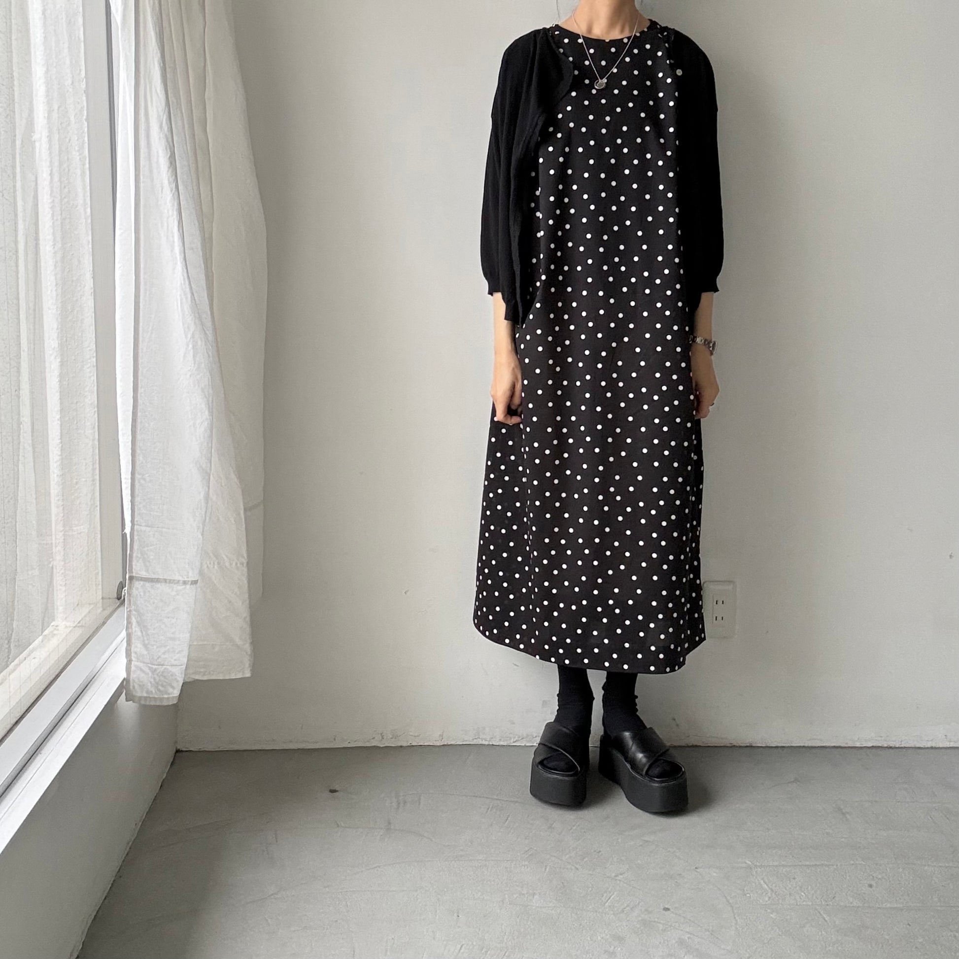 モードな、クラシックな。そんな印象の水玉柄のワンピース。