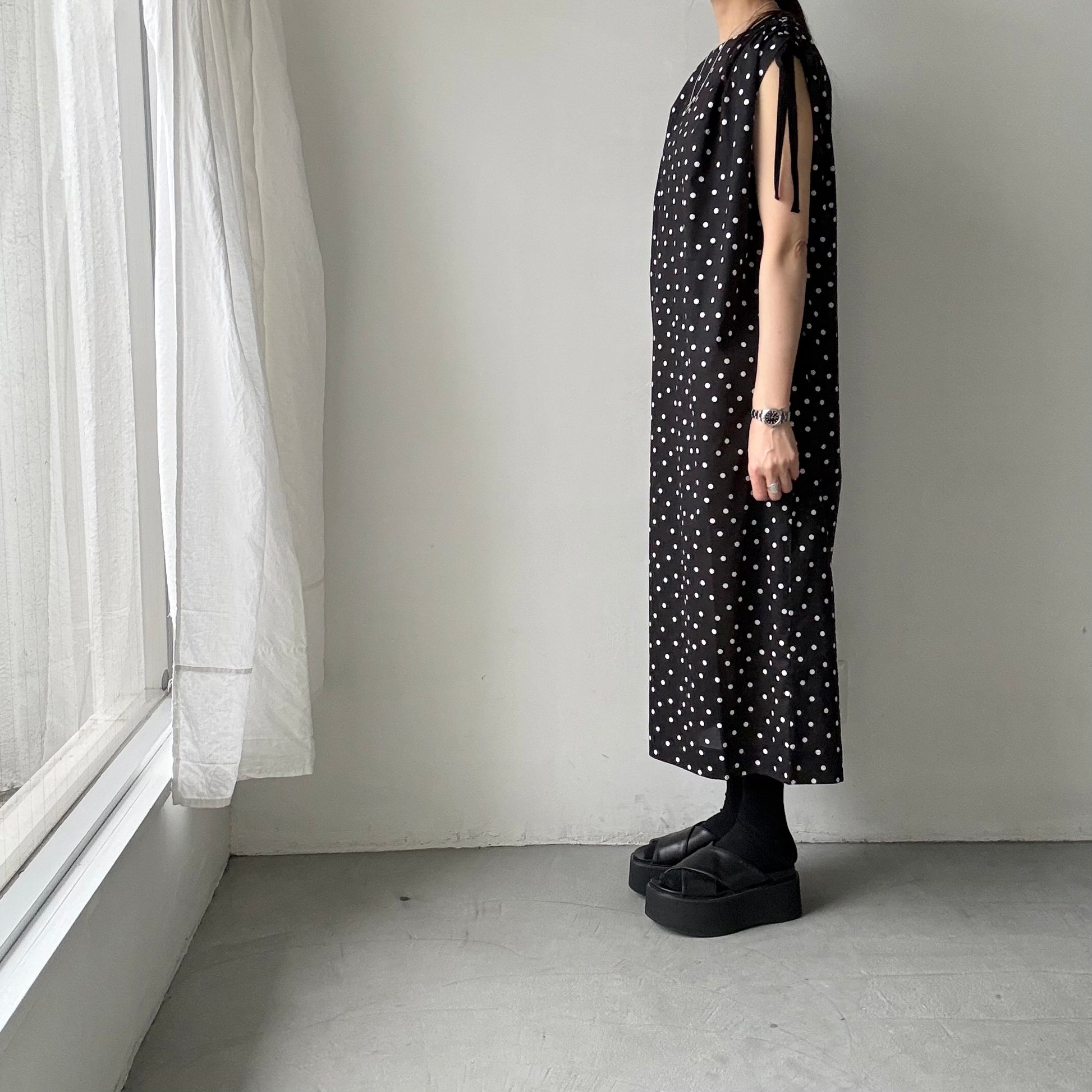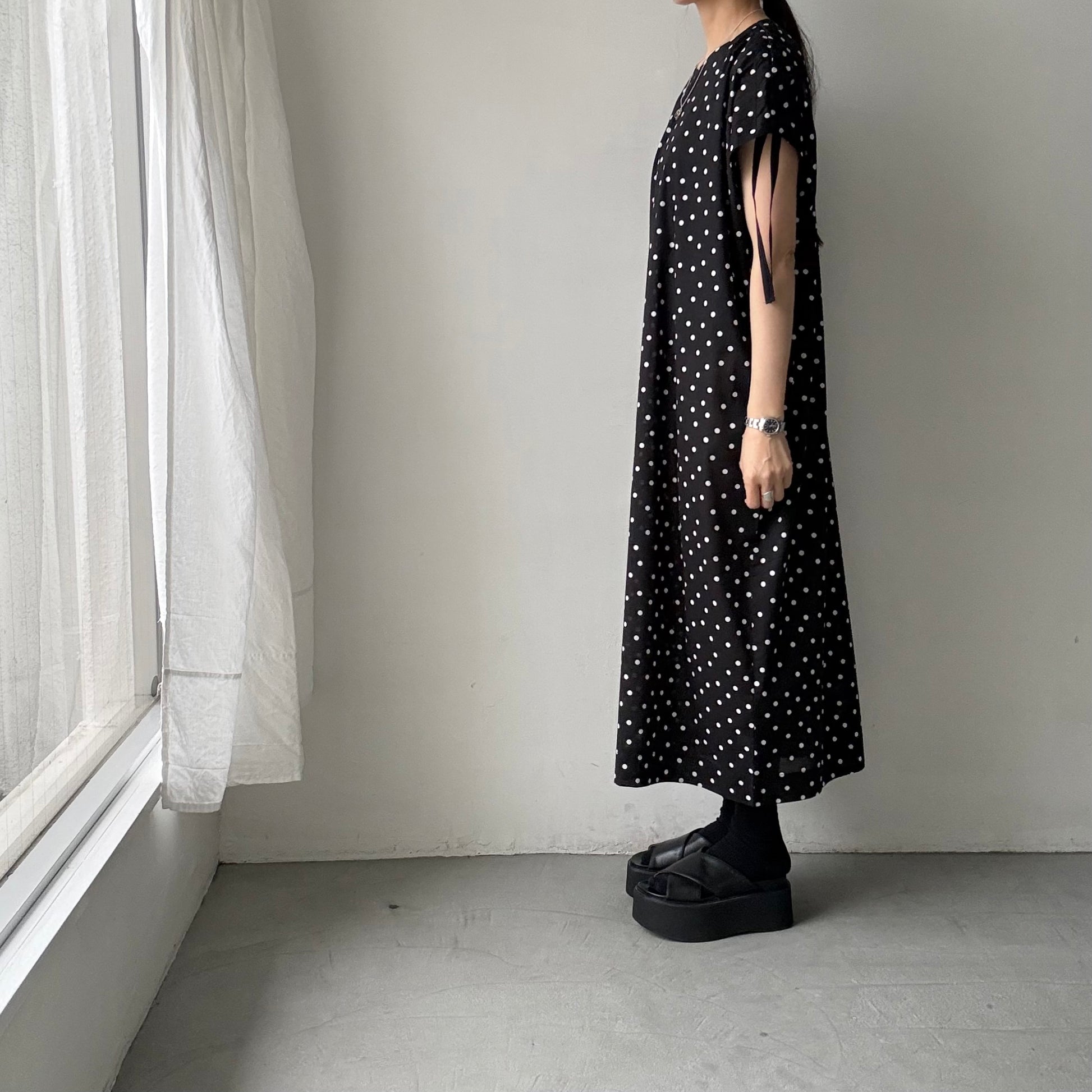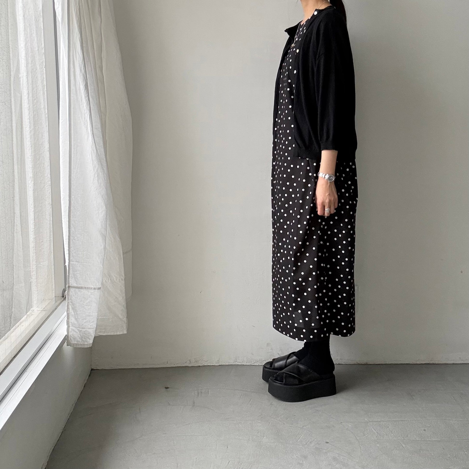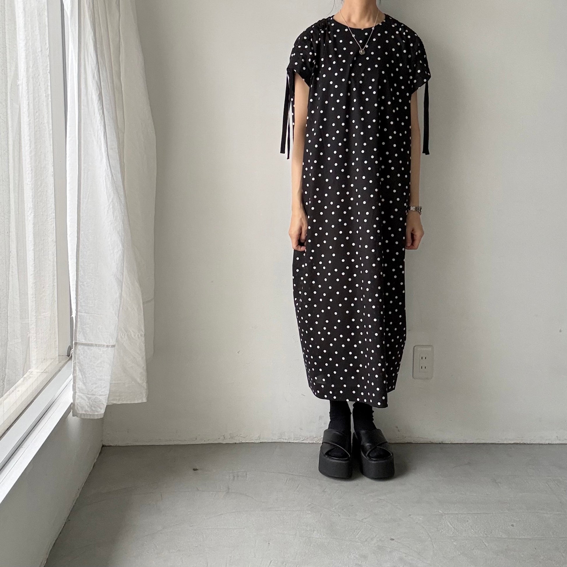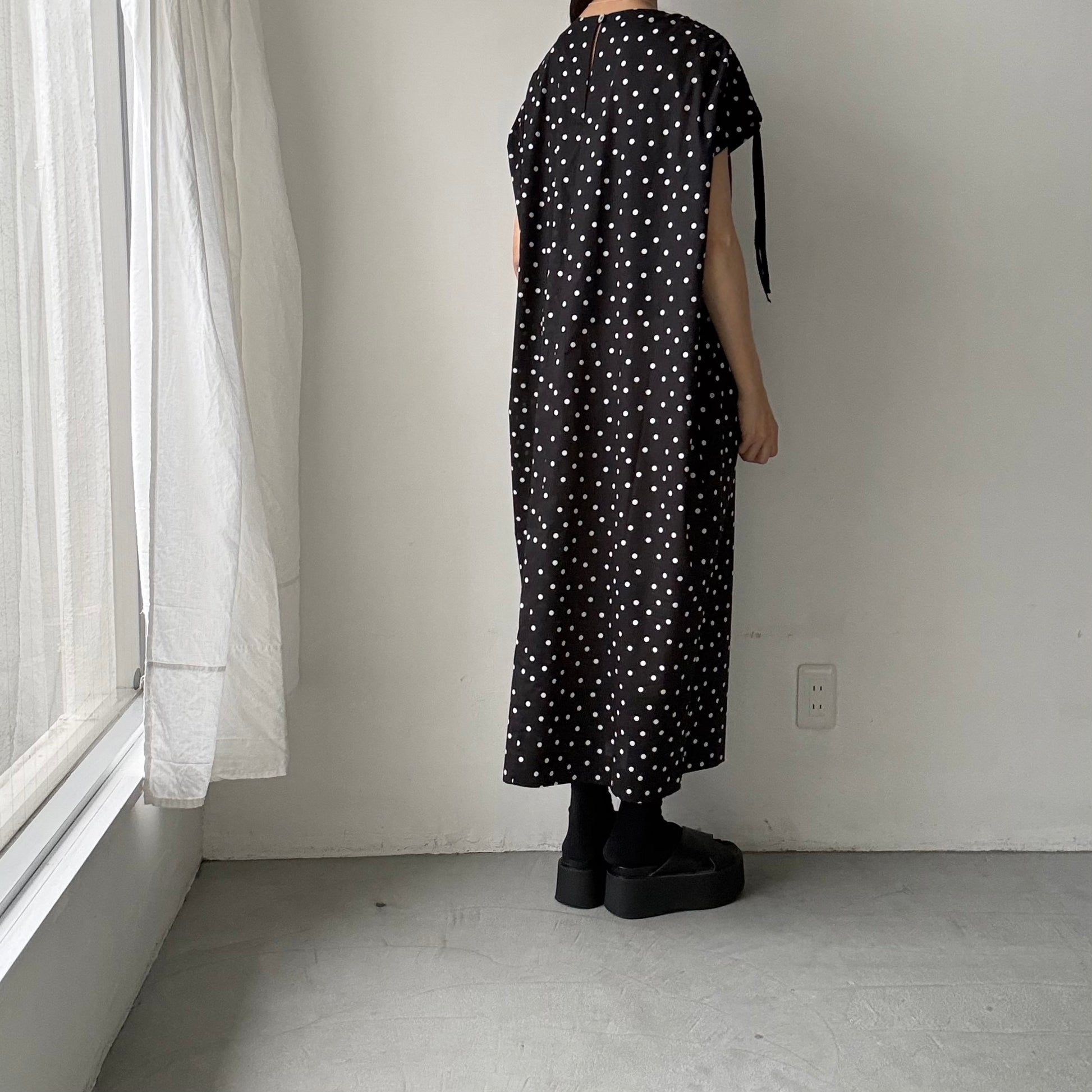 モードな、クラシックな。そんな印象の水玉柄のワンピース。