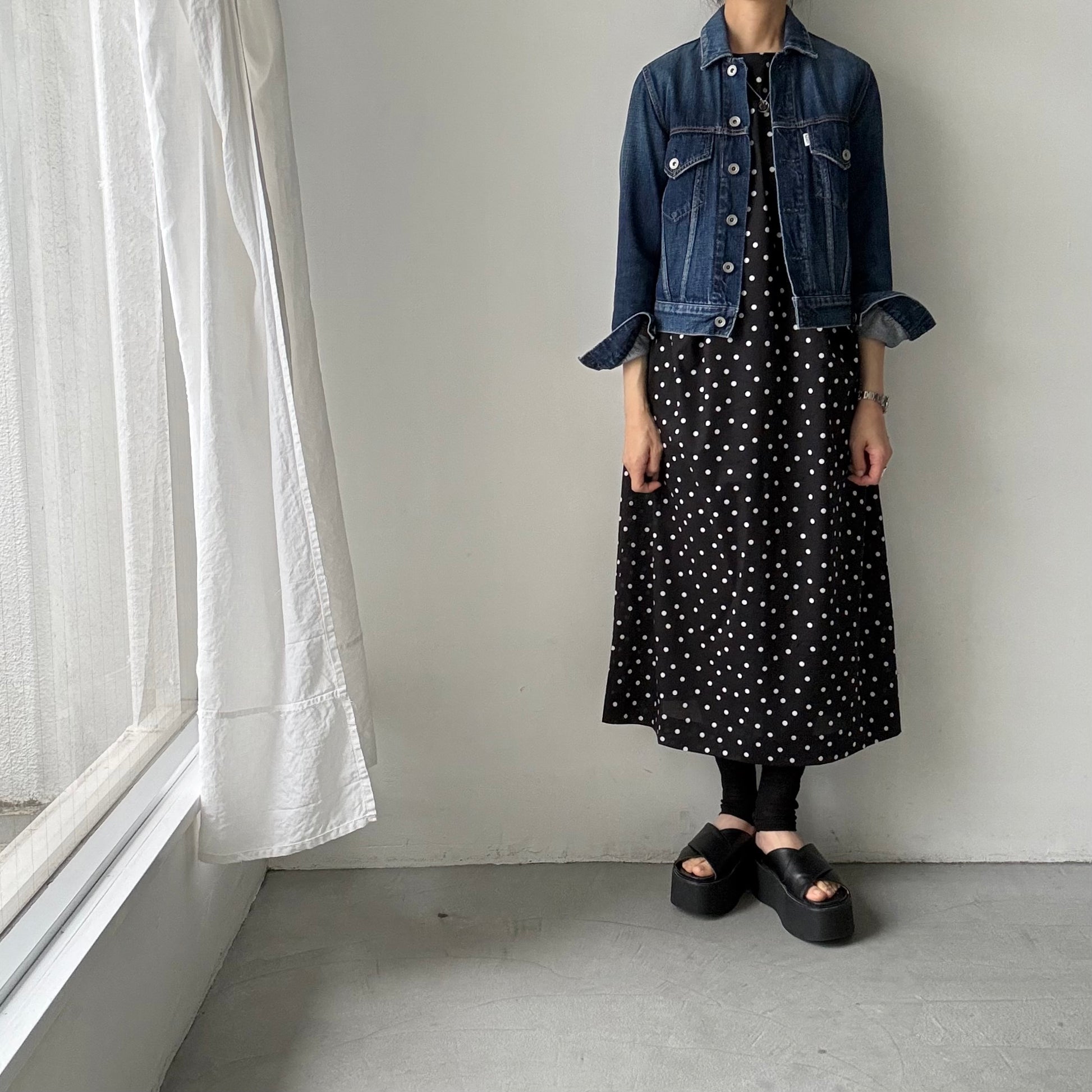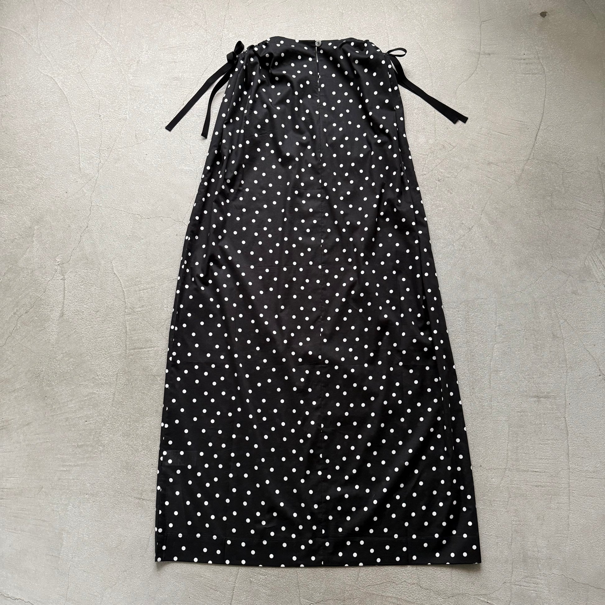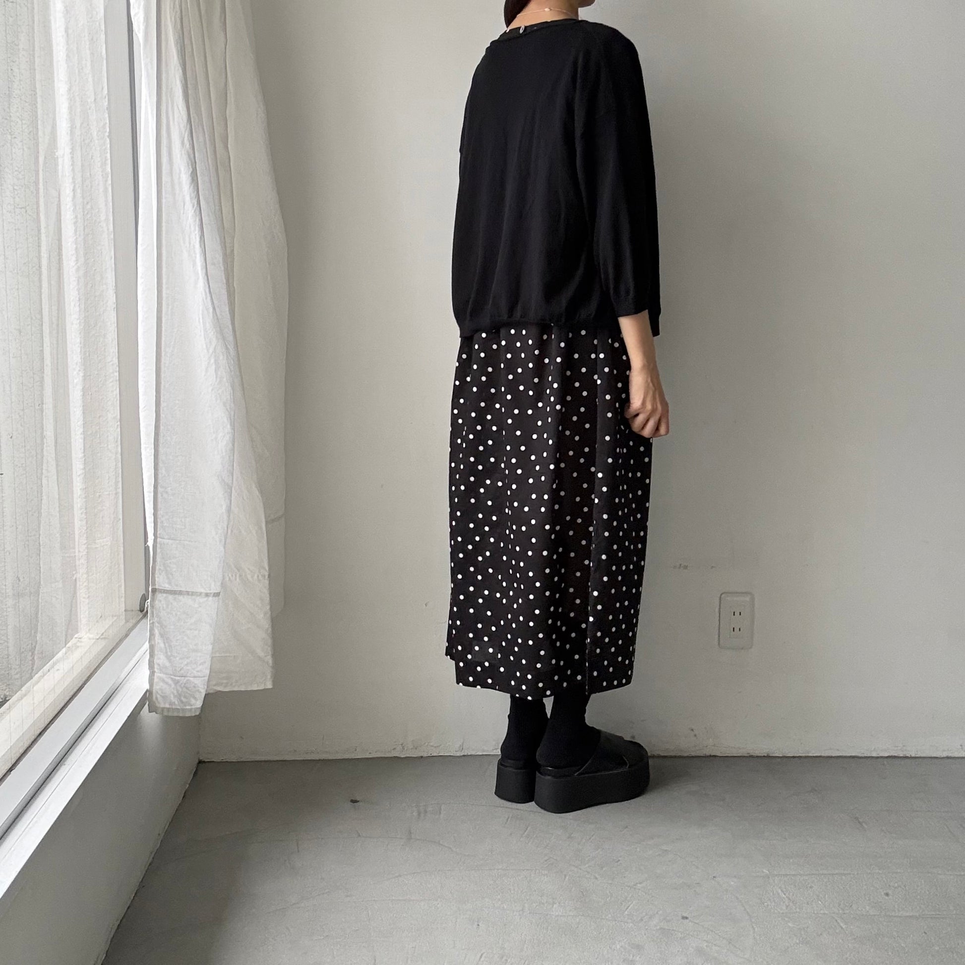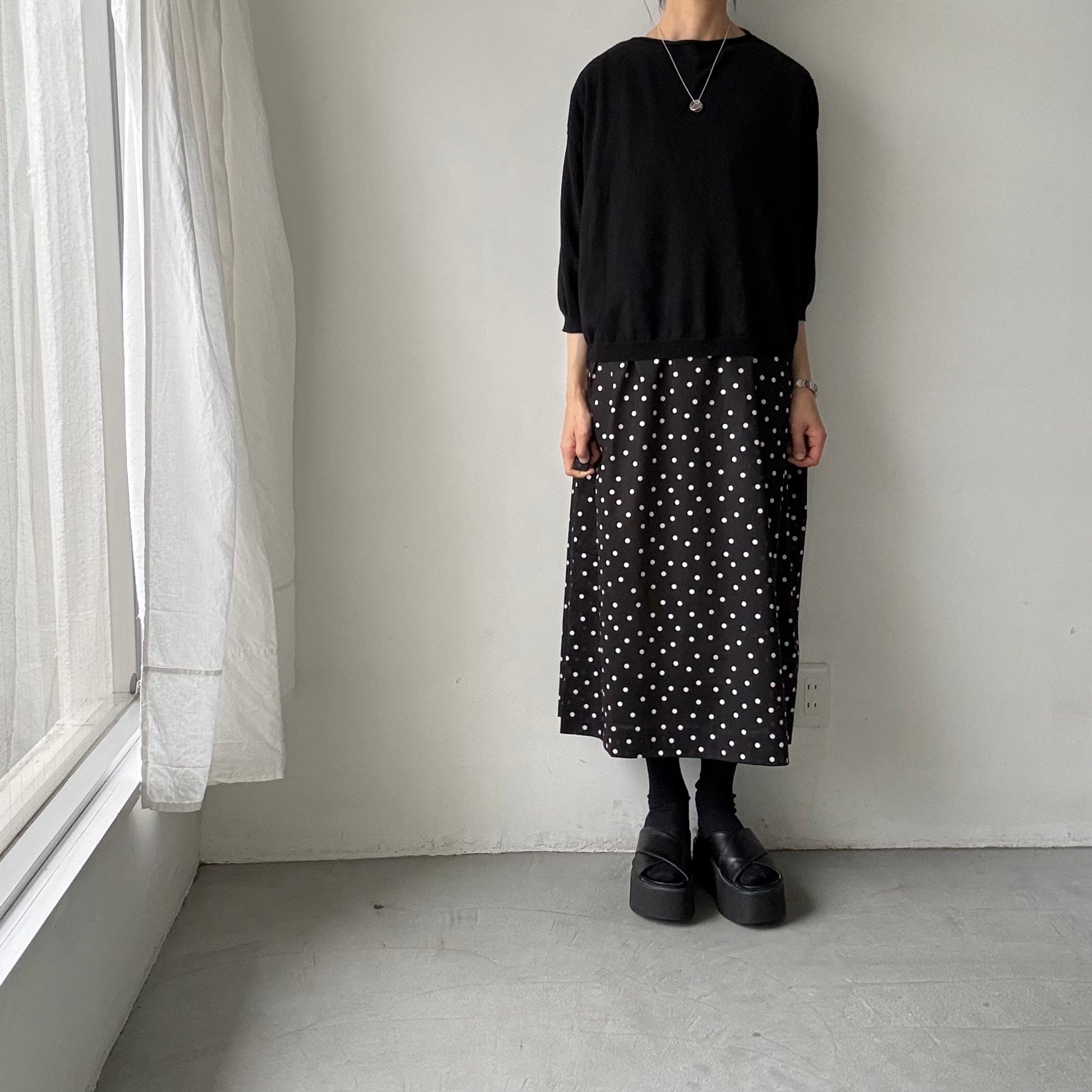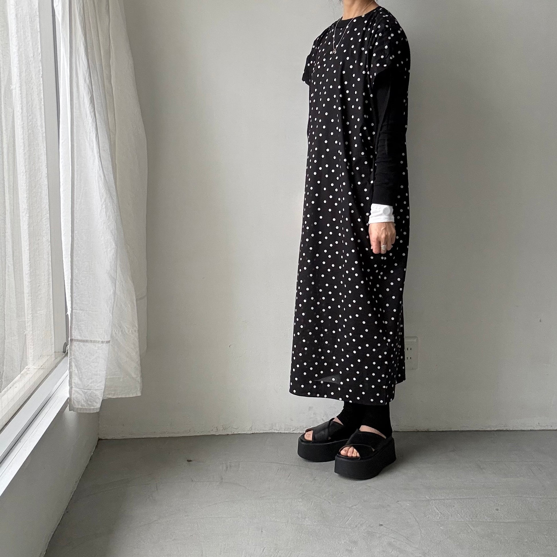 モードな、クラシックな。そんな印象の水玉柄のワンピース。