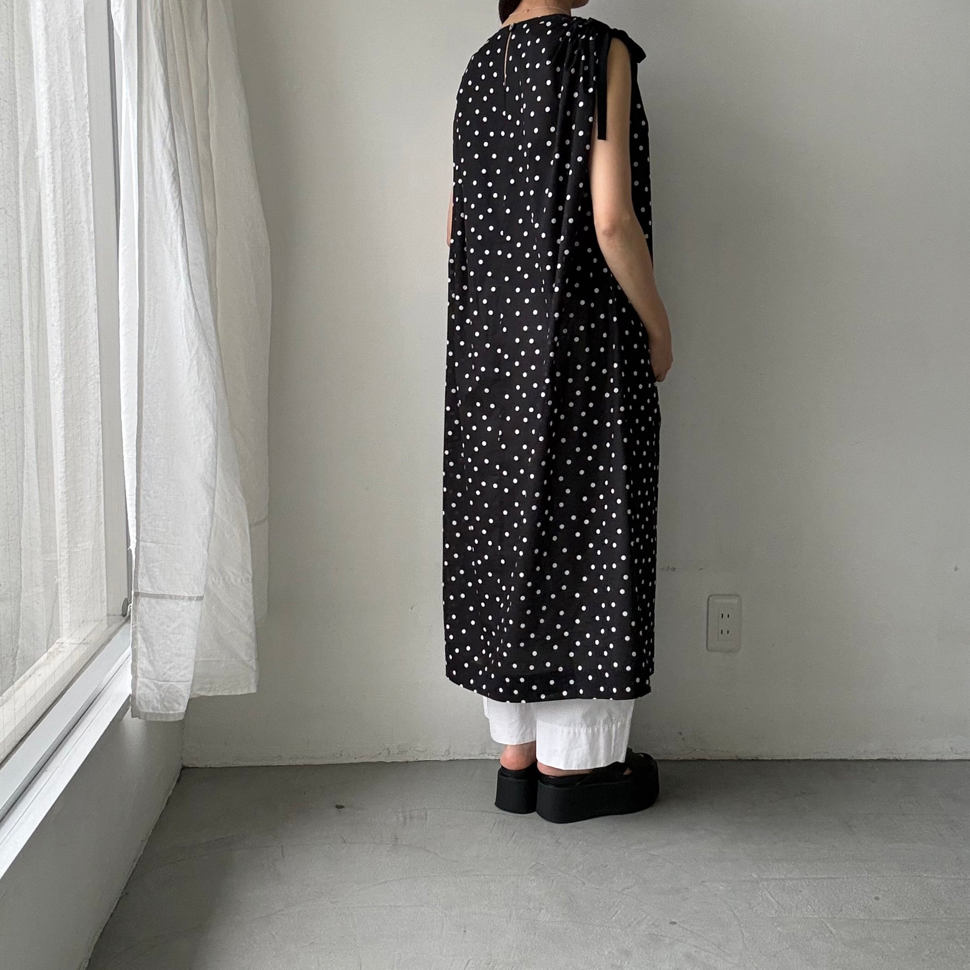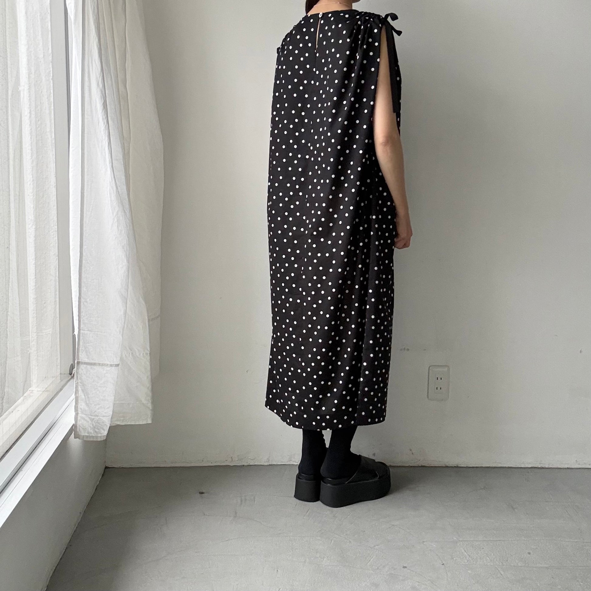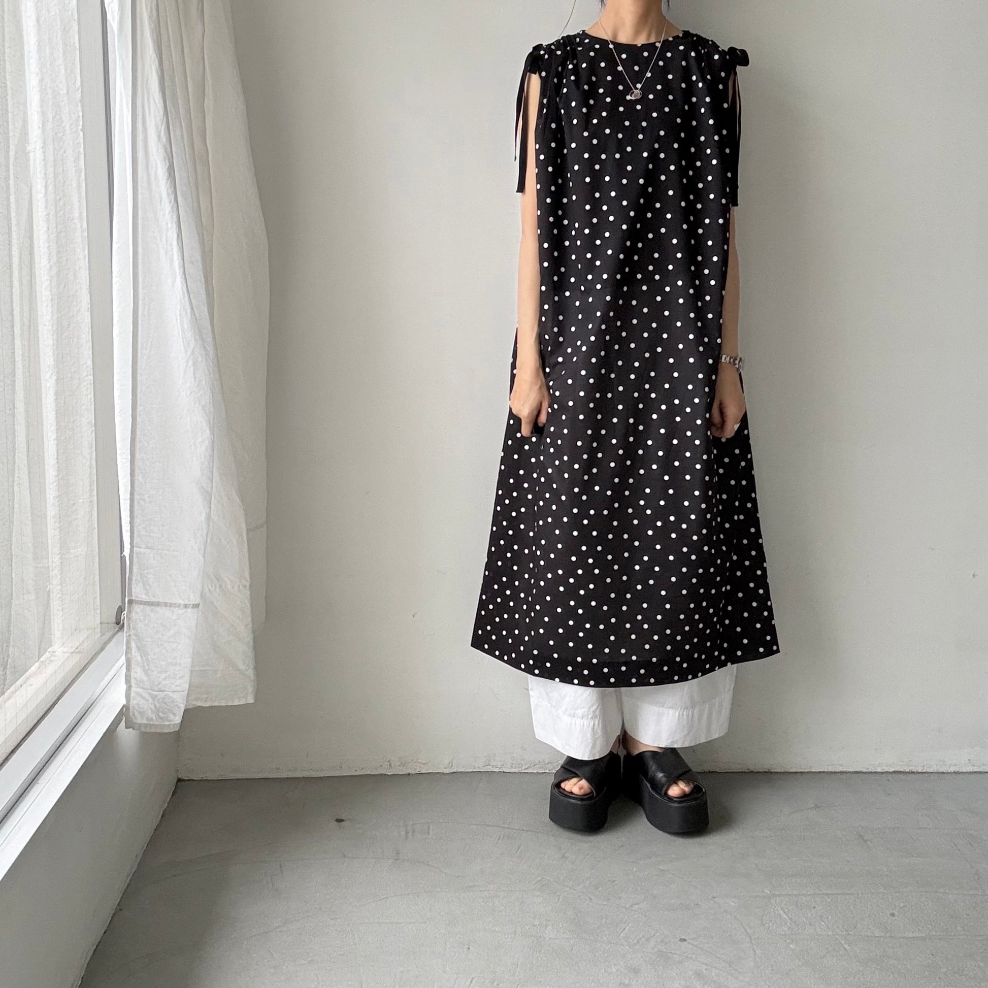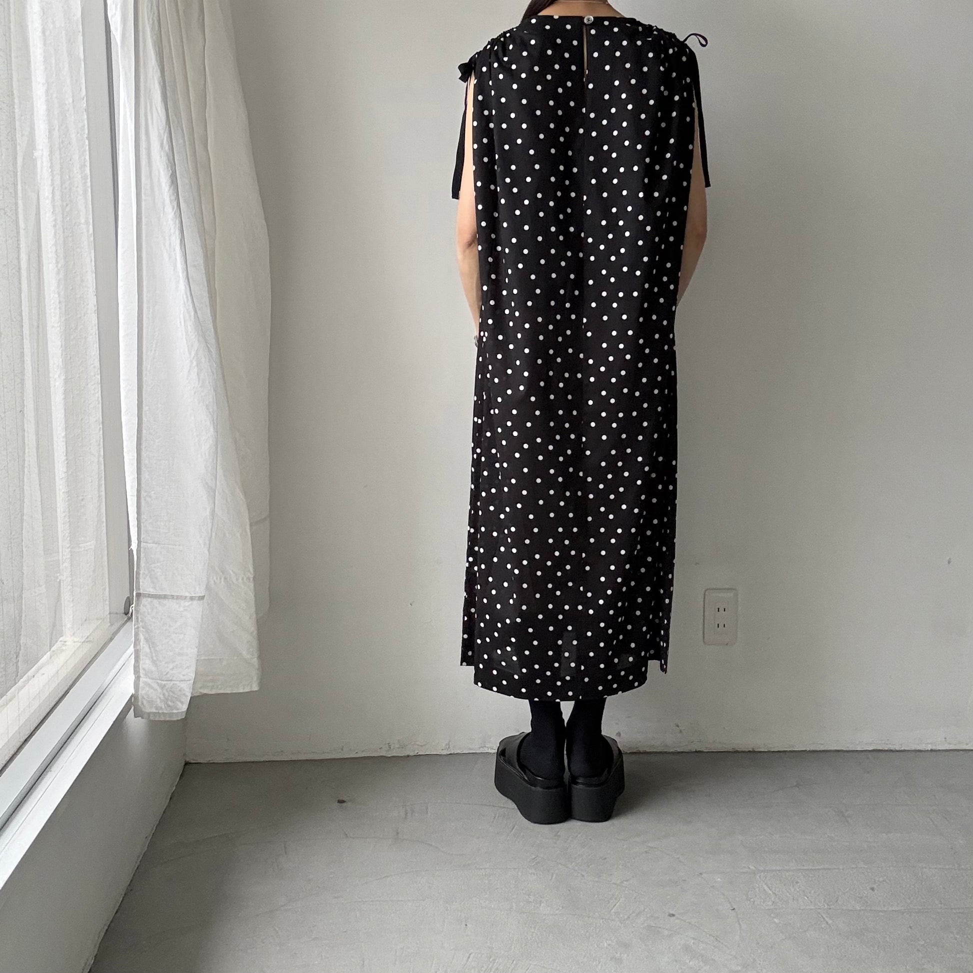 コットン水玉ショルダーリボンワンピース。