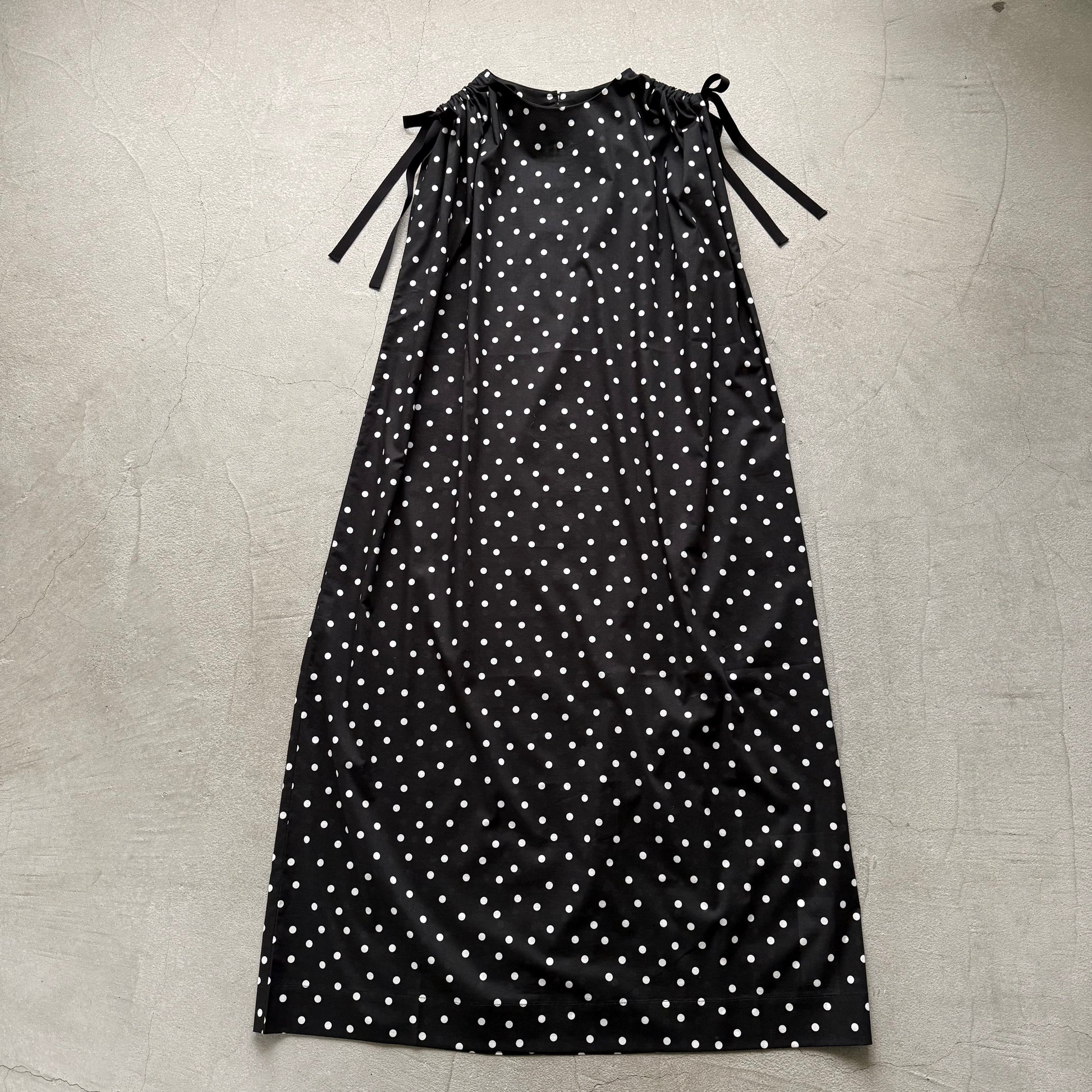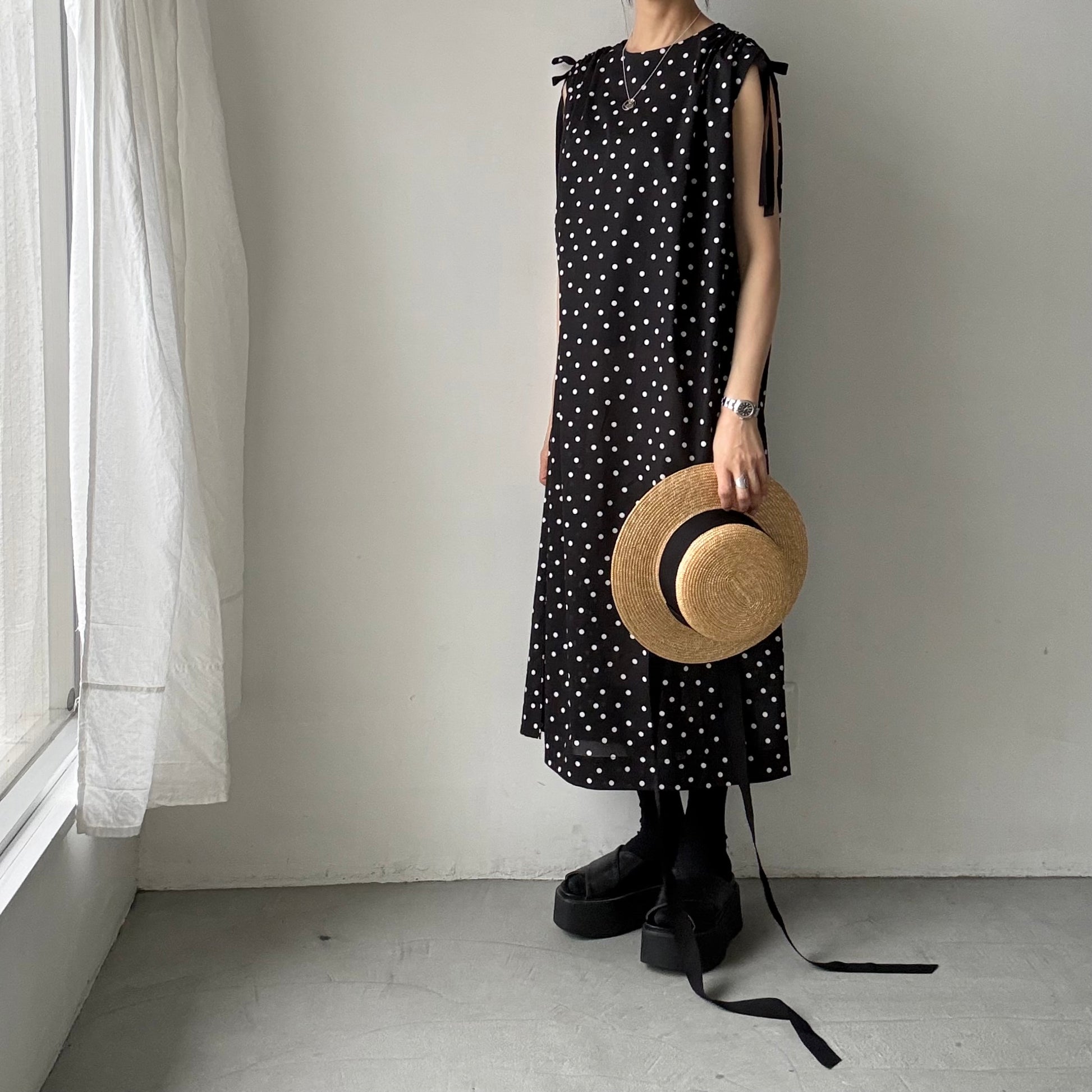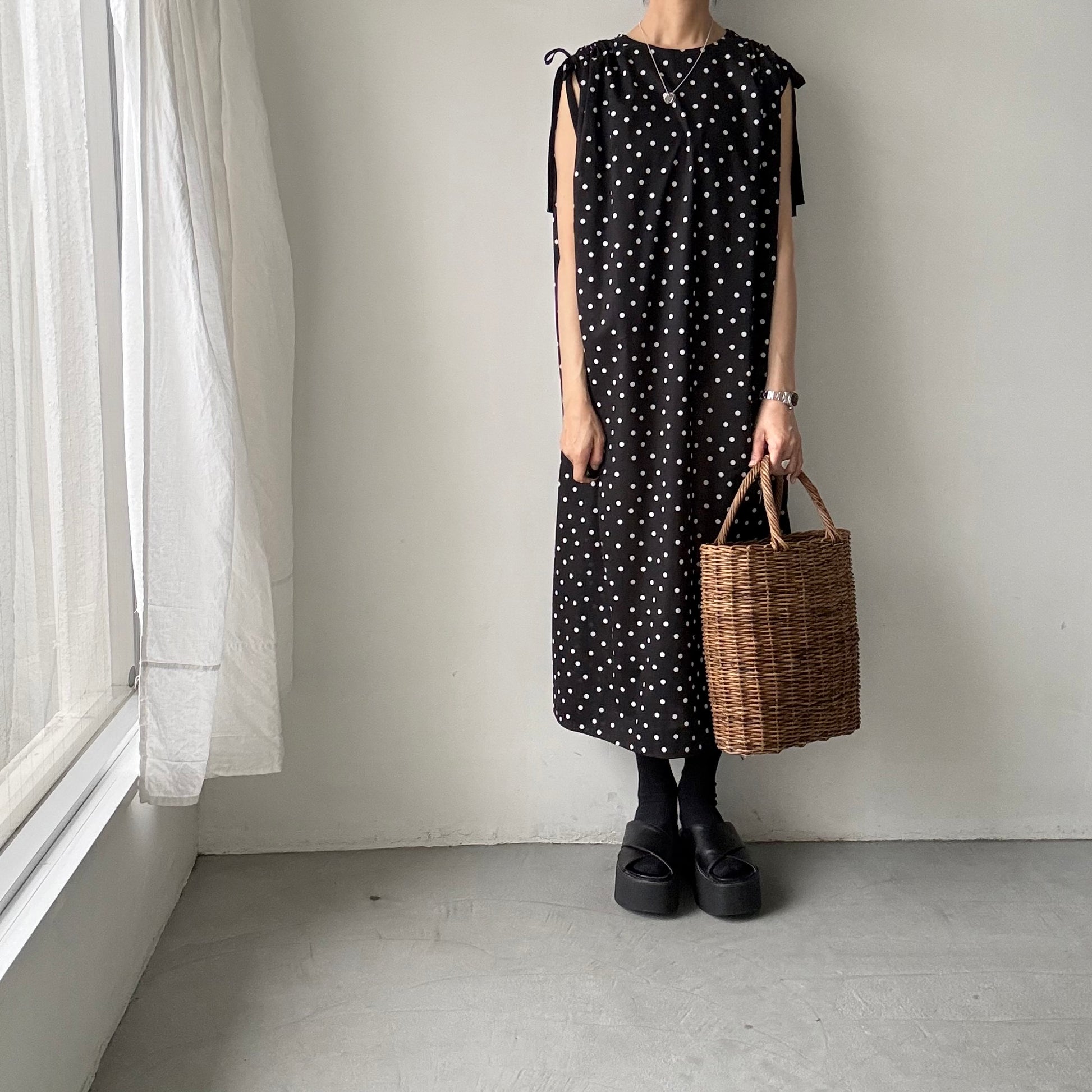 コットン水玉ショルダーリボンワンピース。