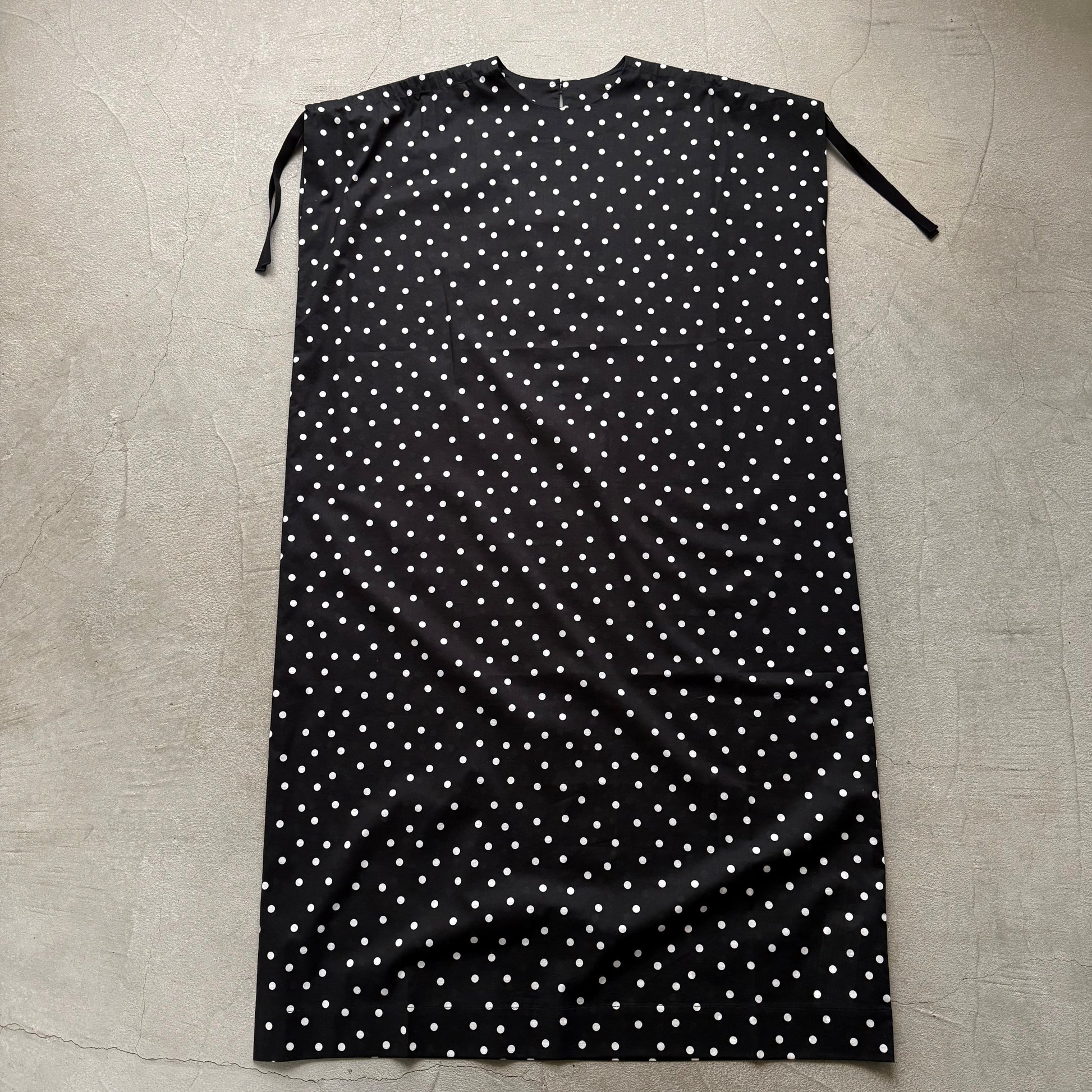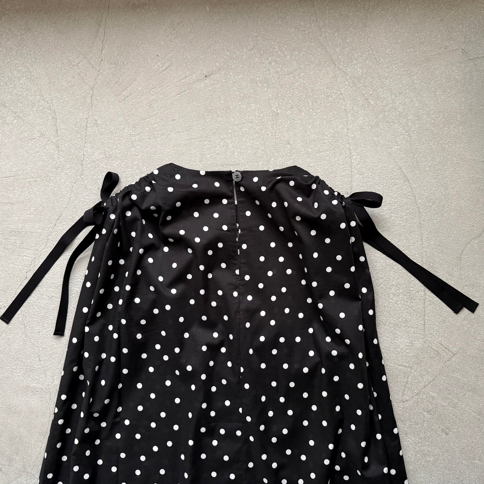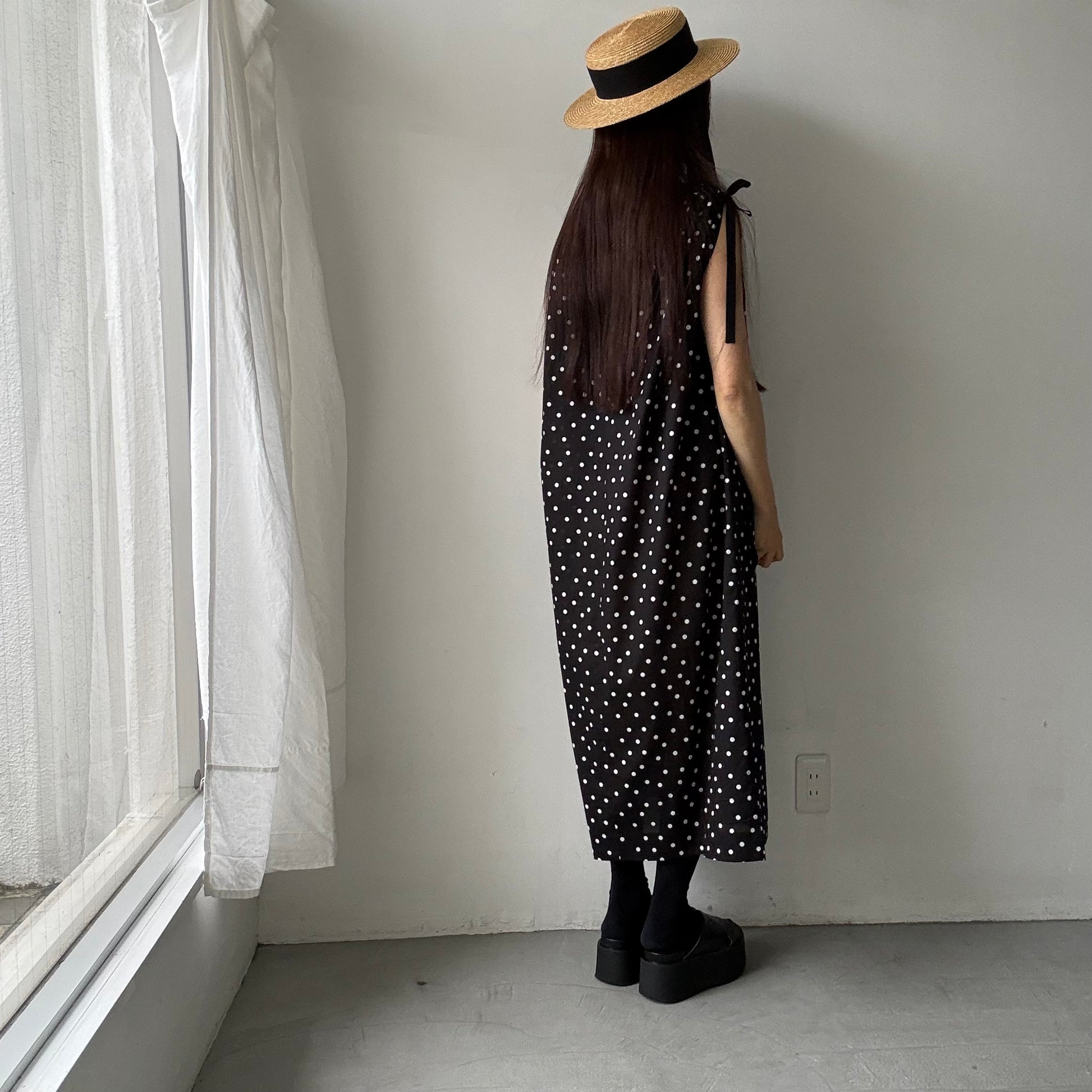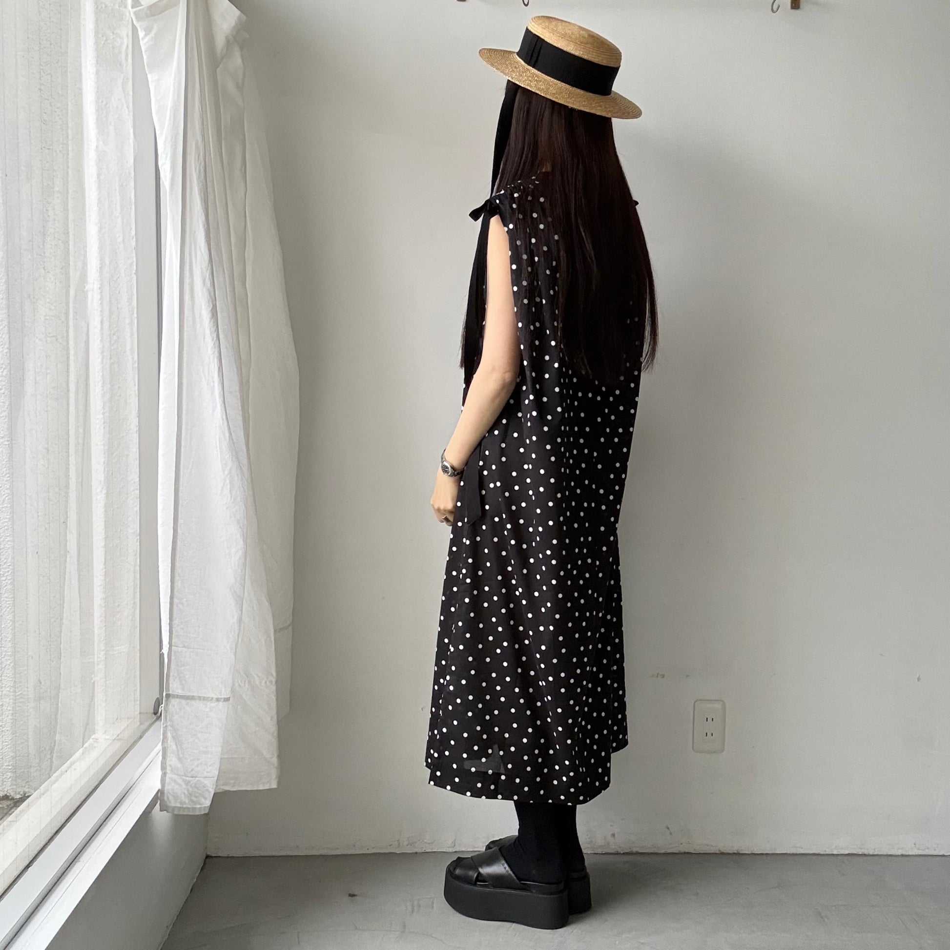 コットン水玉ショルダーリボンワンピース。