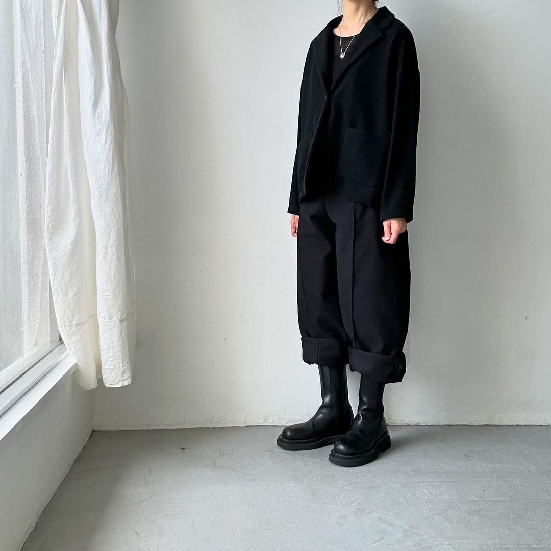 柔らかで軽いウール 生地。裏地はありませんがチクチクしません。ジャケットとしての存在感を保ちながらカーディガンのように気軽に着ていただけるのも魅力の一つ。綺麗めに見せたりカジュアルダウンしたり。自由自在にコーディネートが組める優秀な形です。