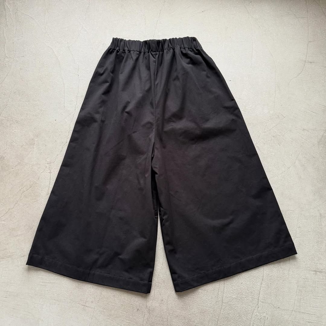 ウエストから裾に向けて直線的に広がるシルエットが美しいパンツ。ウエスト周りはすっきりめに。裾幅がとても広いデザインです。