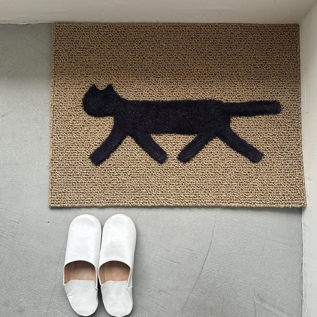 ベースは麻のループ。ウールで織られているイヌ、ネコの部分が立体的に浮き上がっているのが特徴です。 玄関マット、室内用マットとしてもお使いいただけます。