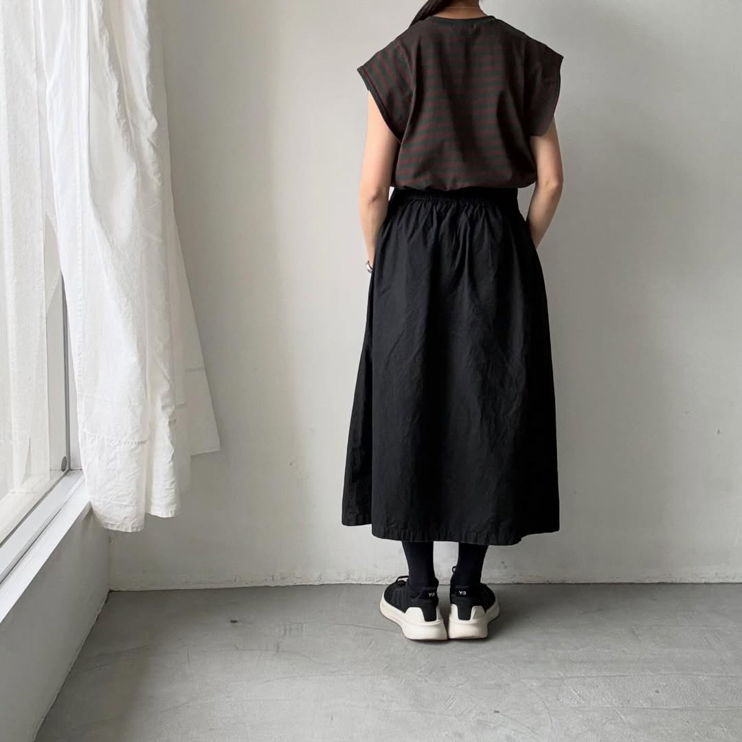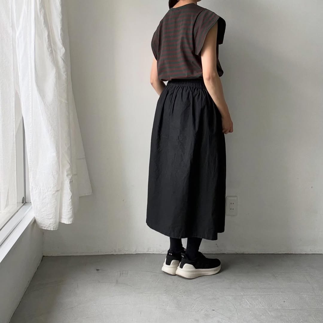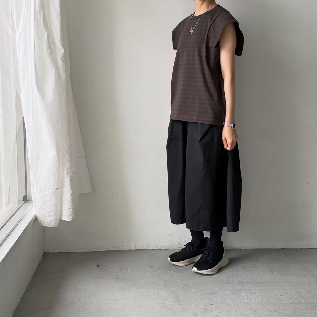 ノースリーブの上にスクエアの袖が載るようなデザイン。肩線を露わにしないので1枚着しやすく、真夏の暑い時期に活躍してくれそうです。天竺素材なので上に薄手のカーディガンを着ても袖が表に響きにくいです。
