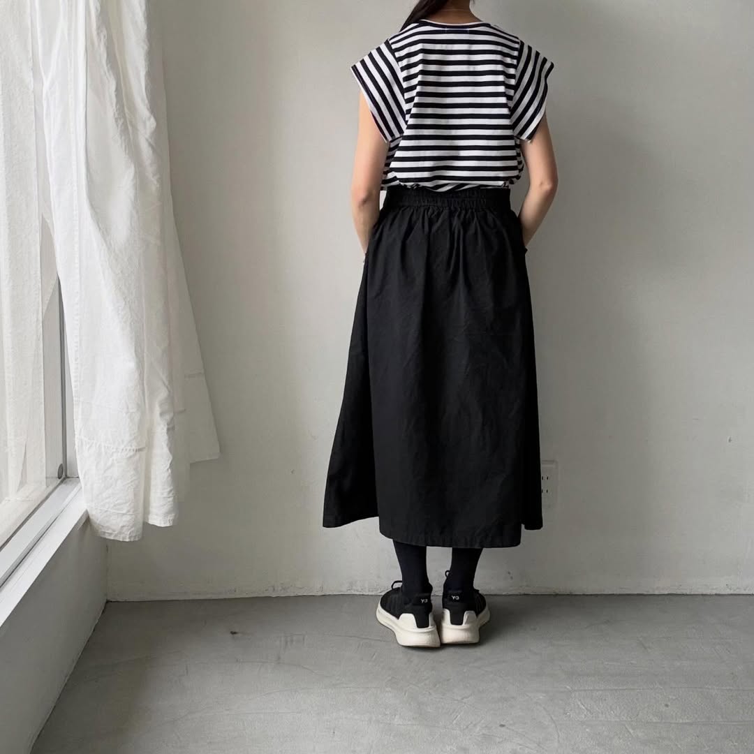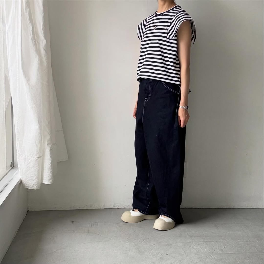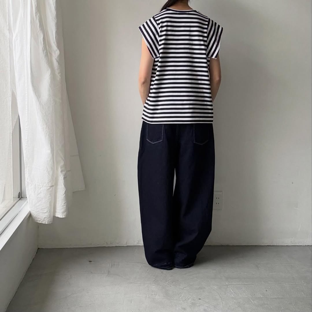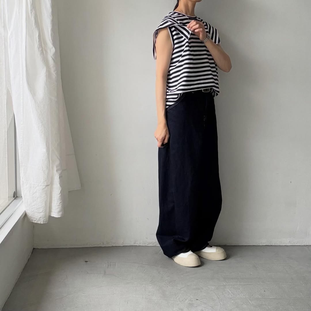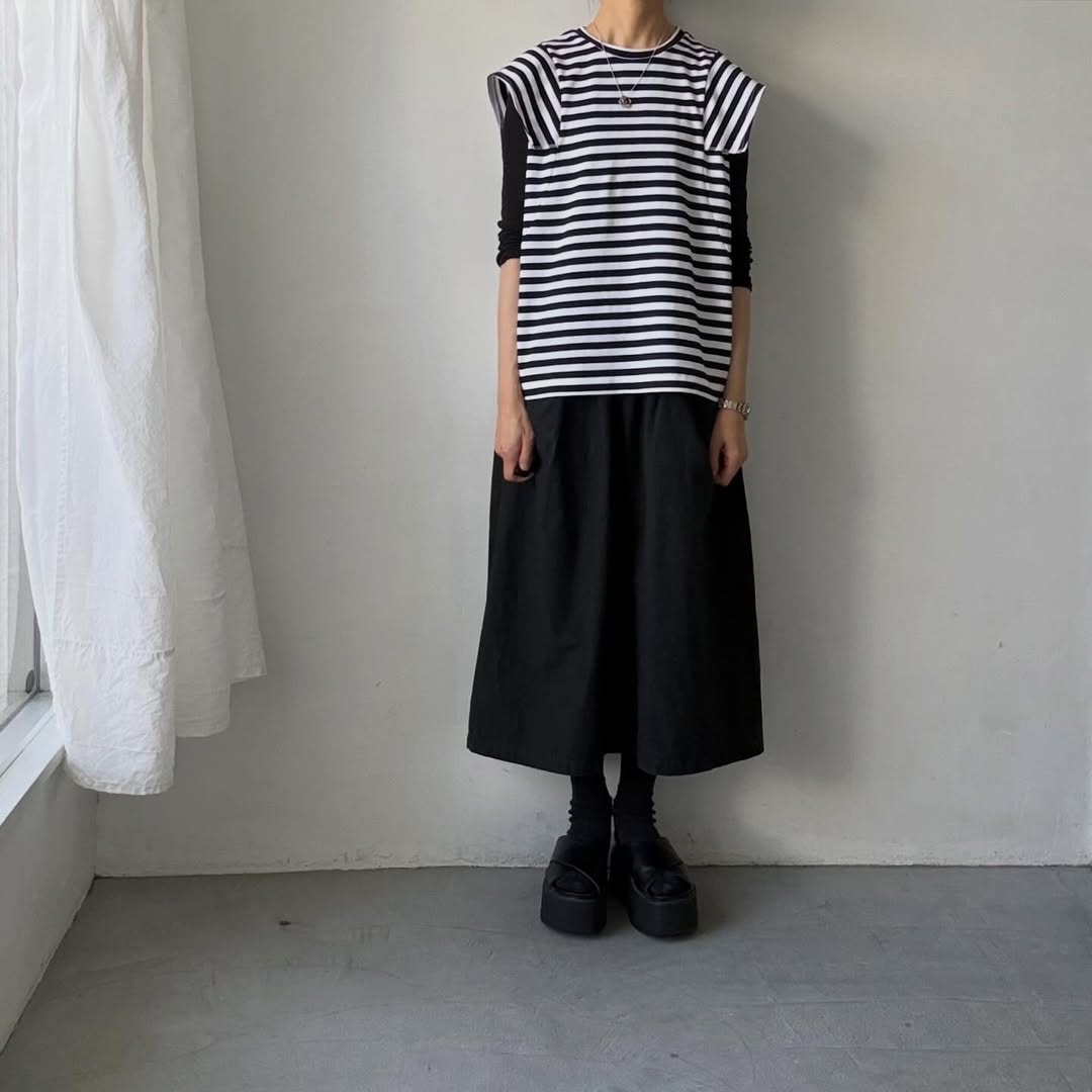 ノースリーブの上にスクエアの袖が載るようなデザイン。肩線を露わにしないので1枚着しやすく、真夏の暑い時期に活躍してくれそうです。天竺素材なので上に薄手のカーディガンを着ても袖が表に響きにくいです。