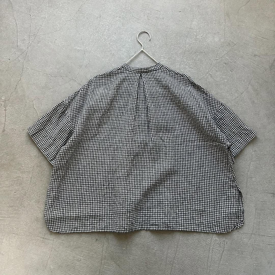 白黒ギンガムチェックのリネンのヘンリーネックプルオーバー。