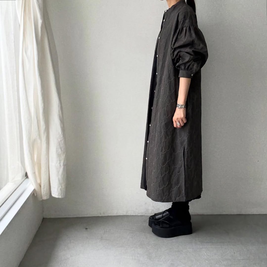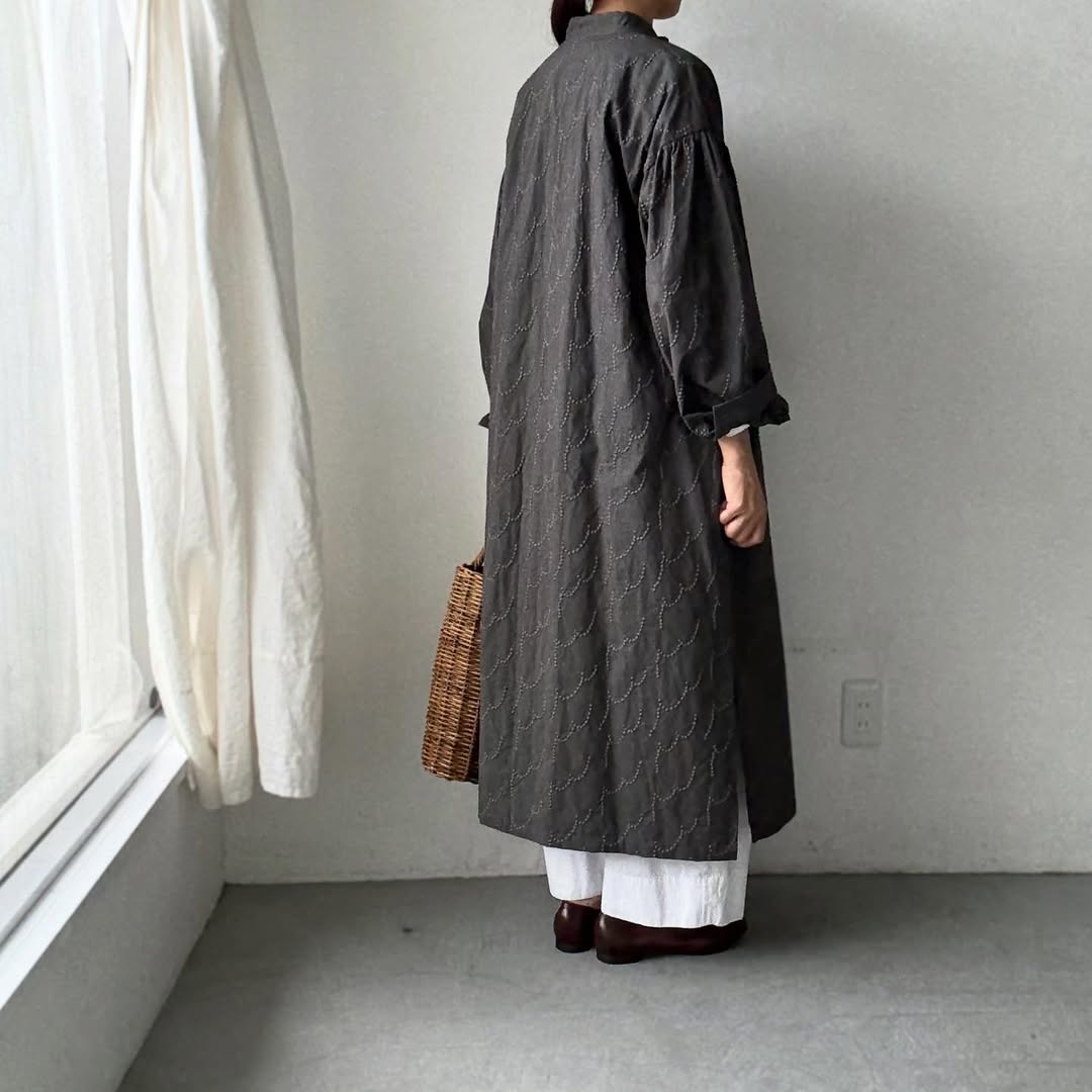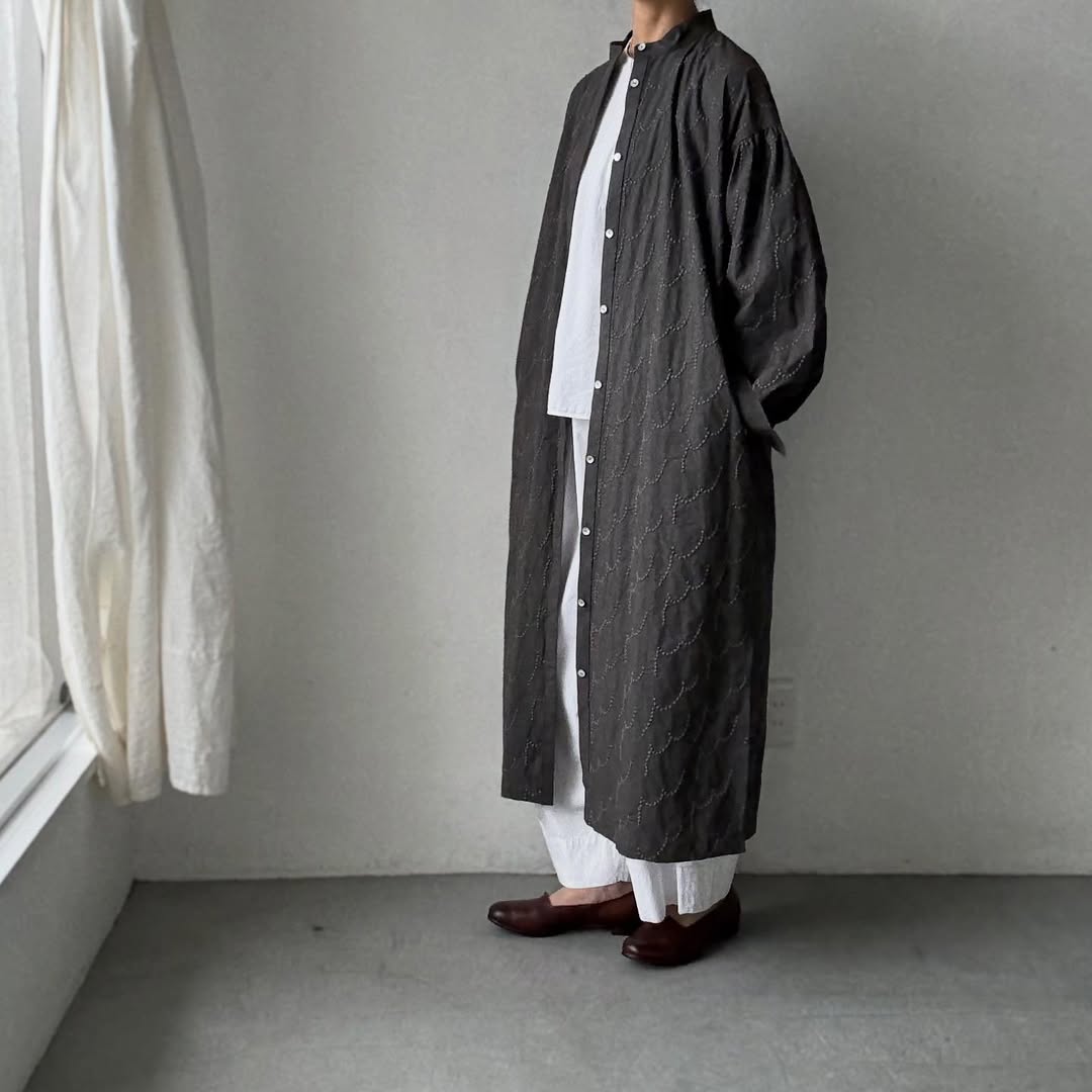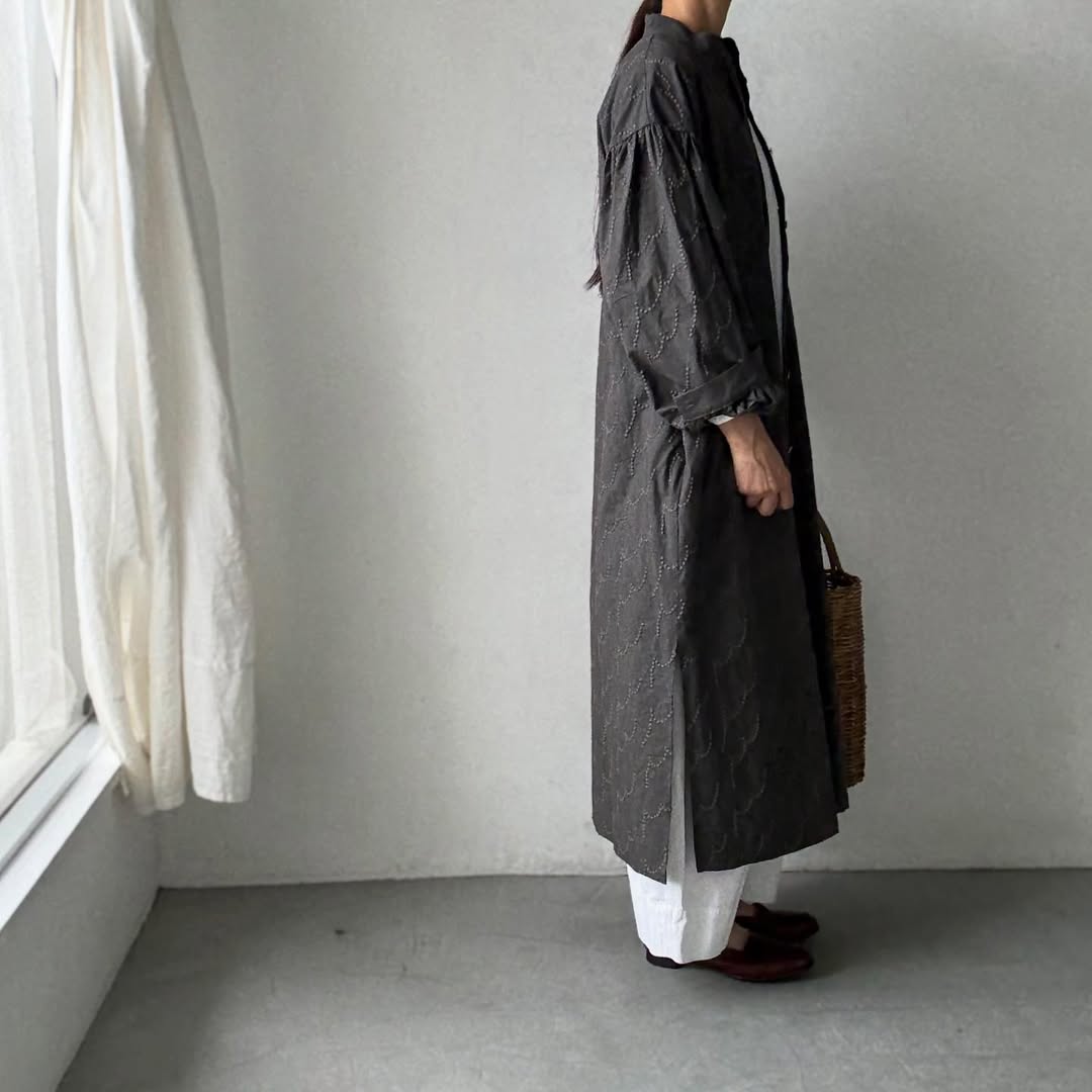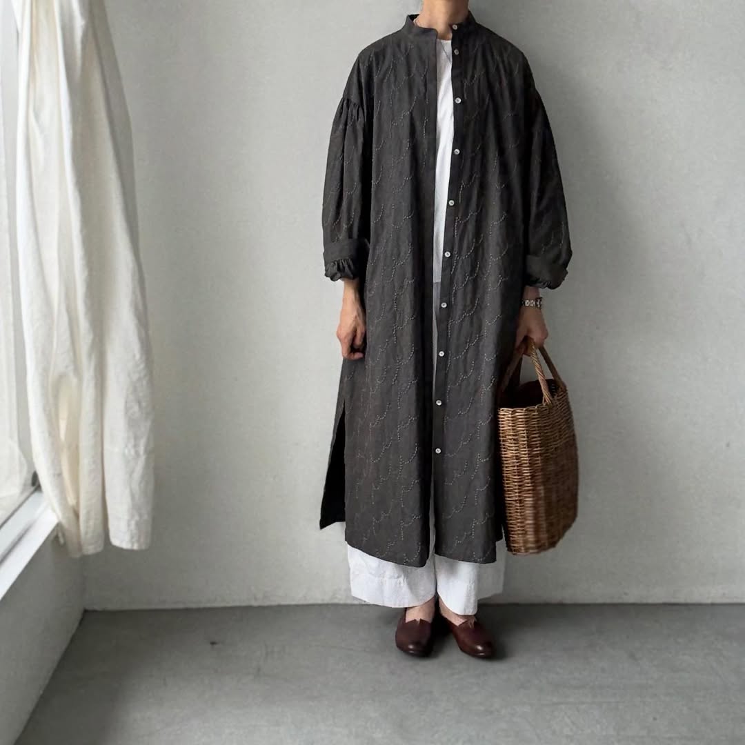 両サイドにスリットが入っているので、中にパンツやスカートを合わせて着用します。歩く度にスリットが開いて軽快な印象です。前は全開するので軽いコートのようにもお使いいただけます。
