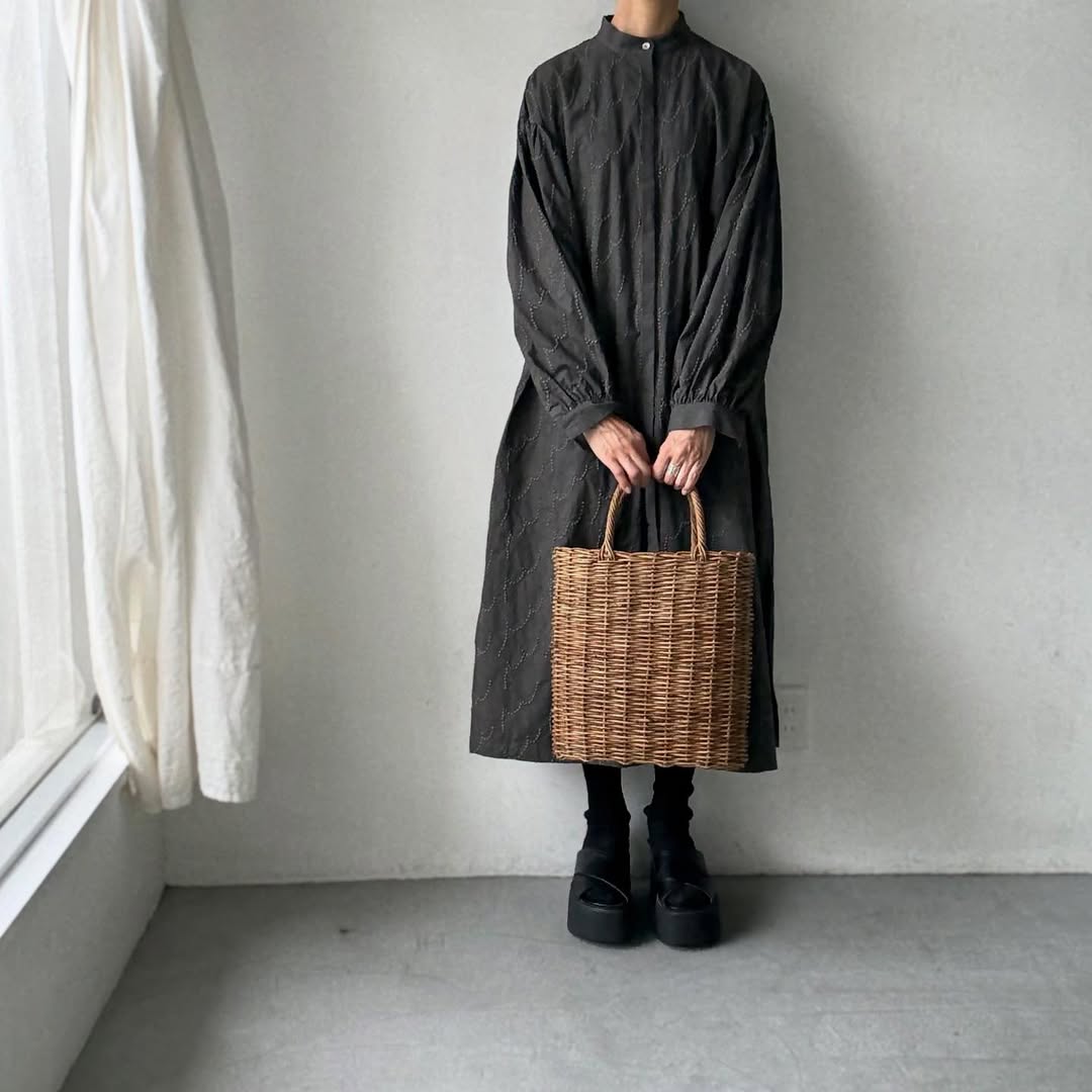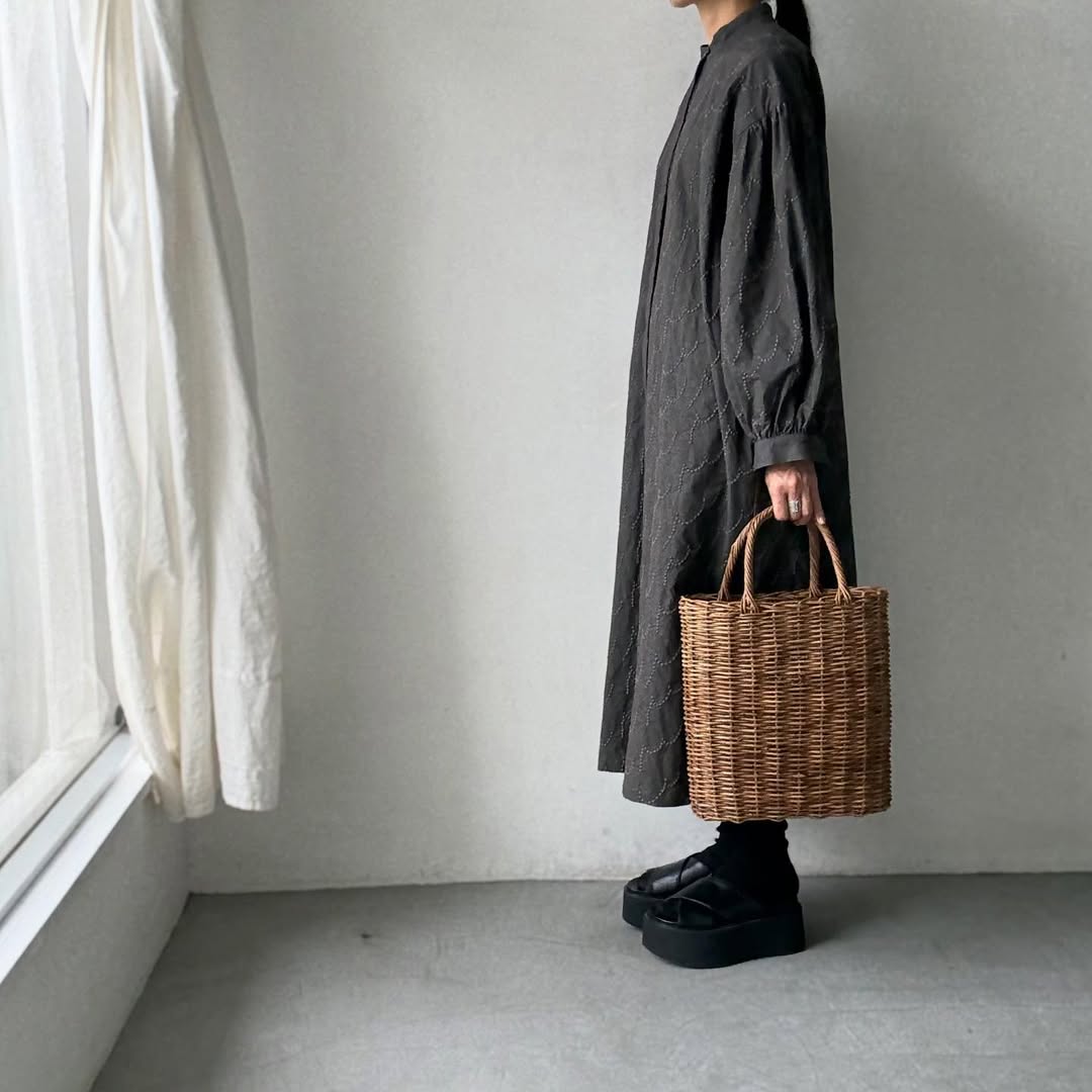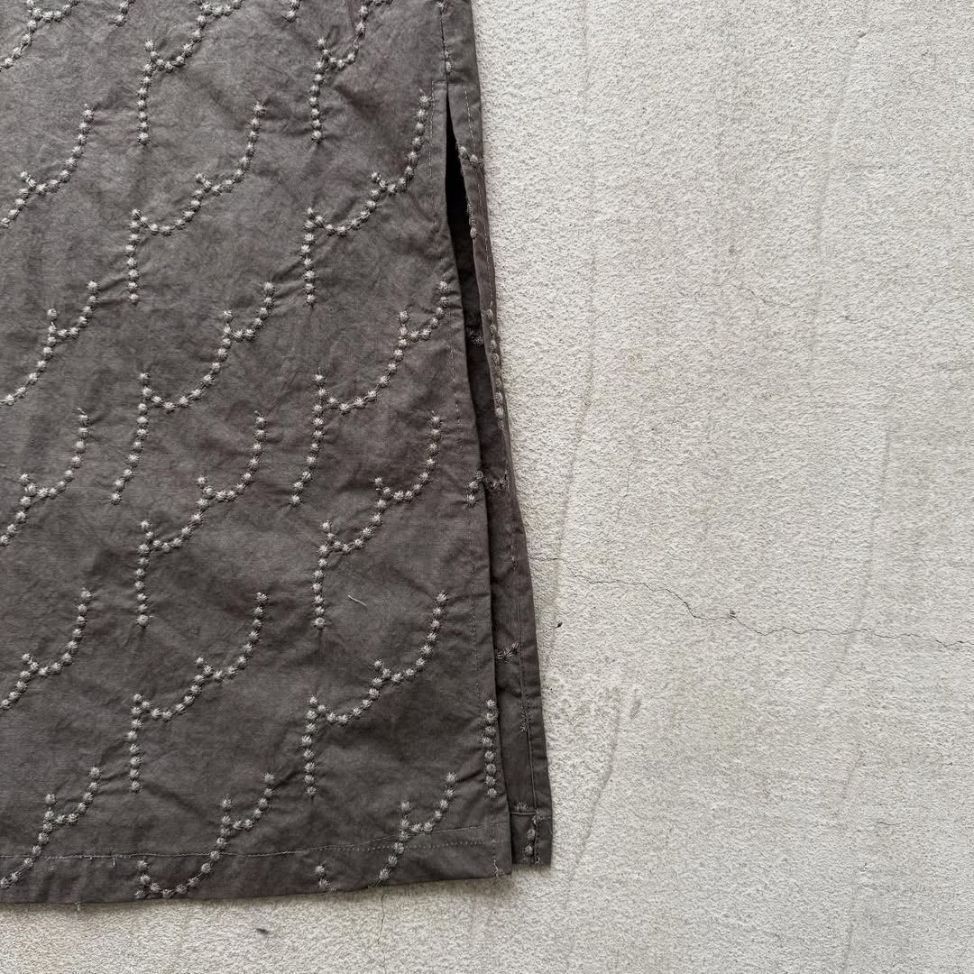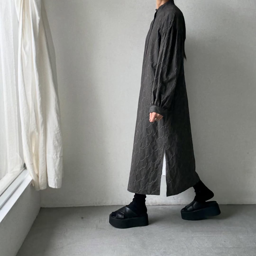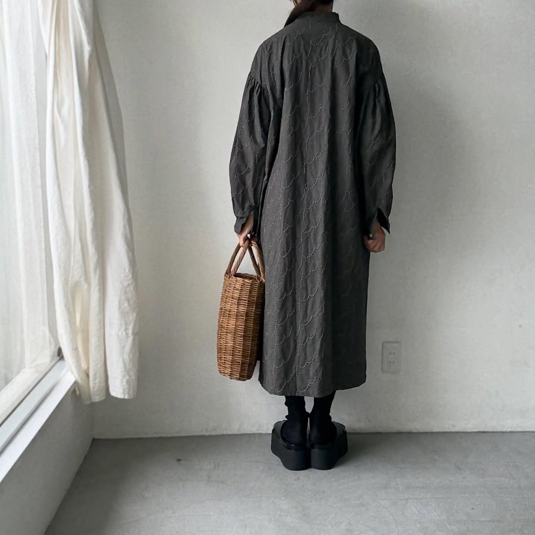 両サイドにスリットが入っているので、中にパンツやスカートを合わせて着用します。歩く度にスリットが開いて軽快な印象です。前は全開するので軽いコートのようにもお使いいただけます。