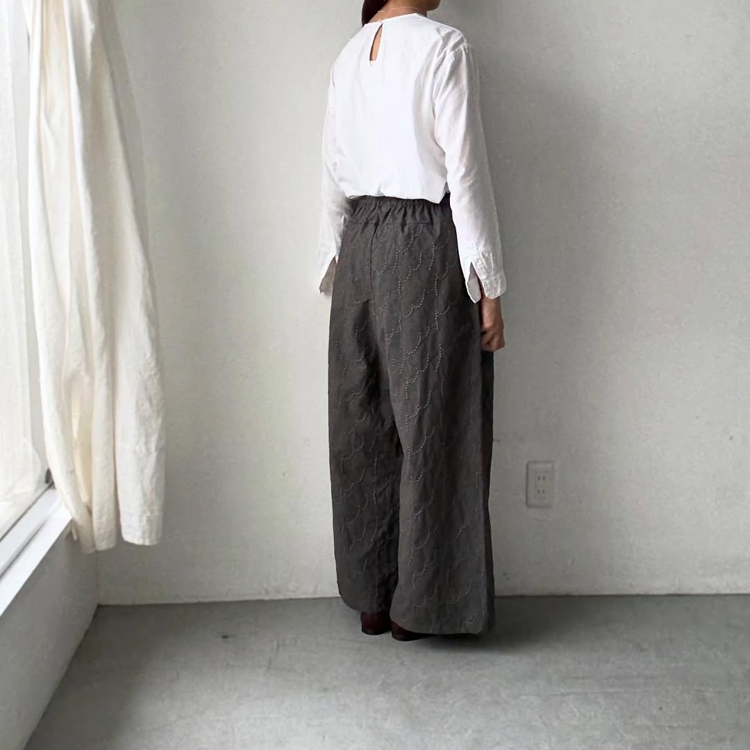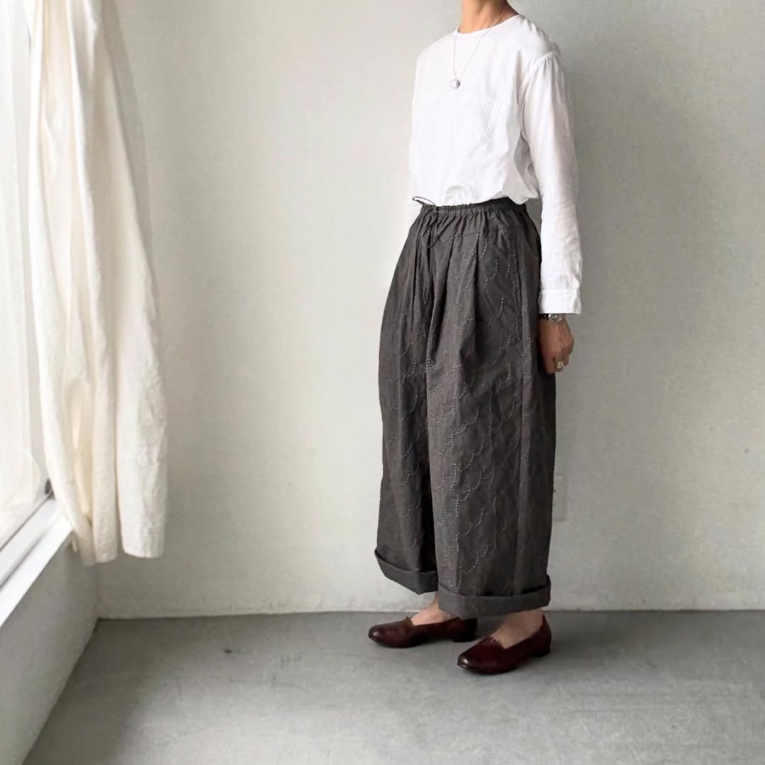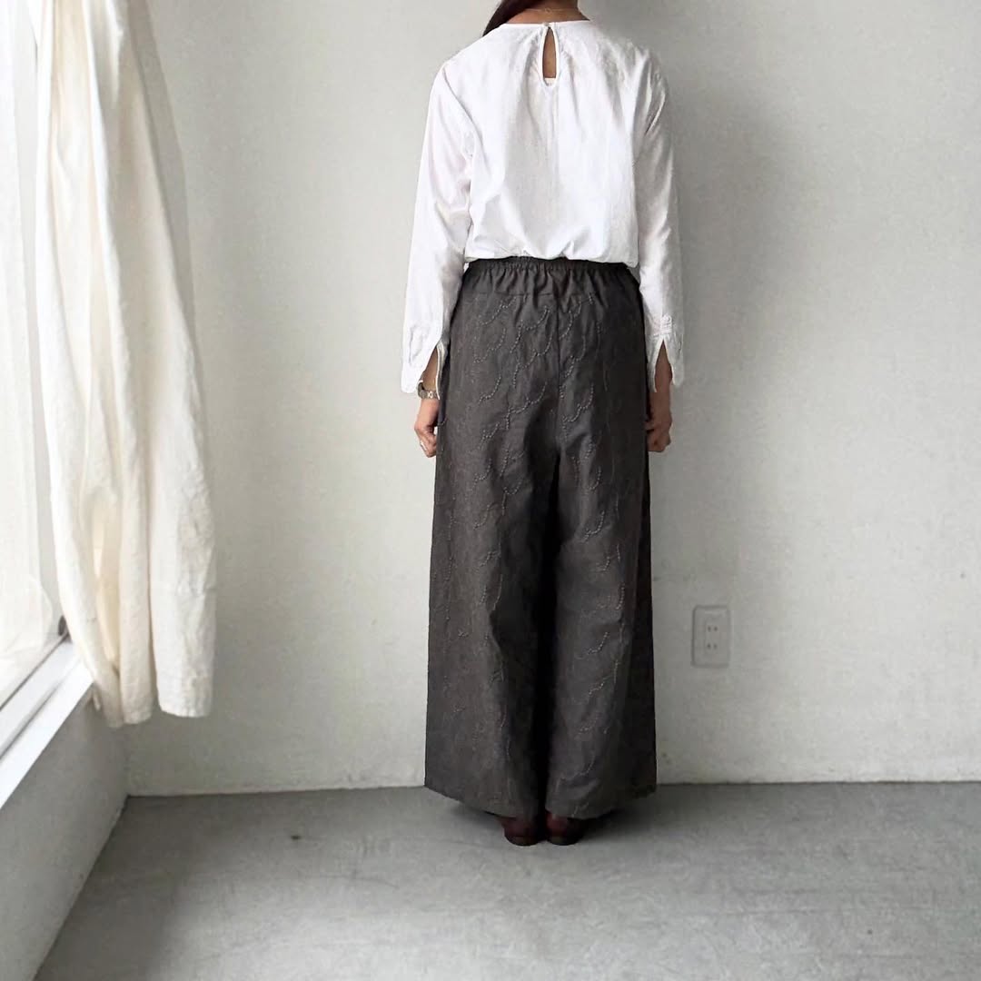ゴム下には切替があり、その下はタックなので腰回りにボリュームが出ずに綺麗に裾に向けて広がるシルエットです。