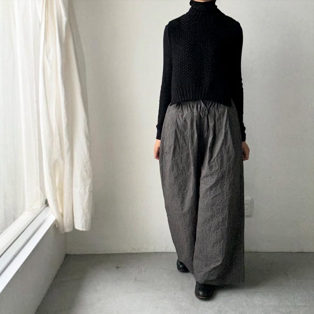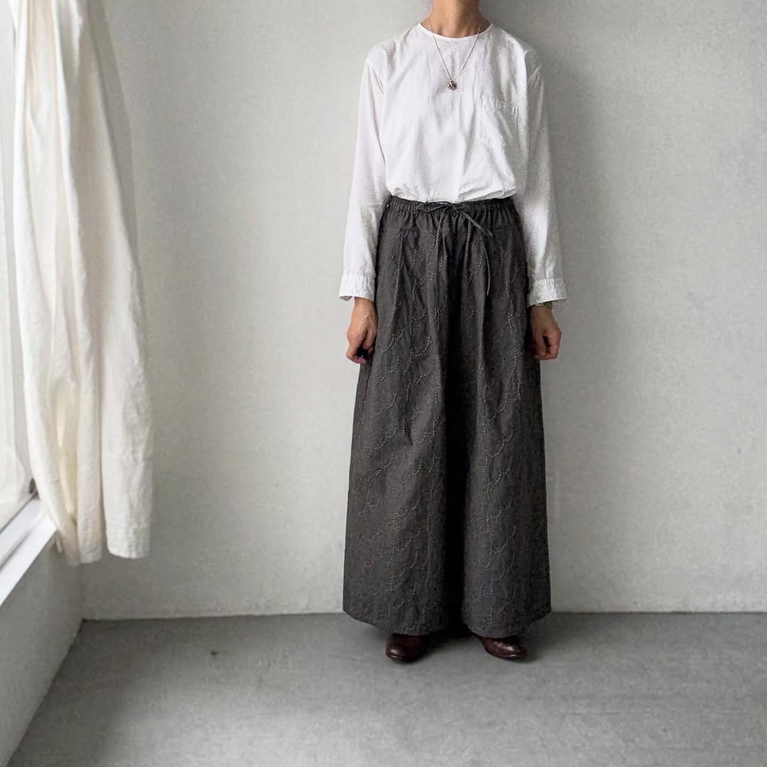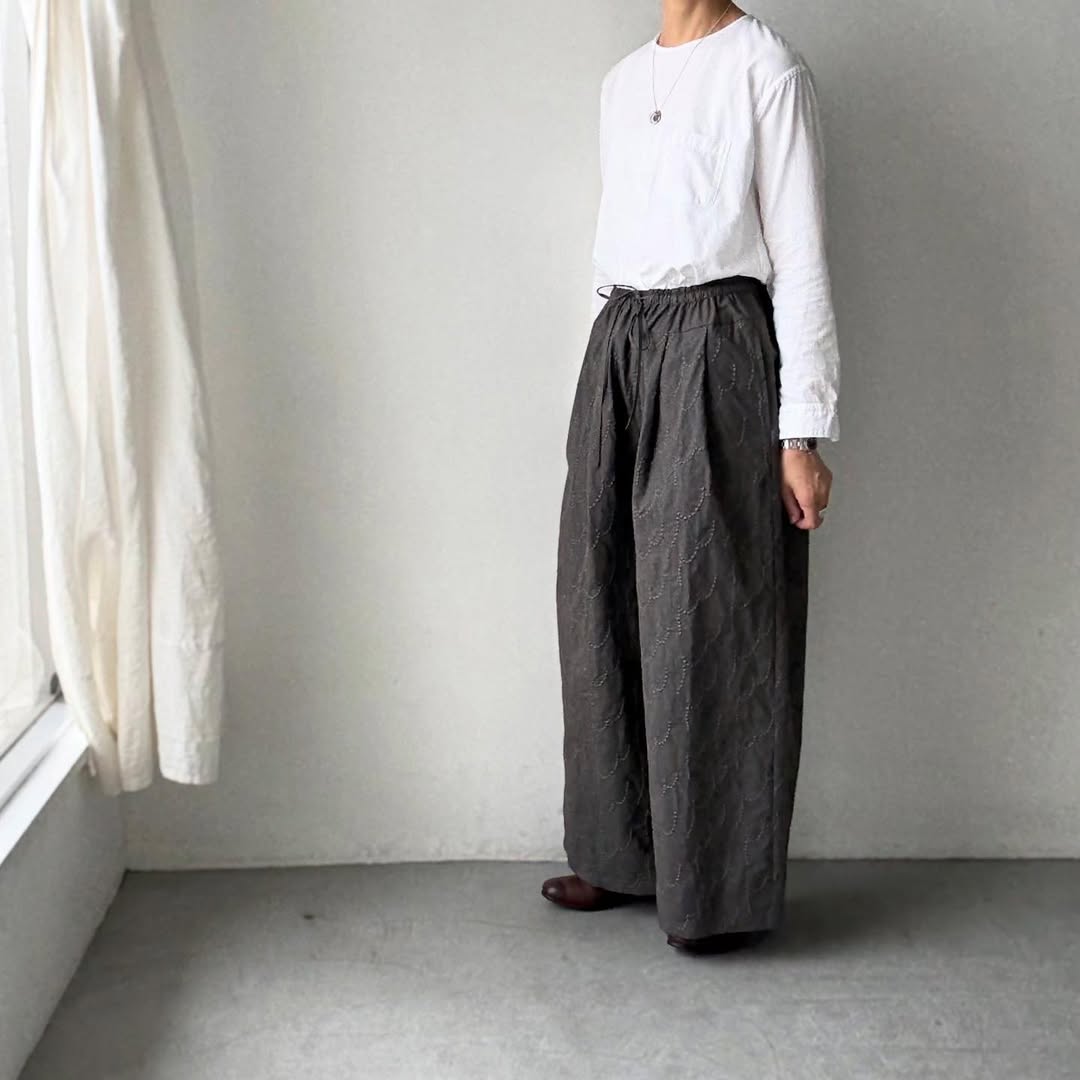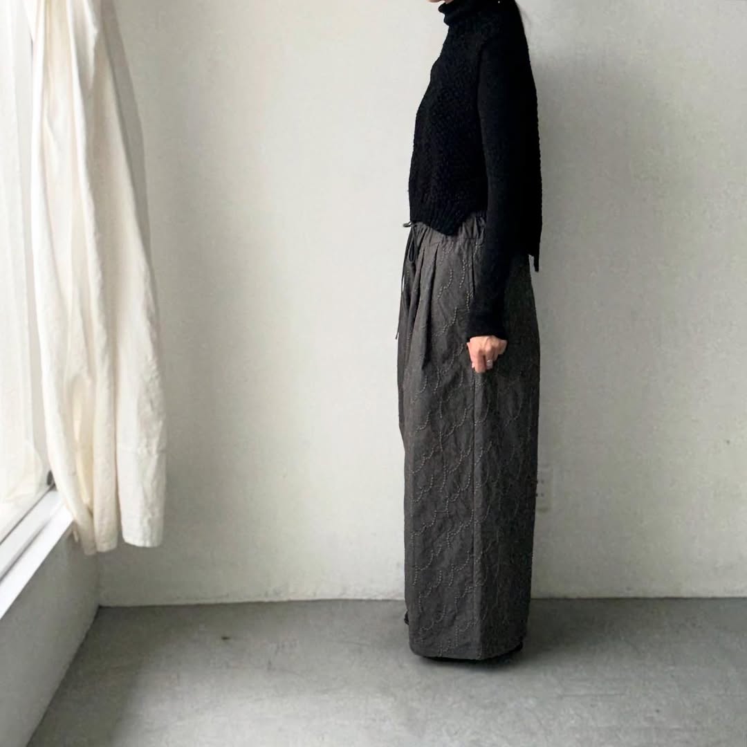 ゴム下には切替があり、その下はタックなので腰回りにボリュームが出ずに綺麗に裾に向けて広がるシルエットです。