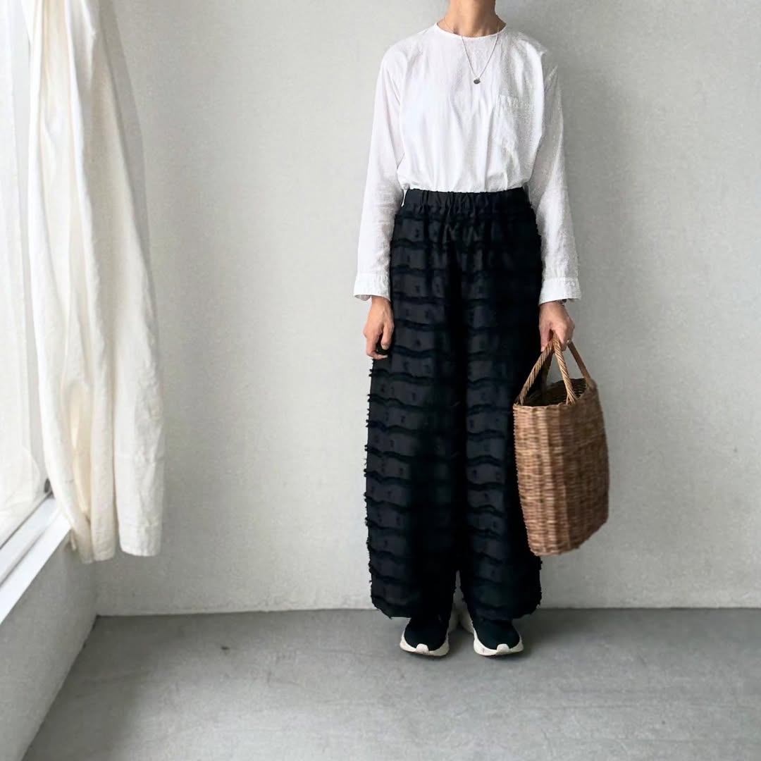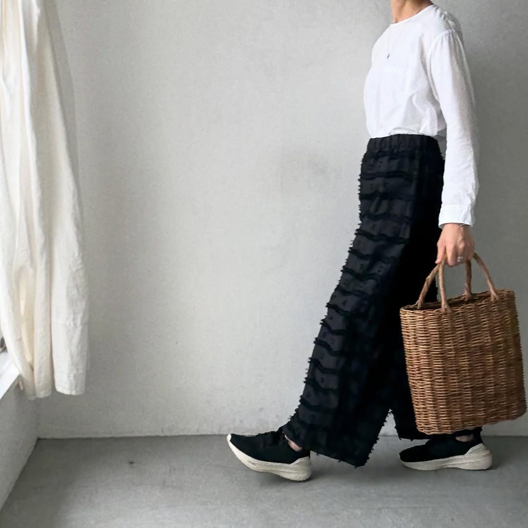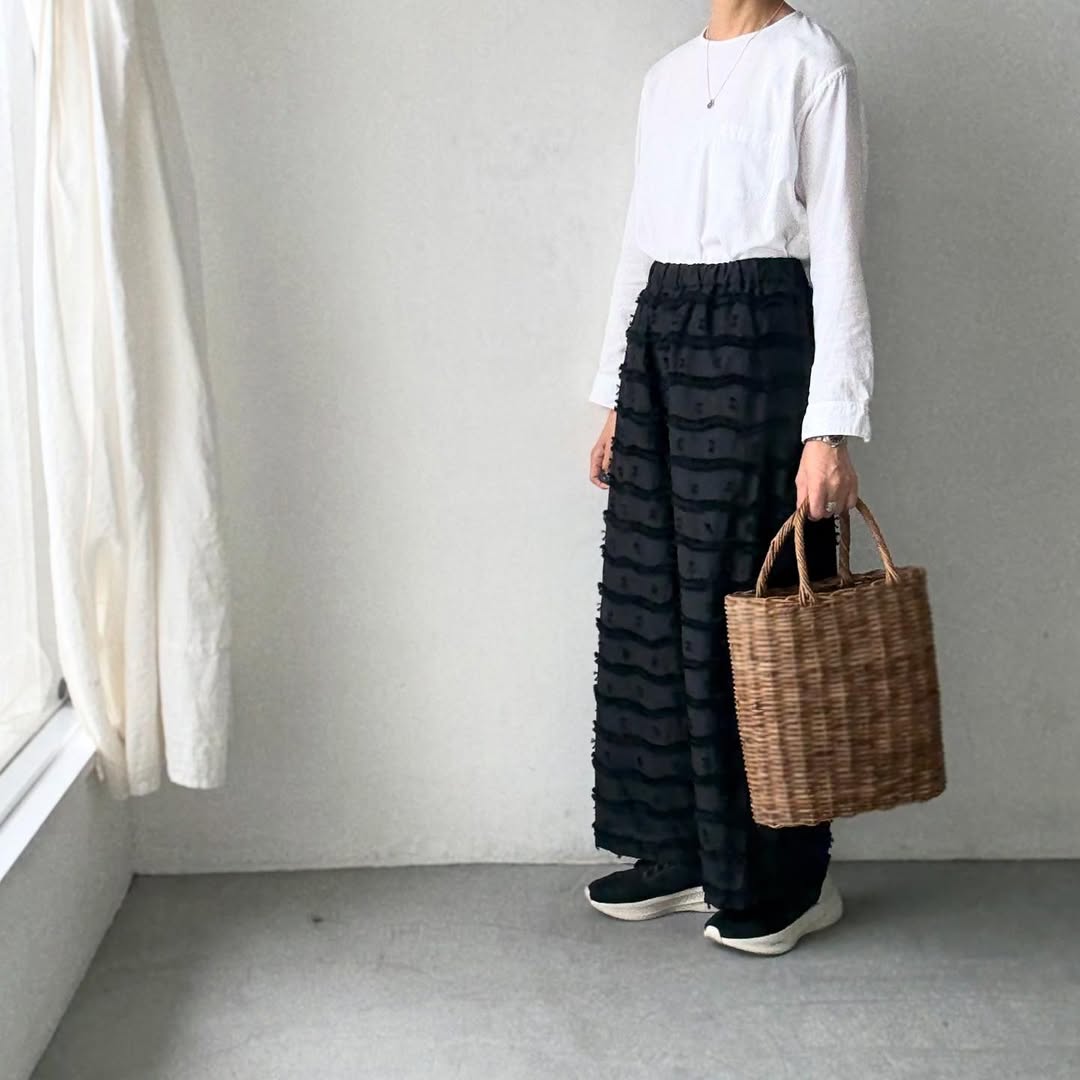 太めのワイドパンツはトップスをコンパクトにまとめるとバランス良くコーディネートが出来そうです。