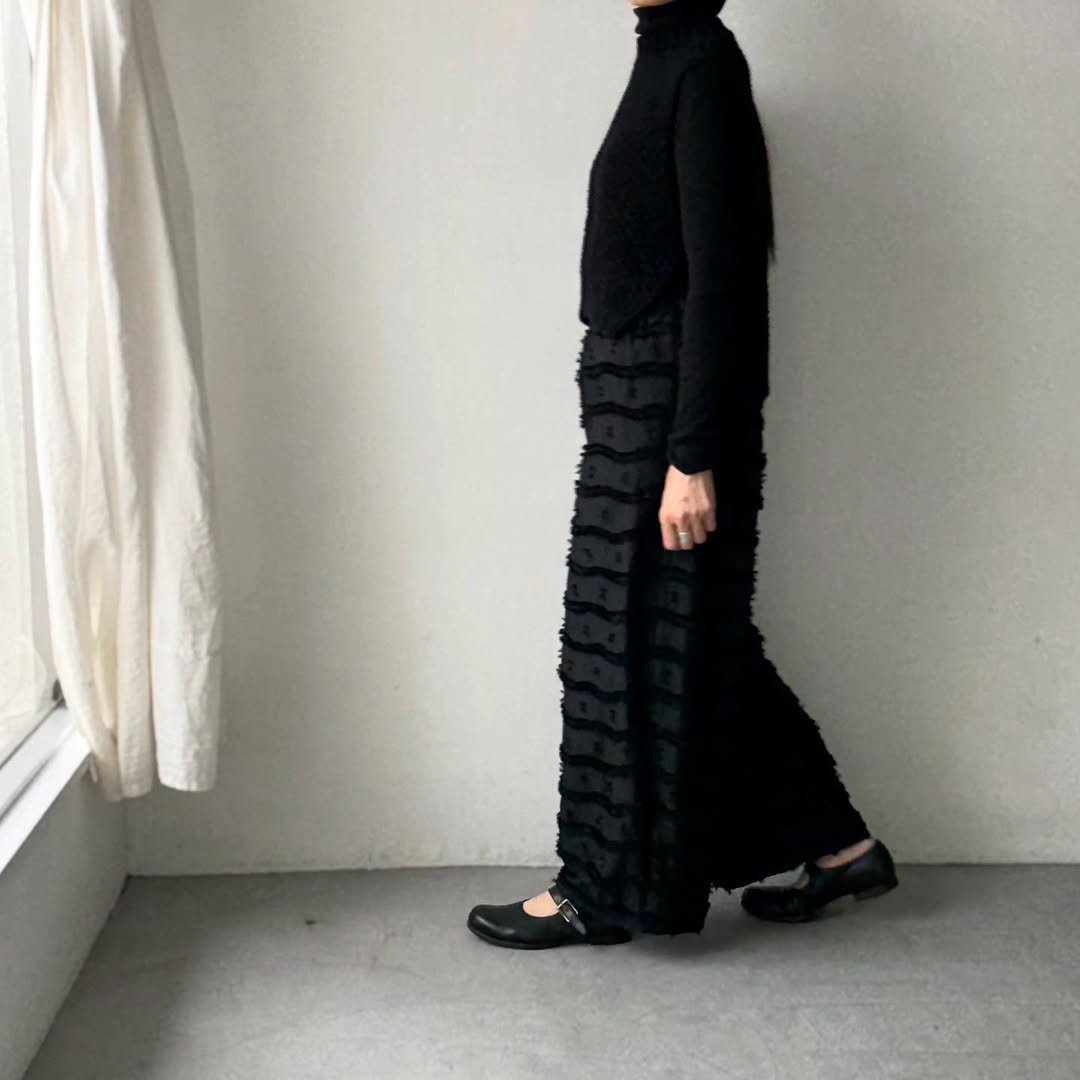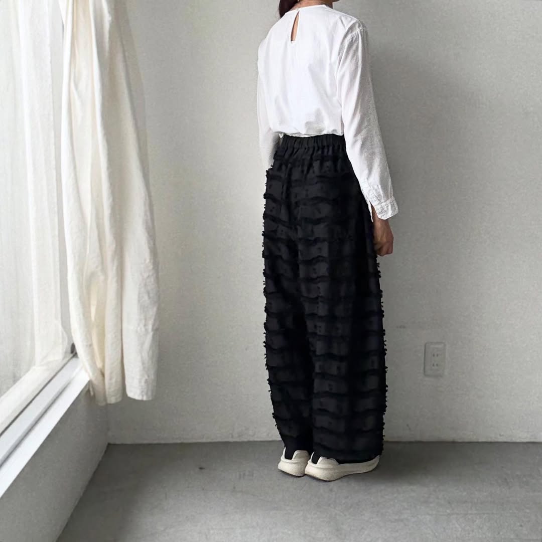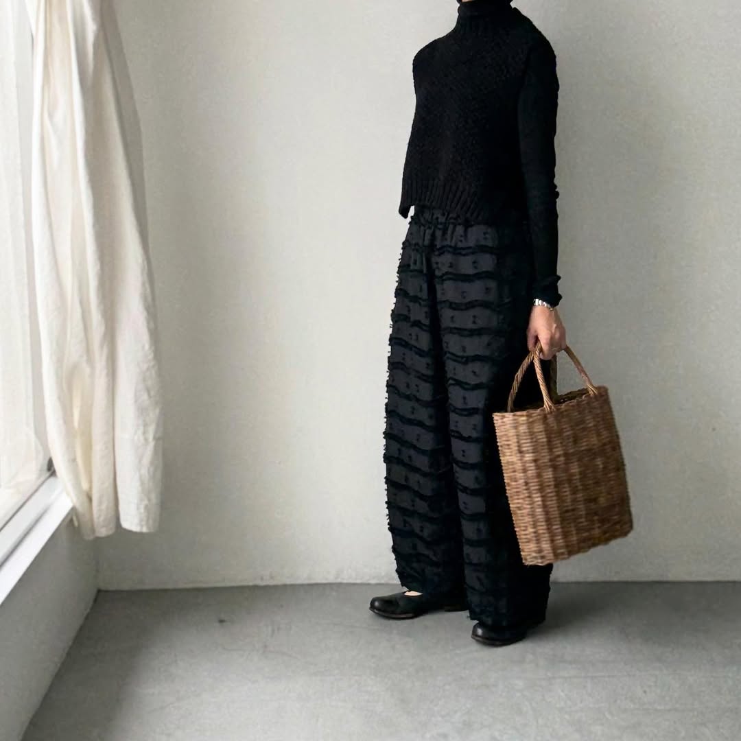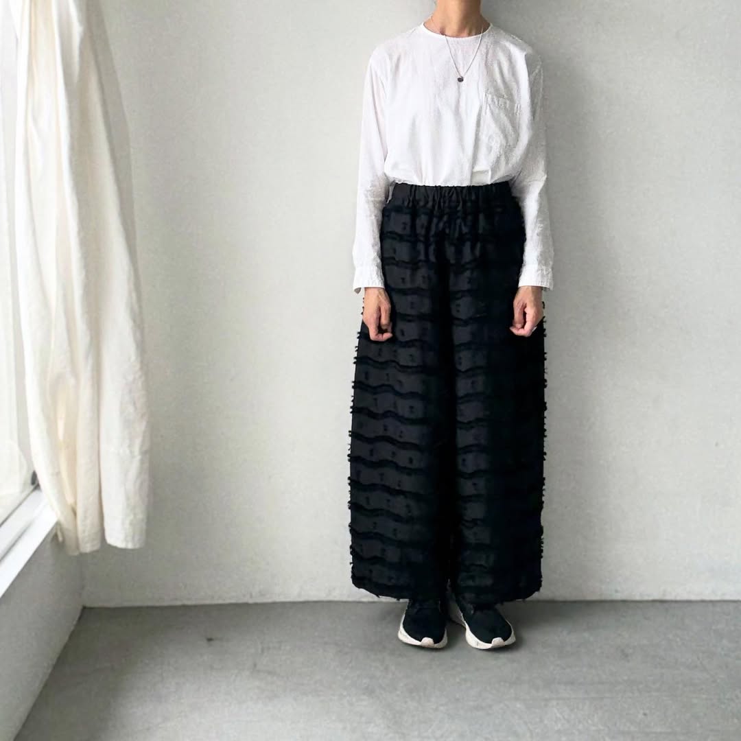 太めのワイドパンツはトップスをコンパクトにまとめるとバランス良くコーディネートが出来そうです。