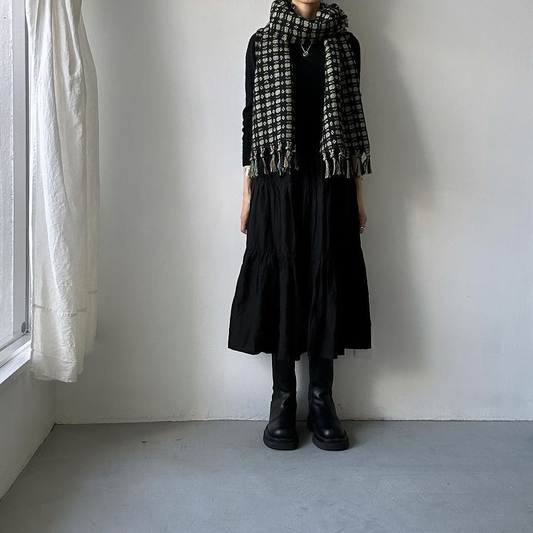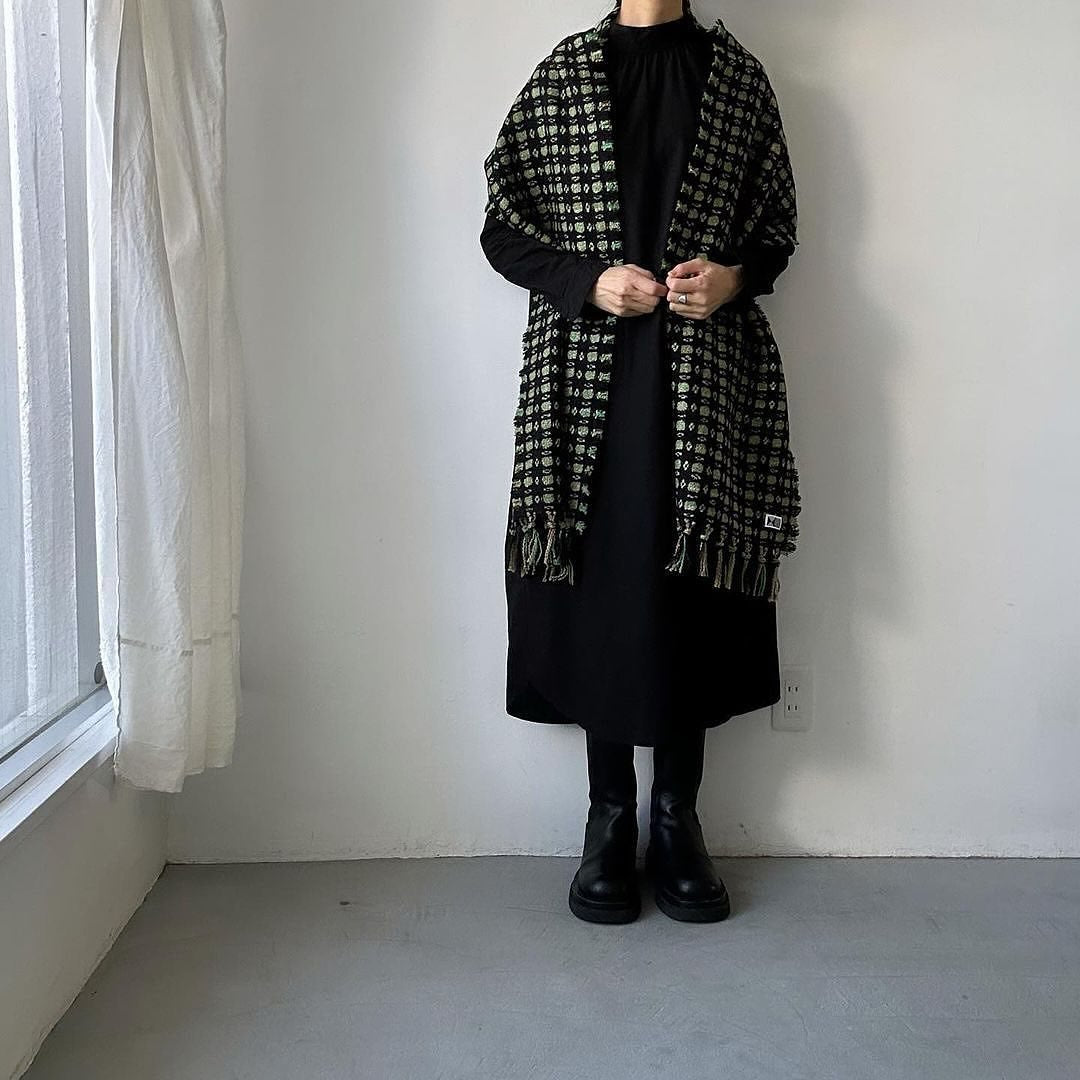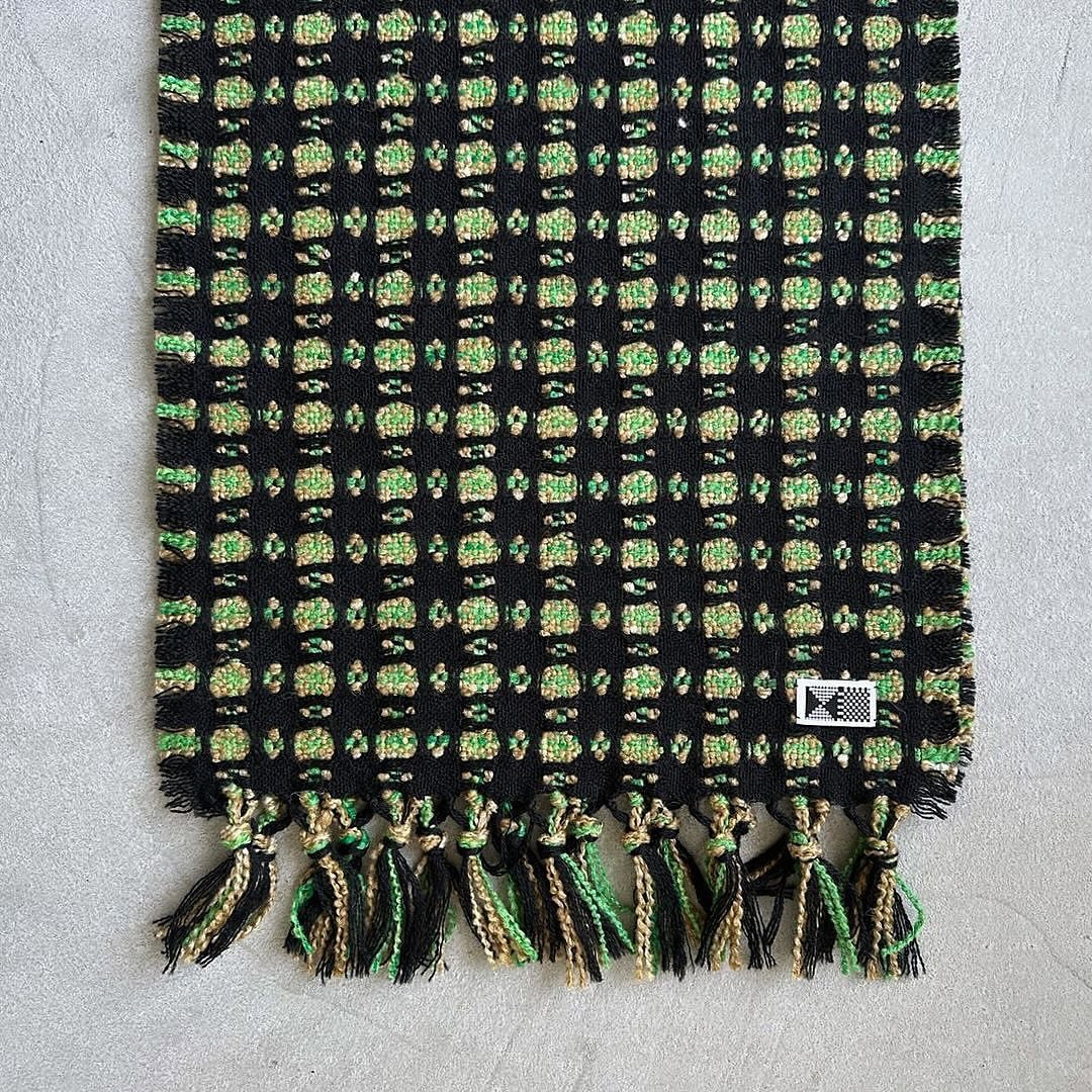 ブラックの宝石箱の中のエメラルドのような配色が素敵な柄です。滑らかな質感はウール、アクリル、シルクの混紡によるもの。