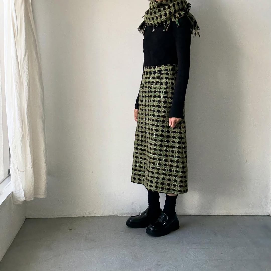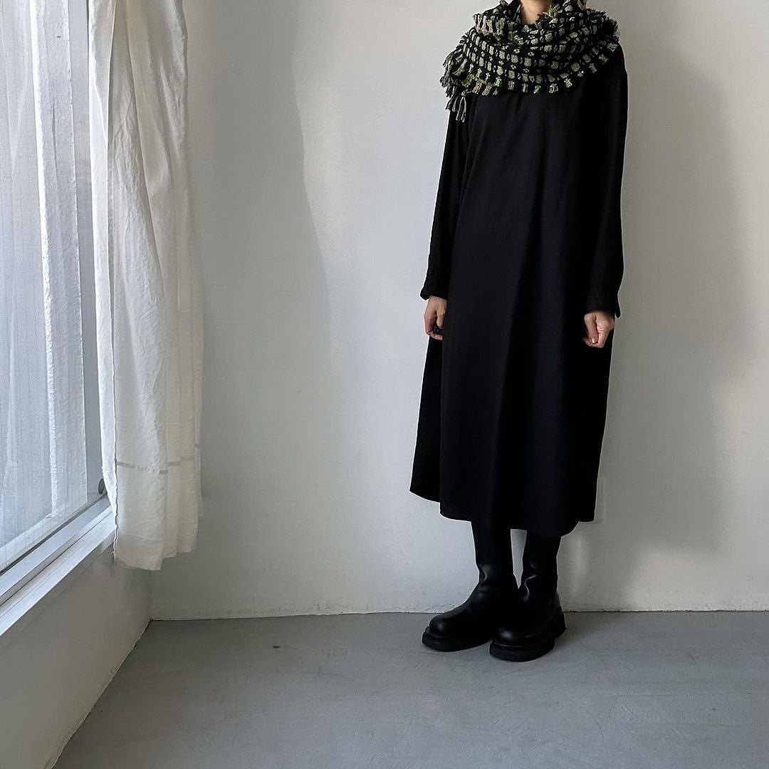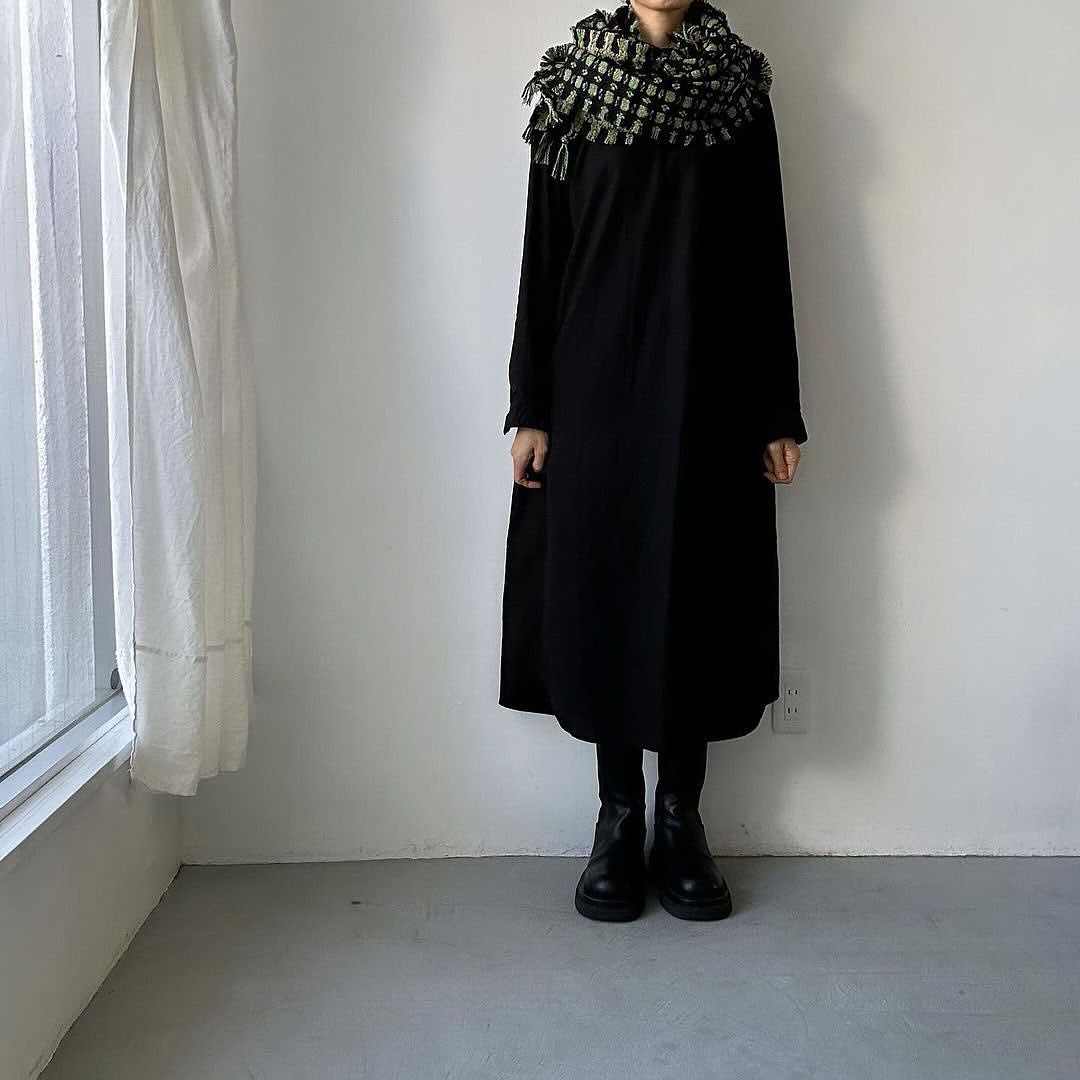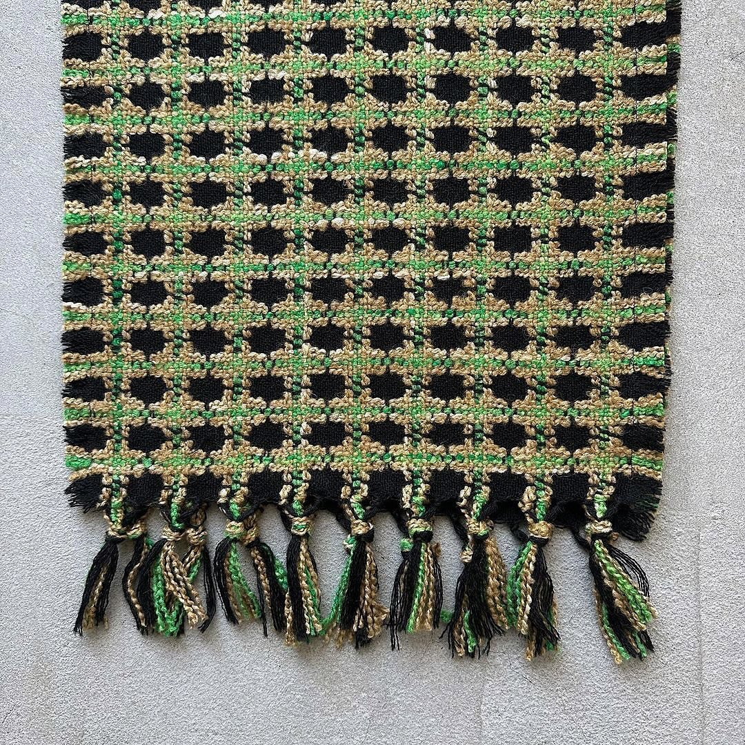 ブラックの宝石箱の中のエメラルドのような配色が素敵な柄です。滑らかな質感はウール、アクリル、シルクの混紡によるもの。