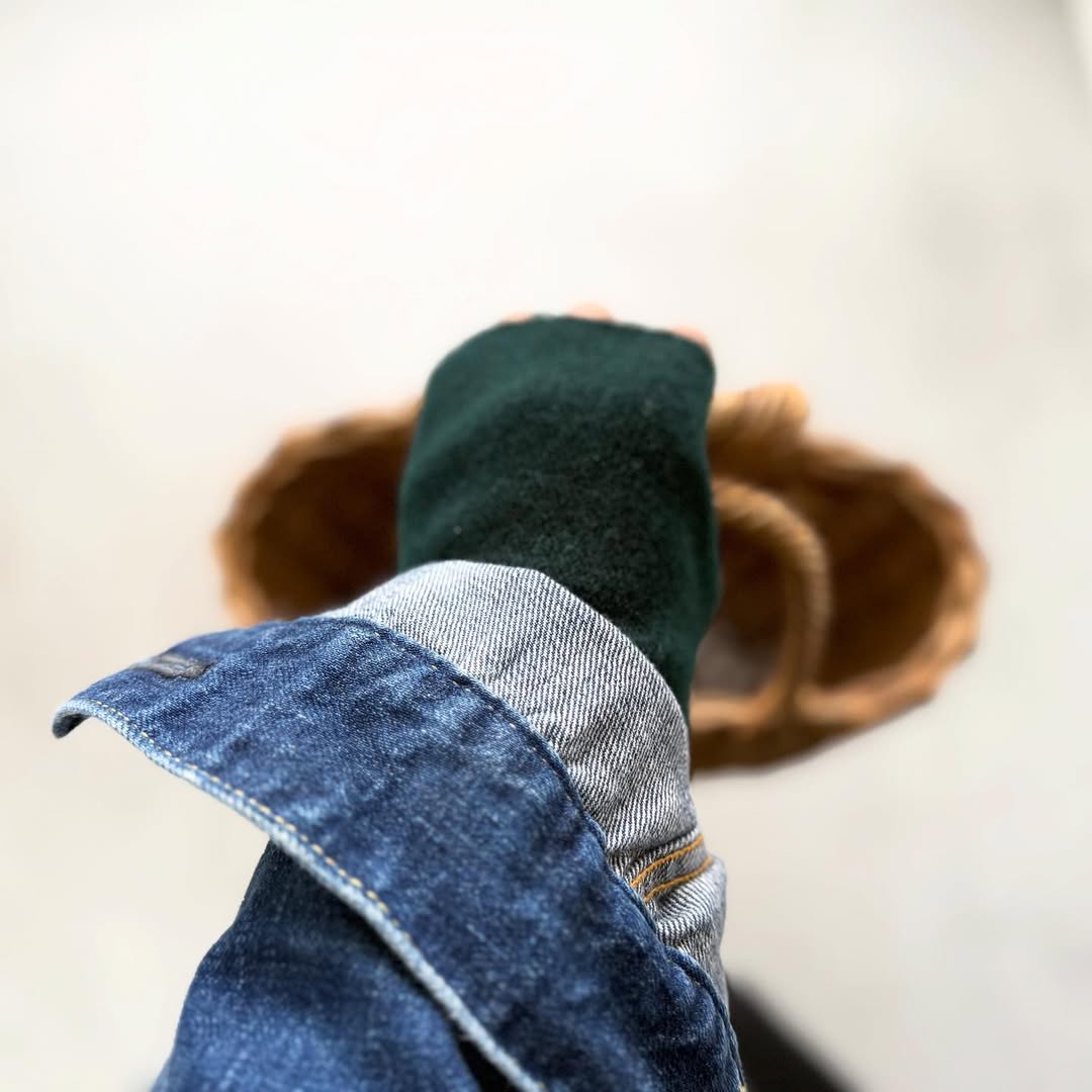 ジャケットから覗かせて袖口の色遊びを。親指を出す穴もあります。