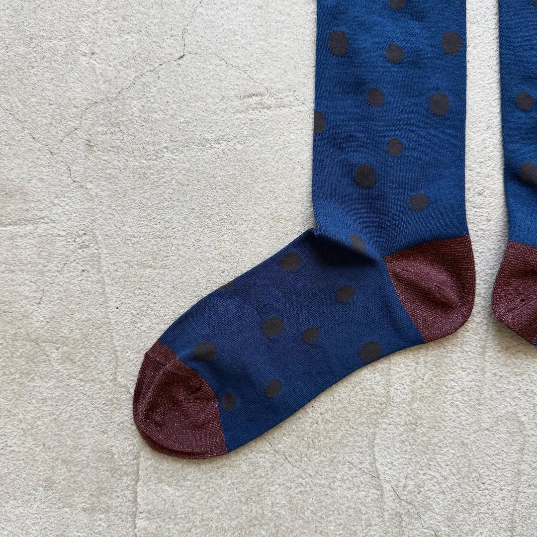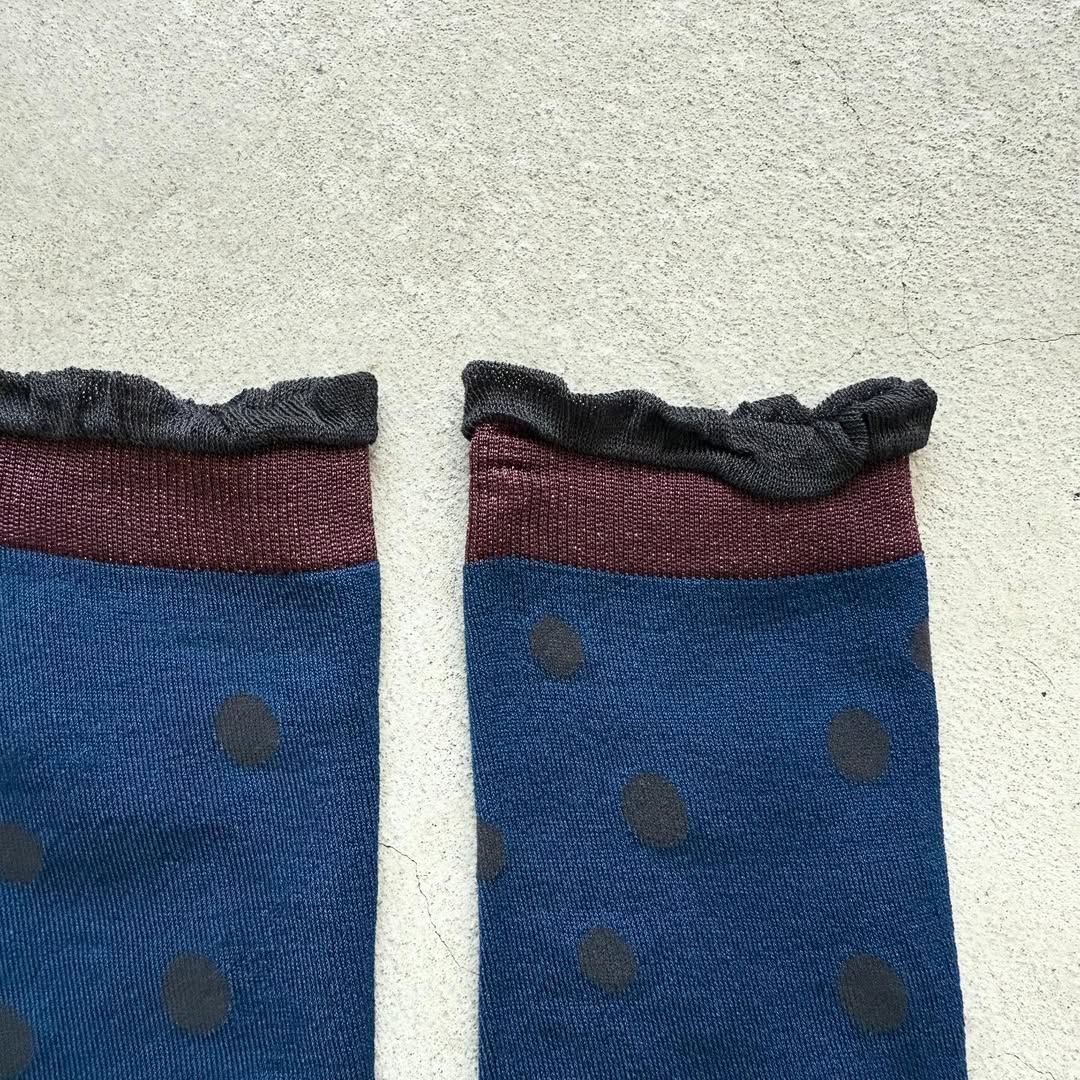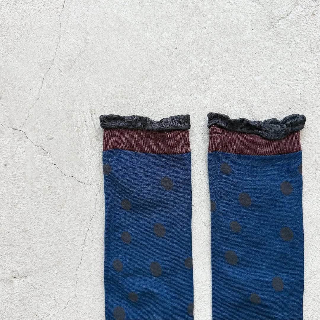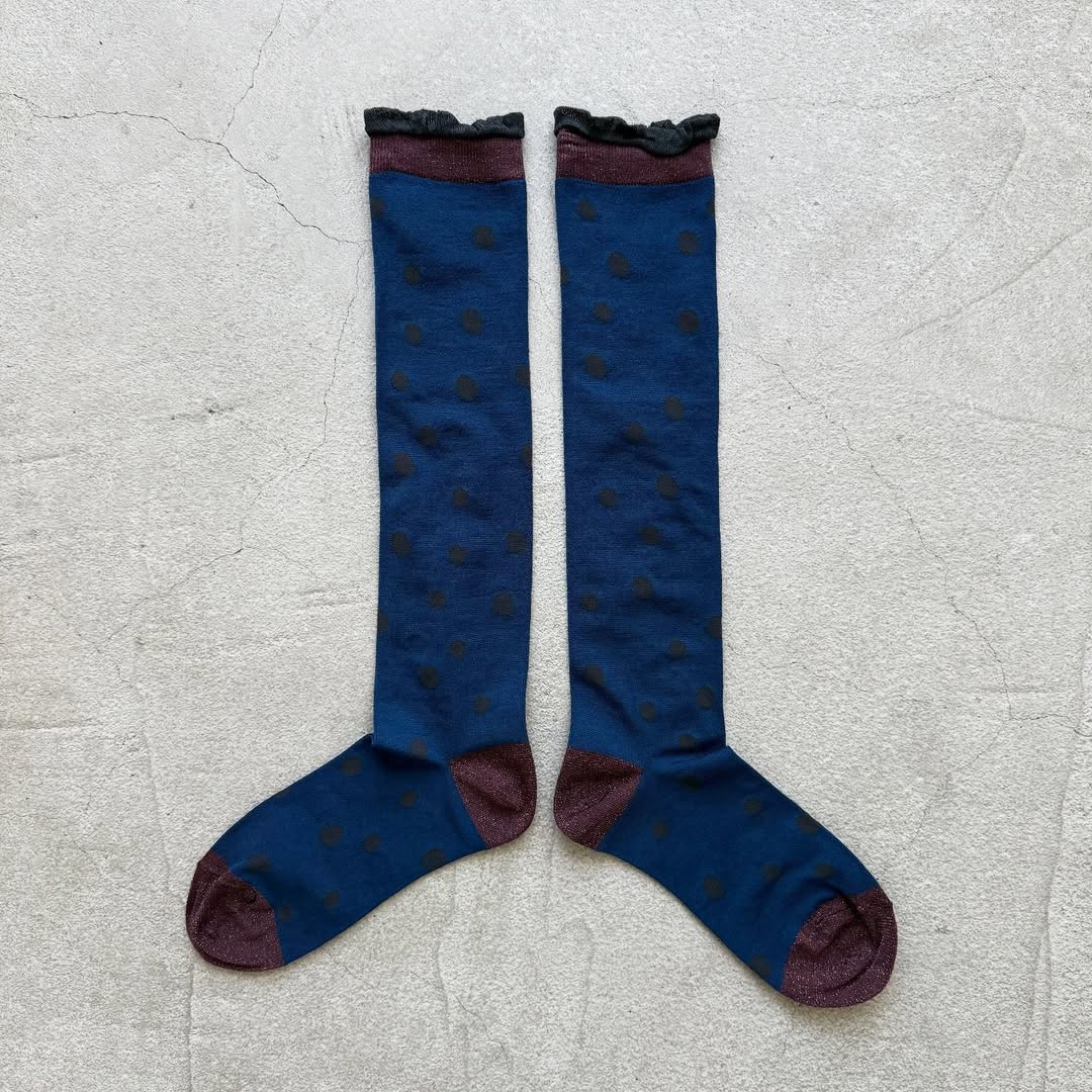 水玉柄が不規則に散りばめられたハイソックス。ポップになり過ぎず大人な印象のミズタマです。