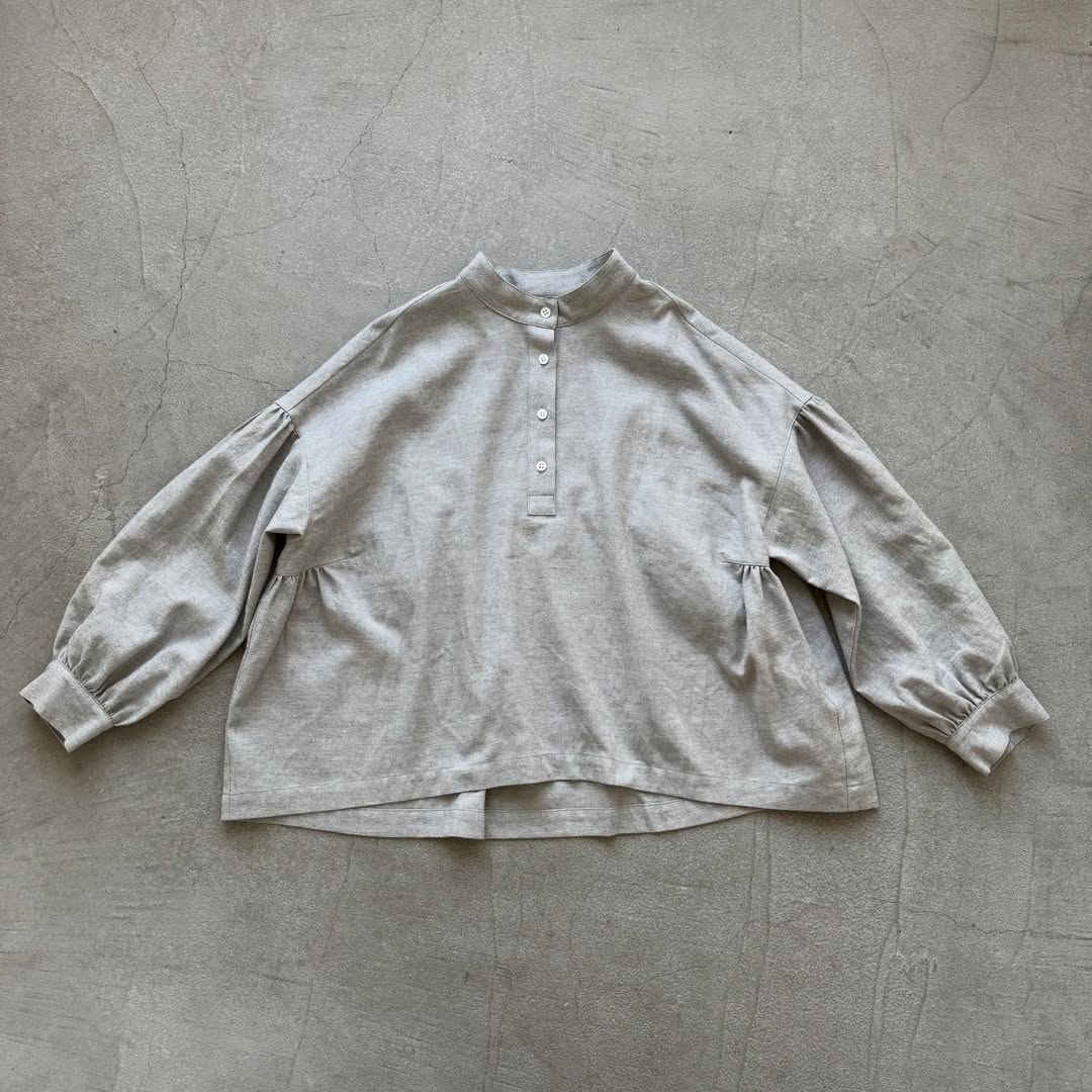 ふんわり袖とスタンドカラーが印象的なブラウス。