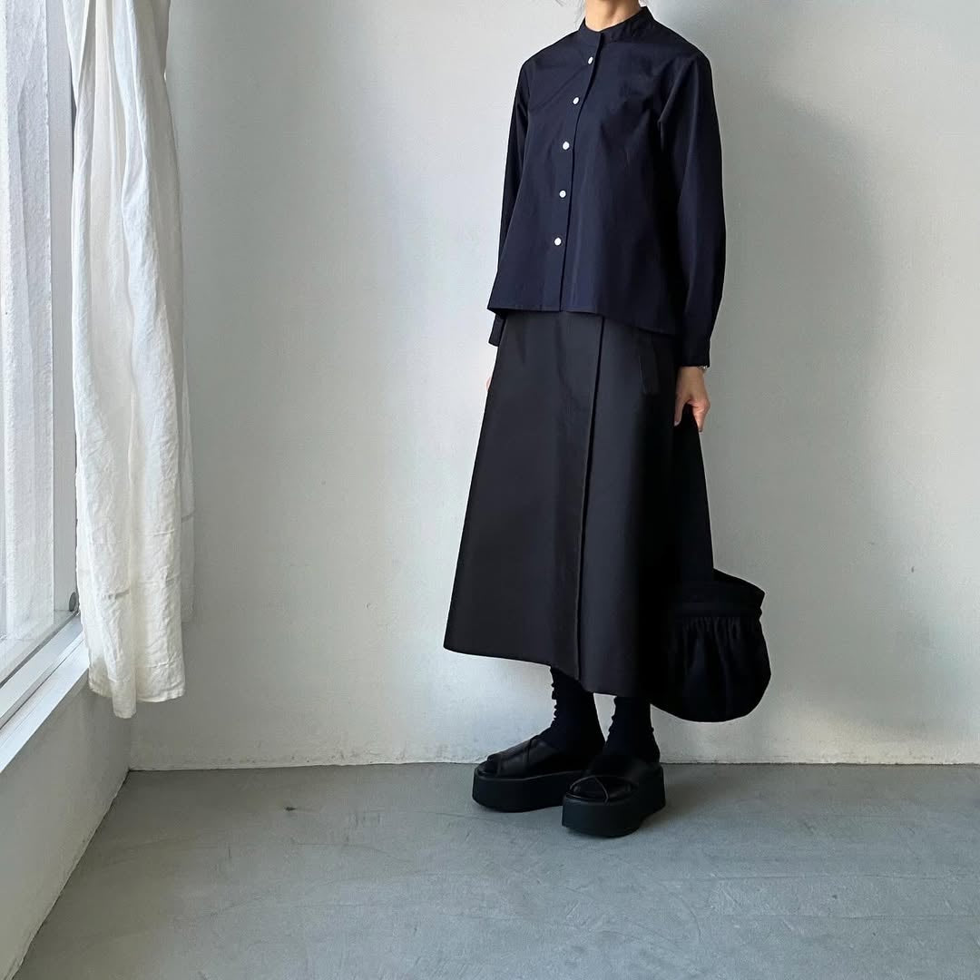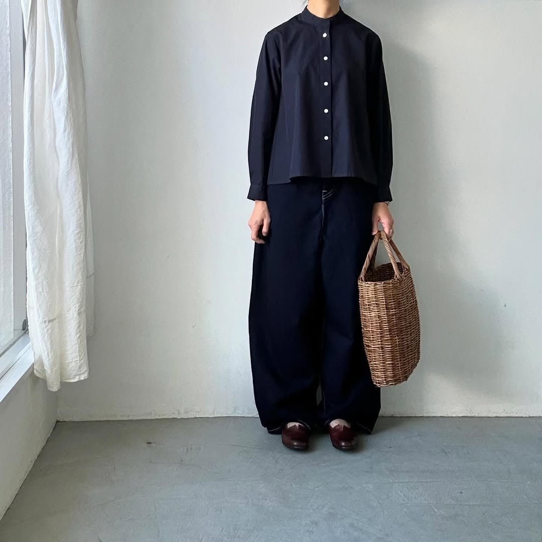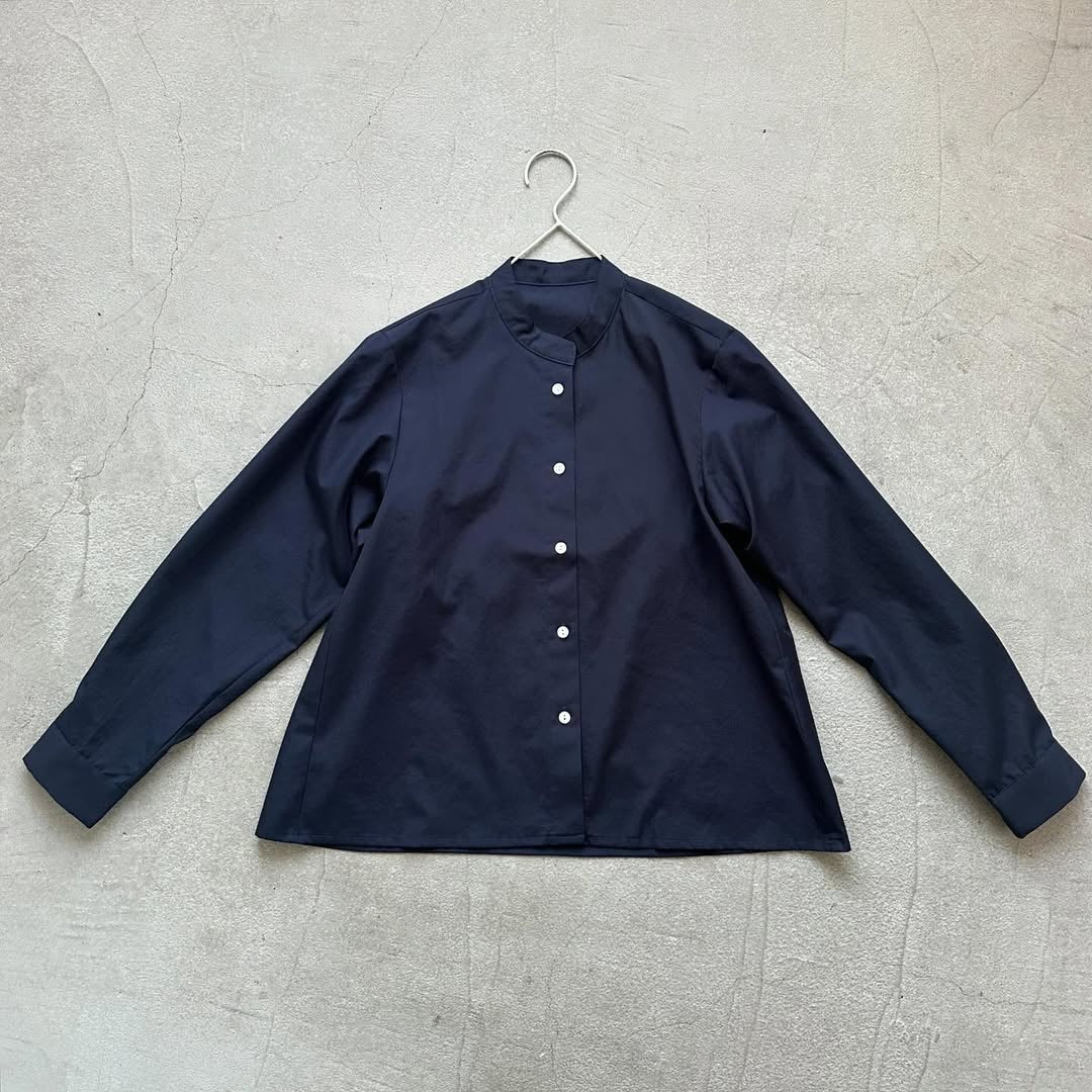 普通のブラウスかな?と袖を通しましたが着用した時の形の綺麗さに驚きました。肩に綺麗に収まりほのかにAライン。短め丈でボトムインしなくてもスタイル良くバランスが取れます。