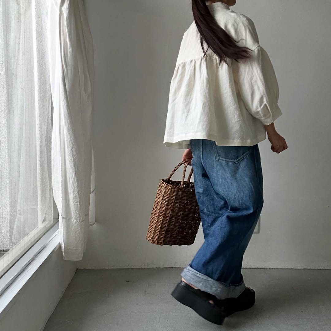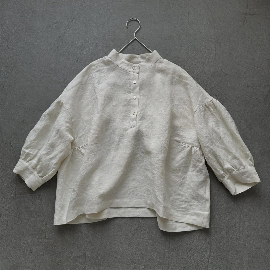 ふんわり袖とスタンドカラーが印象的なブラウス。