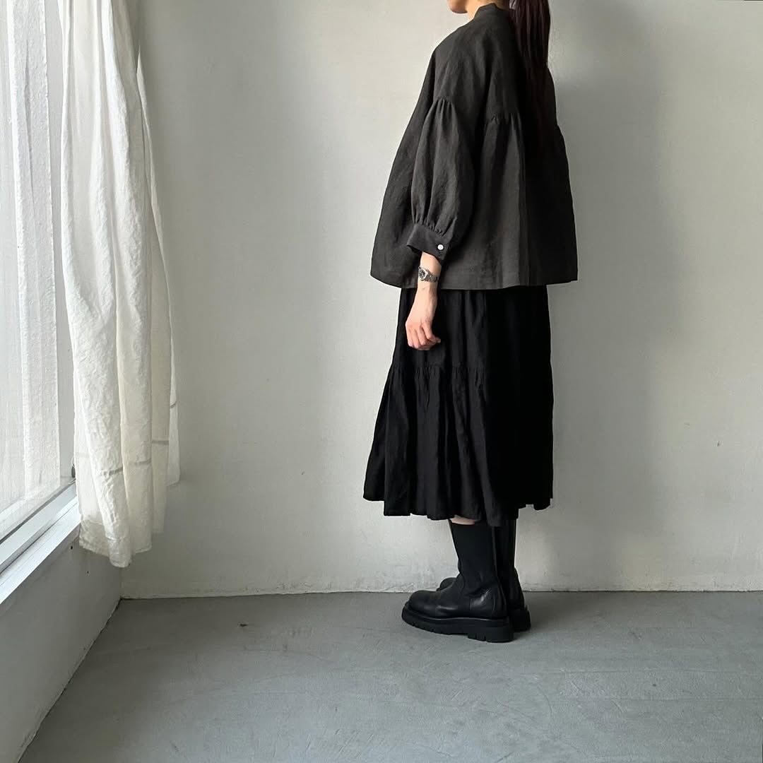 ふんわり袖とスタンドカラーが印象的なブラウス。
