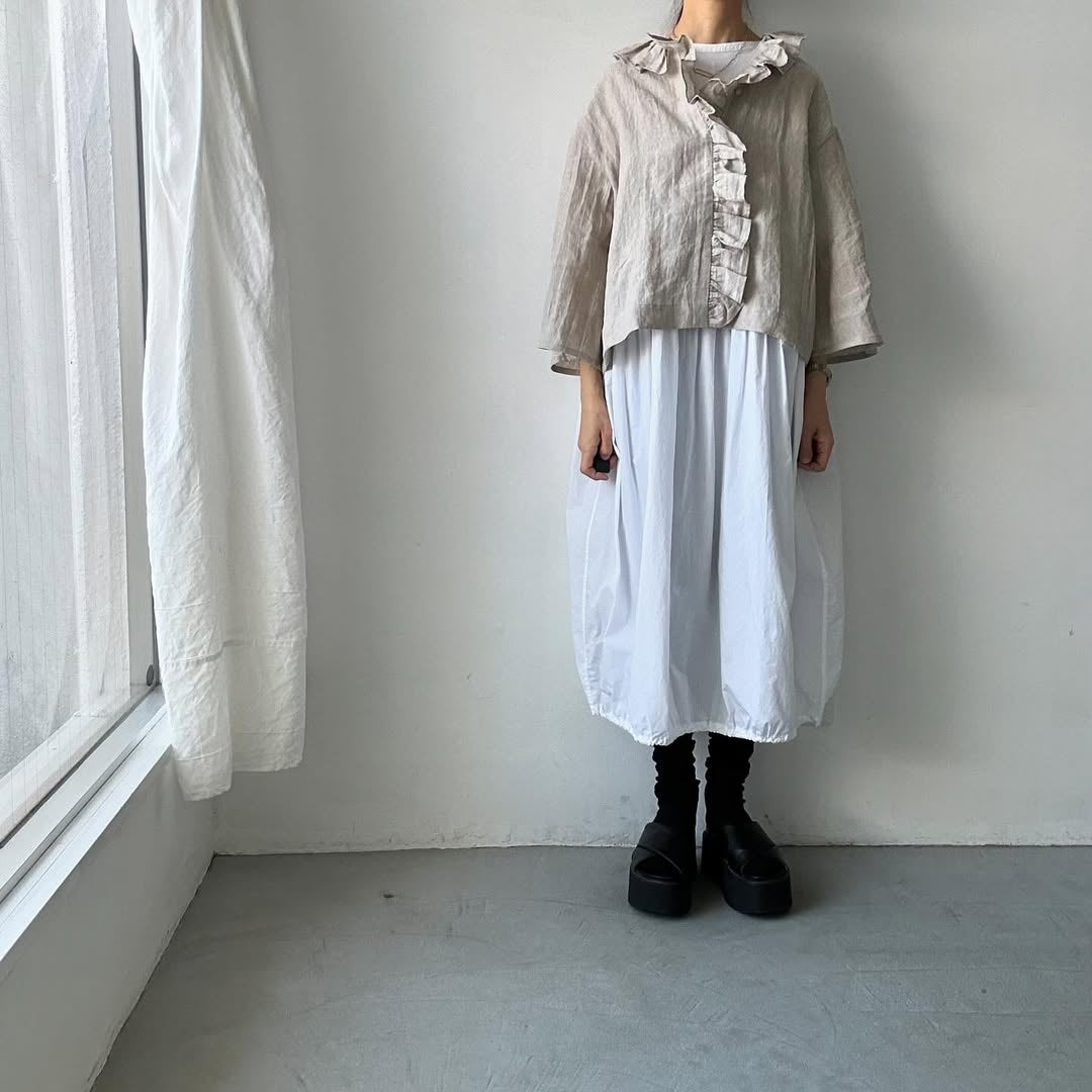 風合い豊かな薄めのコルトレイクリネンのボレロみたいなブラウス。やや短め丈でボトムインしなくてもバランスよく着られます。身幅ゆったり、袖はゆったりで真夏にも涼しく着られます。
