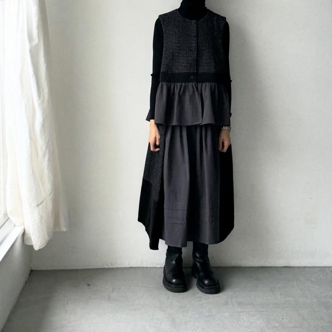 ピンドットウール生地、風合い豊かな柔らかなコットン、細畝コーデュロイの3種を組み合わせて作られたベスト、