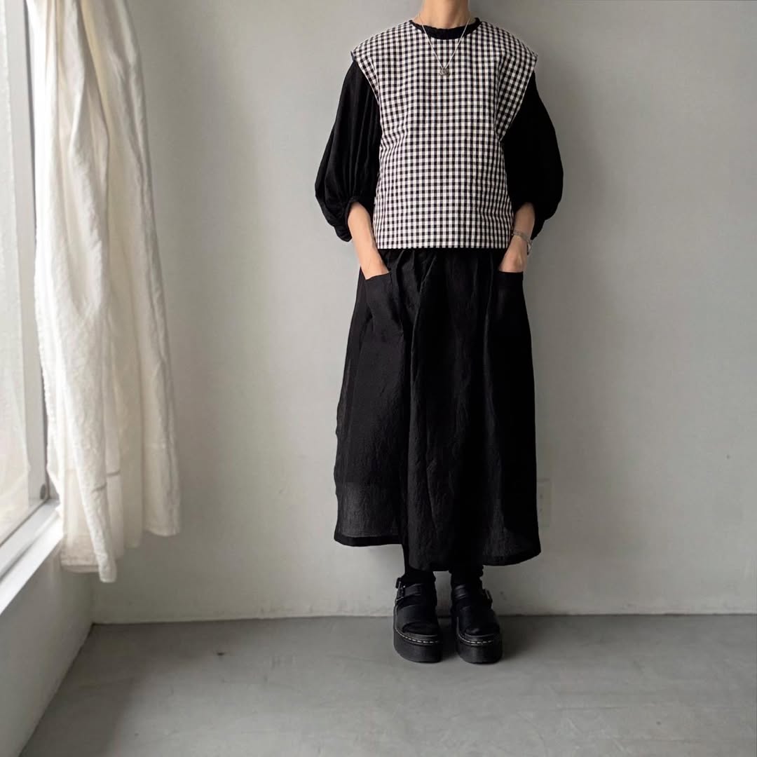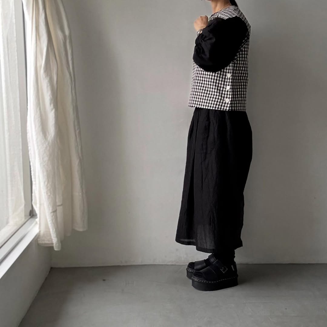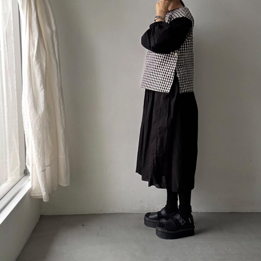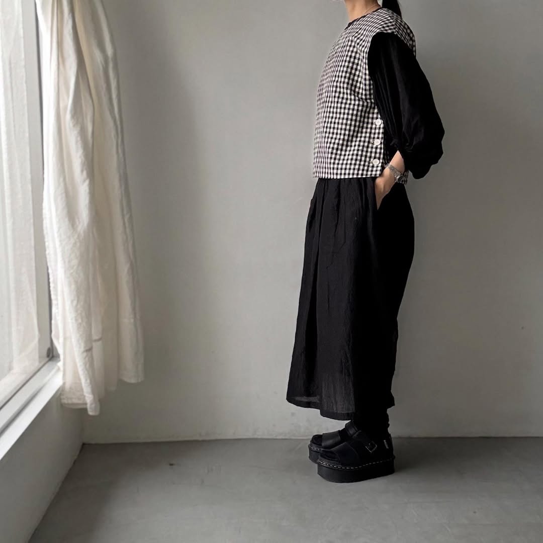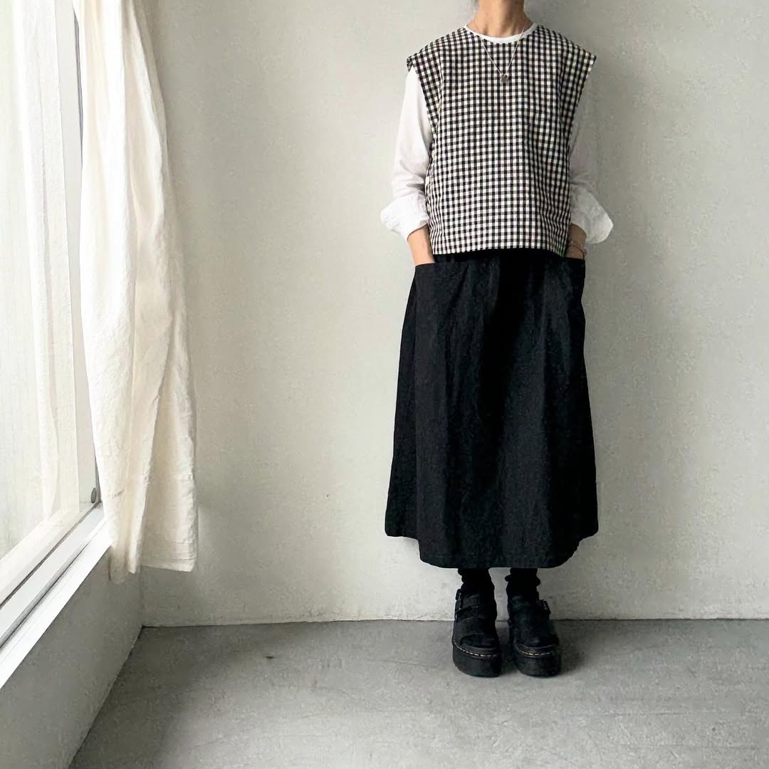 短め丈でゆるやかなAライン。スカートにもパンツにもコーディネートしやすいベストです。