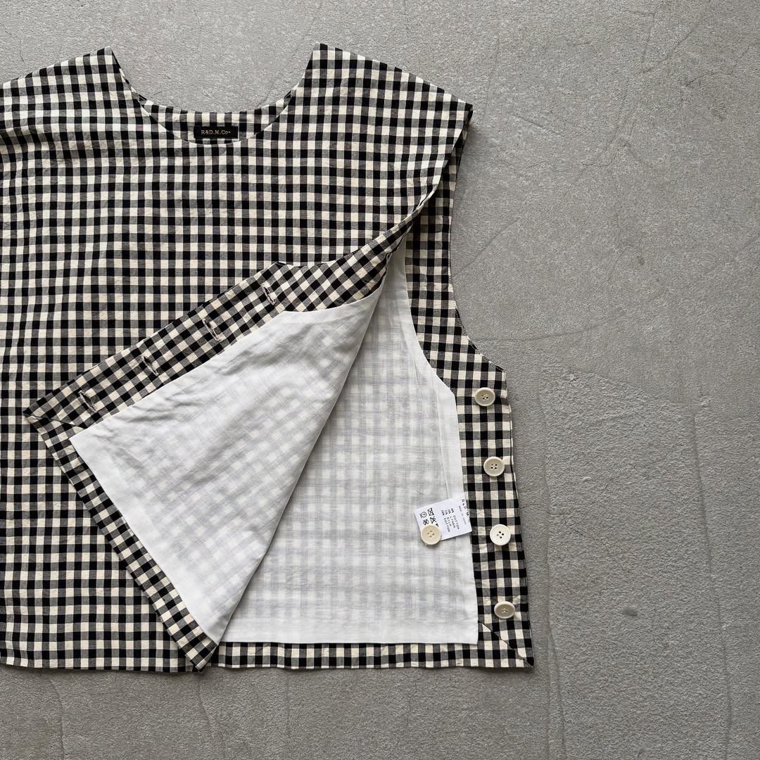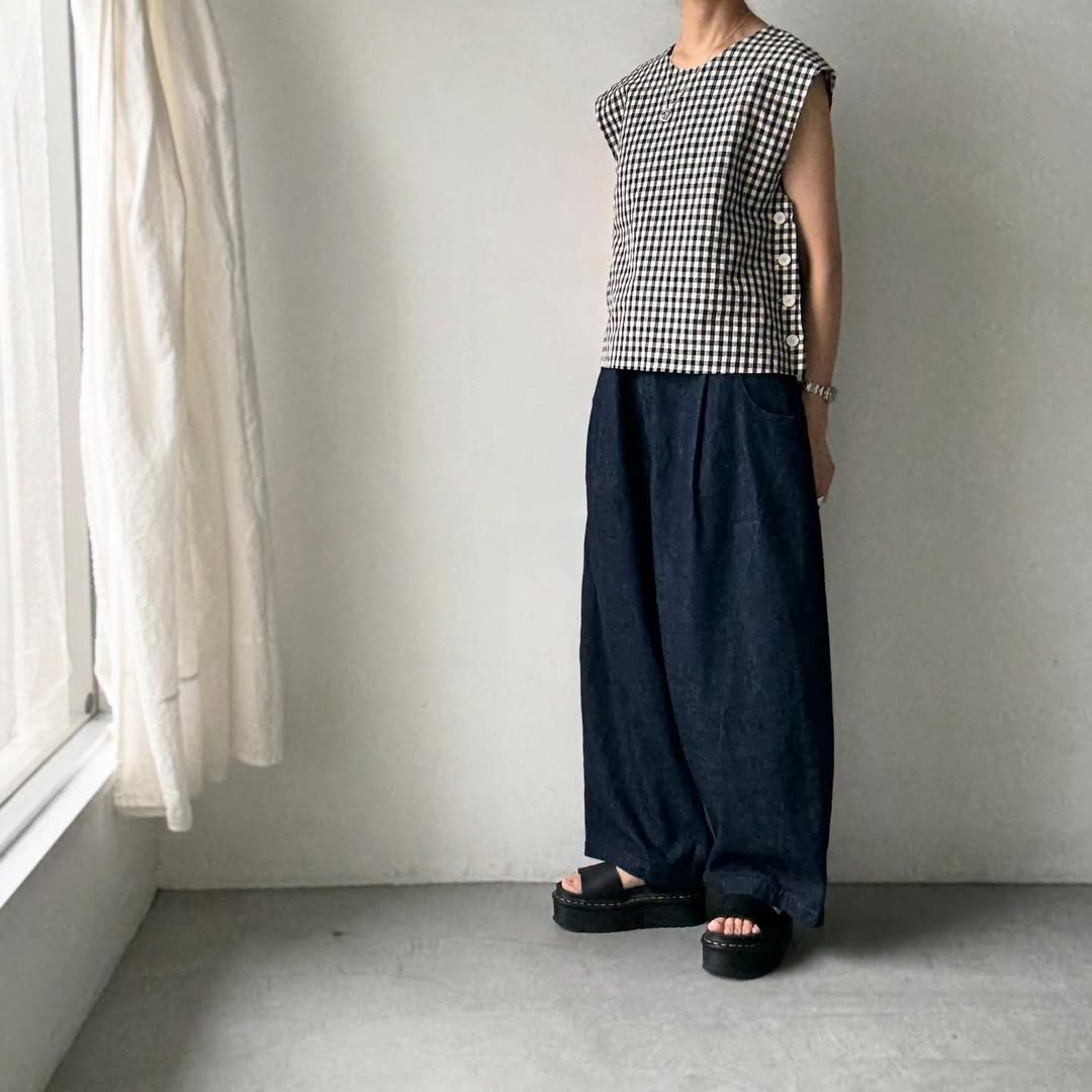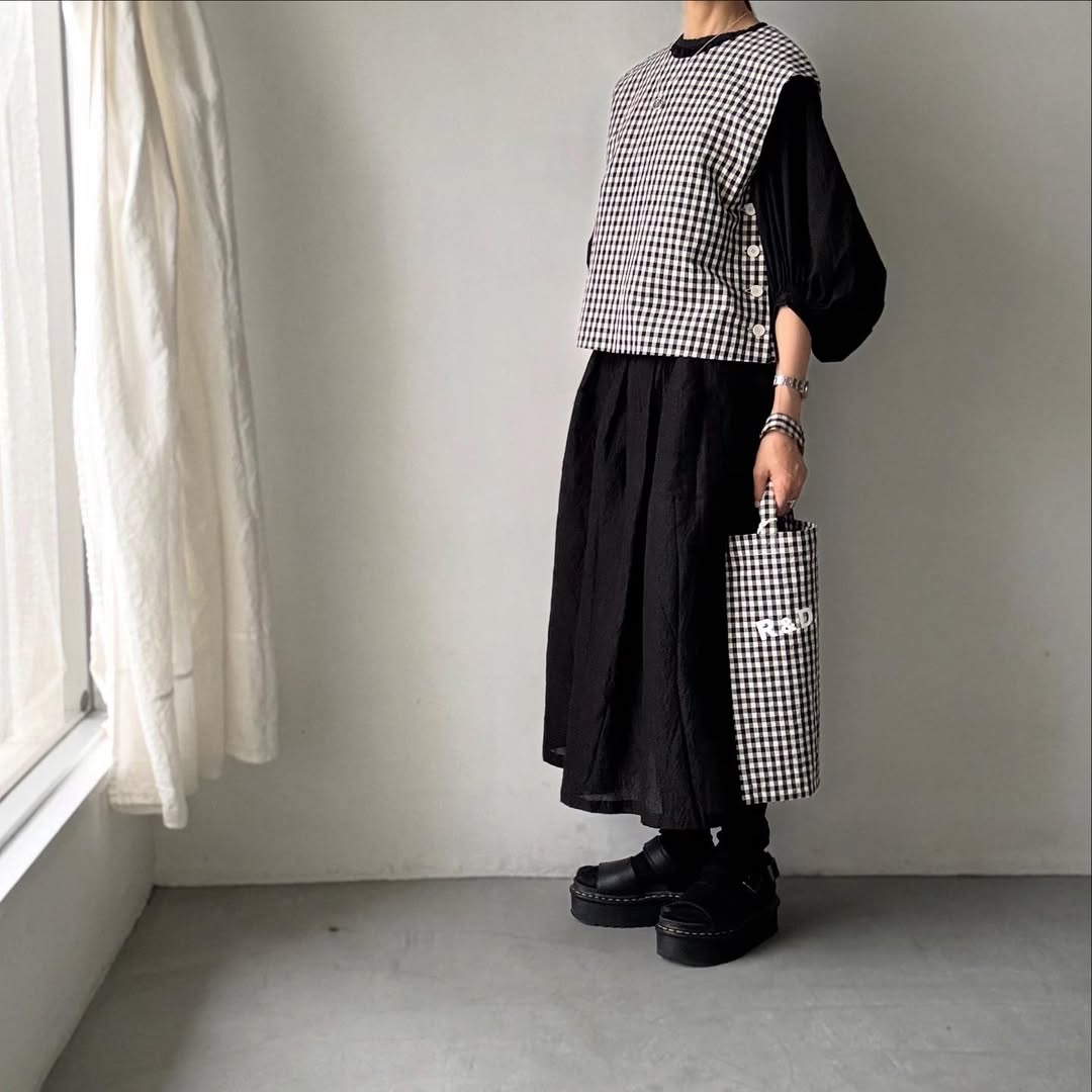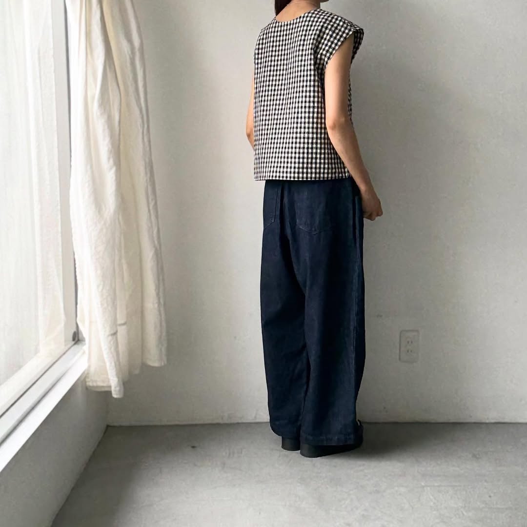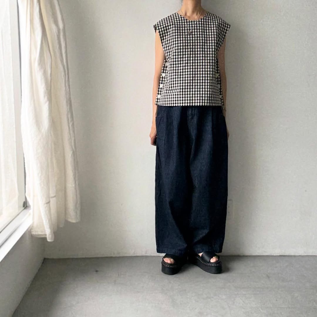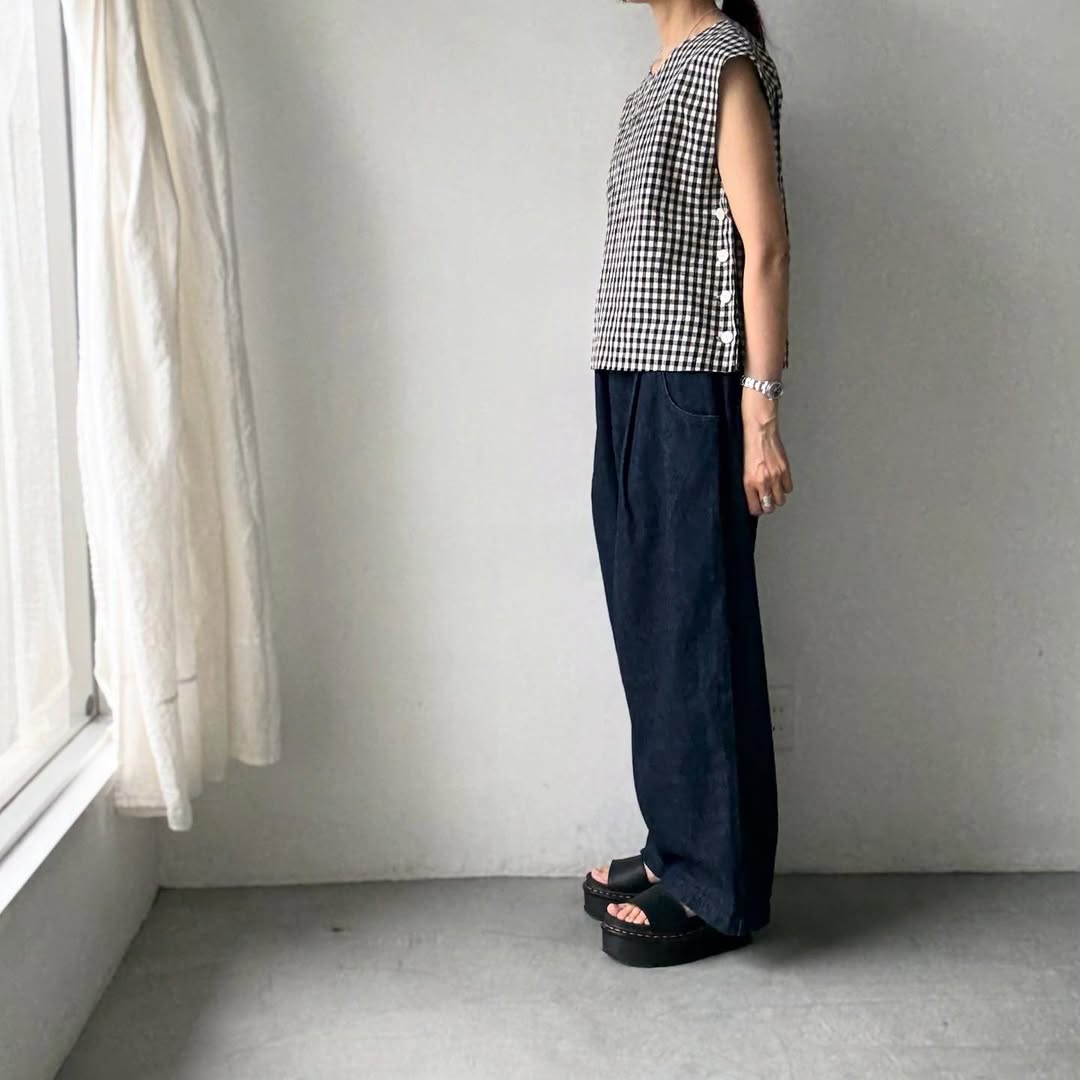 短め丈でゆるやかなAライン。スカートにもパンツにもコーディネートしやすいベストです。