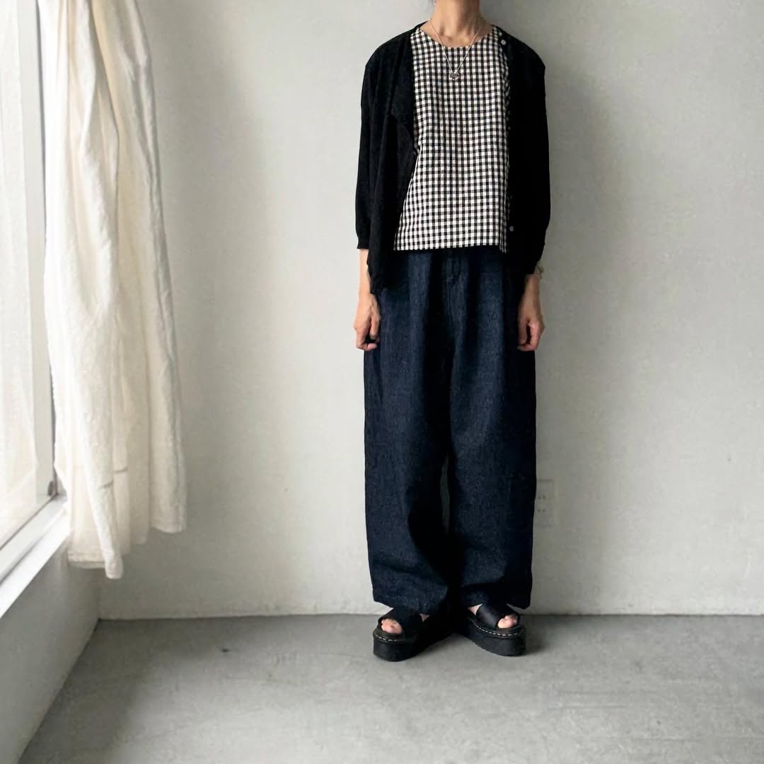 全部閉じて着るのがスタンダードスタイルですが、ふんわりワンピースと合わせる際には一番上だけ留めたりも。