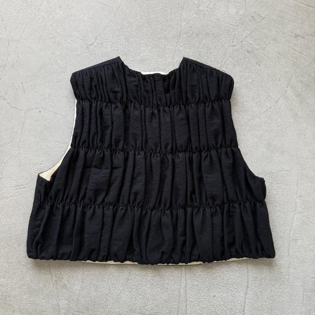 風合いの良いコットンウール素材のシャーリングベスト。裏地はコットンです。