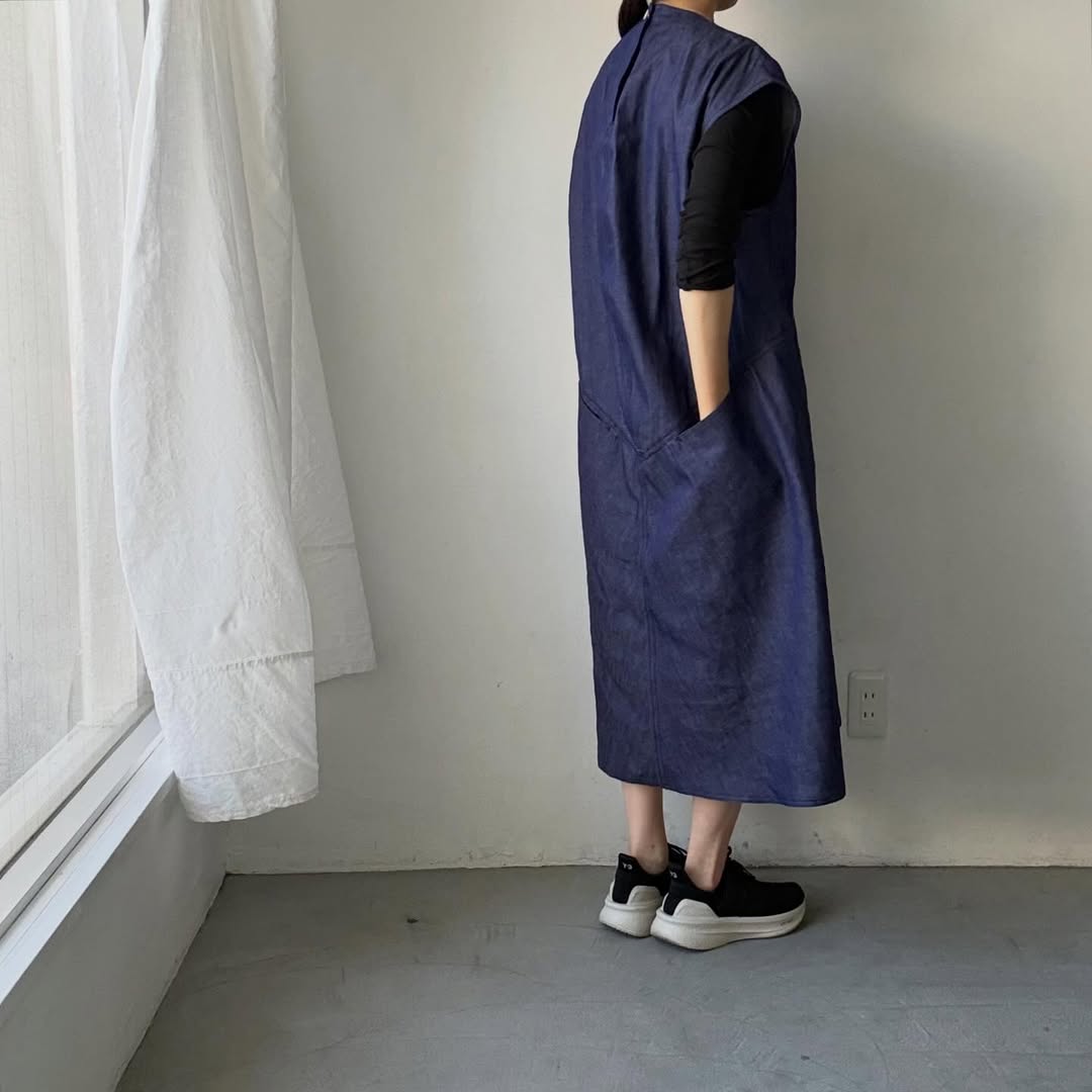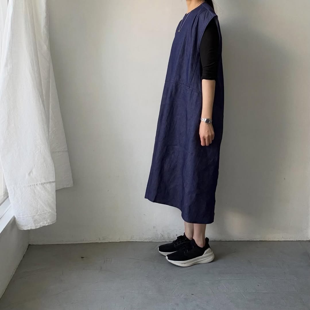 脇はゆったりの開きなのでジャンパースカートやエプロンドレスみたいに使えます。中にTシャツやブラウスを。