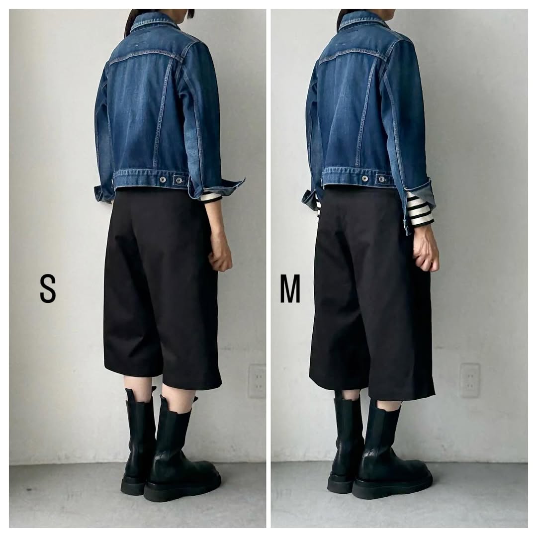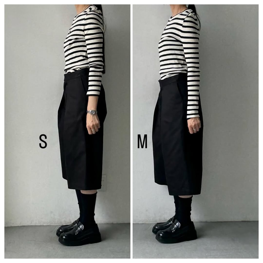Sはジャストウエストに近い位置、Mは落ちた位置(腰)で穿いています。実寸脇丈は2センチの差ですが、腰に落ちている分、Mは Sよりかなり長く見えています。