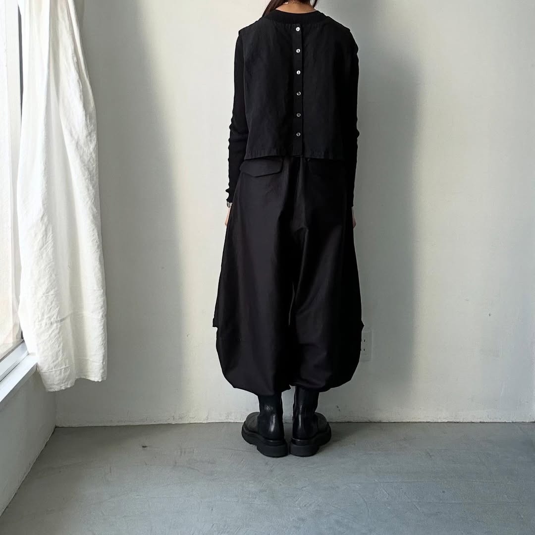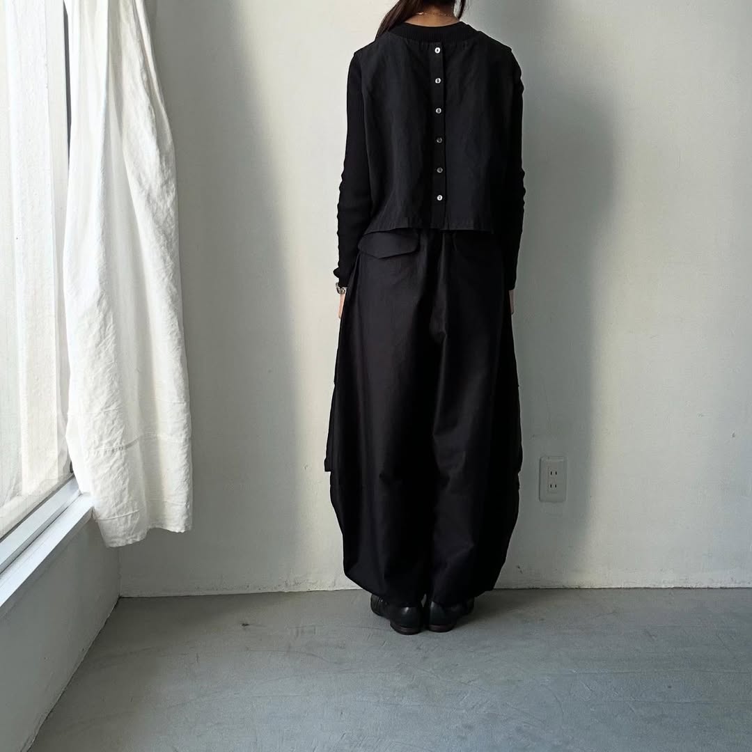 樽型シルエットです。ウエストからなだらかに膨らんで裾に向けてゆるやかにテーパードしています。