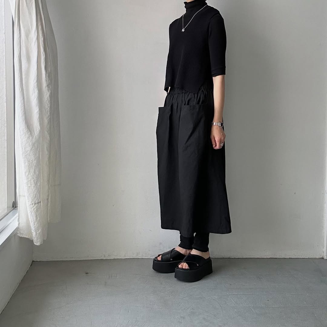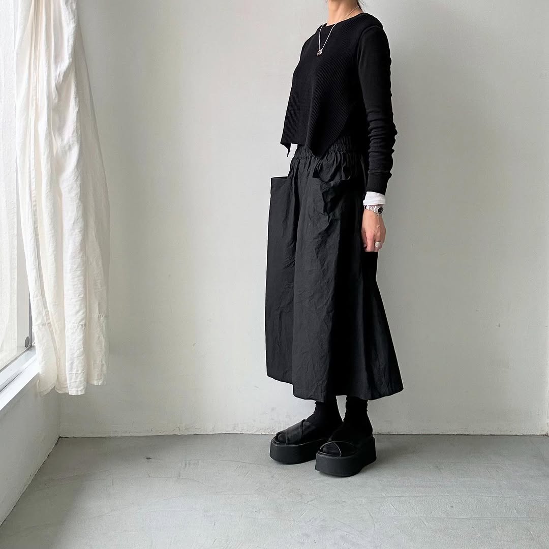 こちらはブラック。合わせる色を問いませんが、ブラックonブラックコーデもおすすめ。同じ色でもワッフルの素材感が際立ちます。